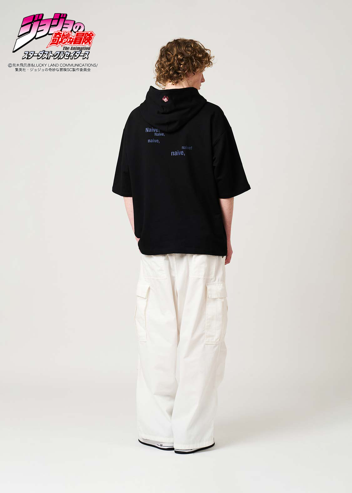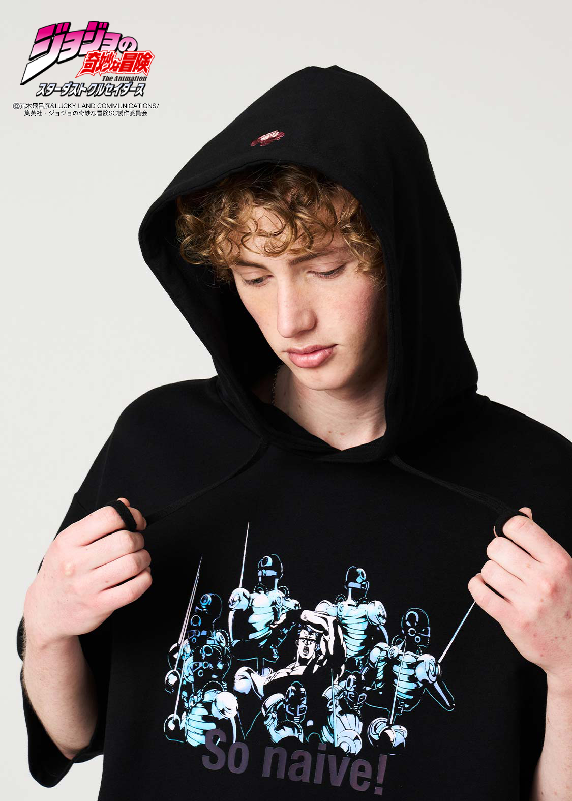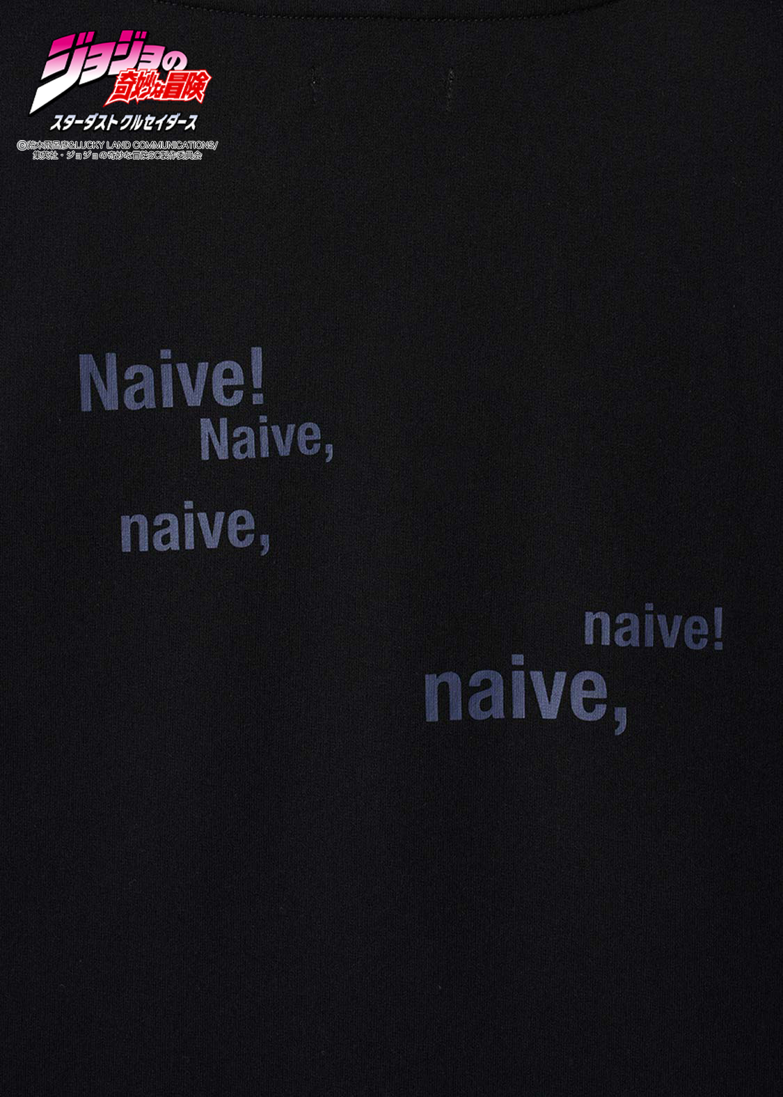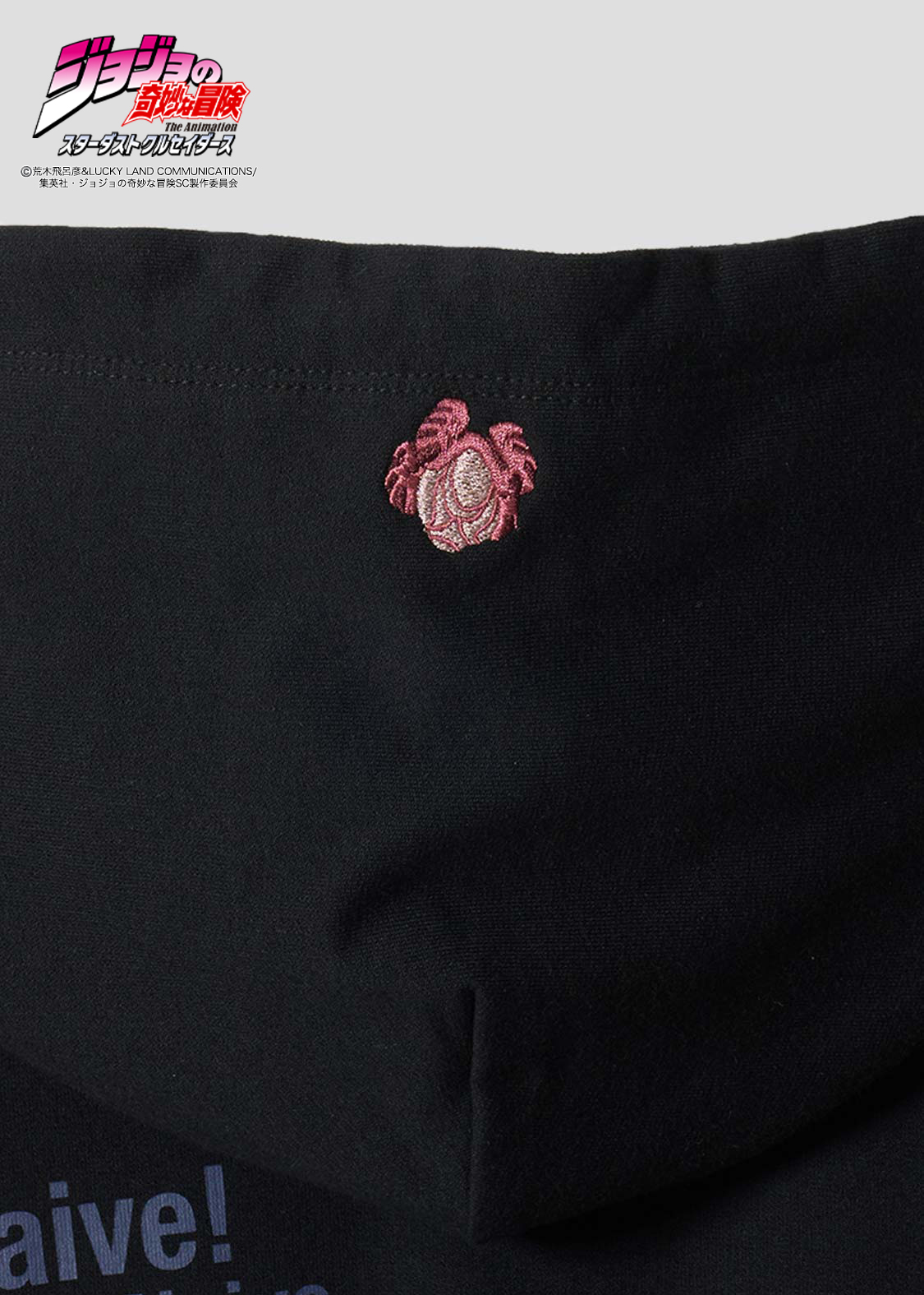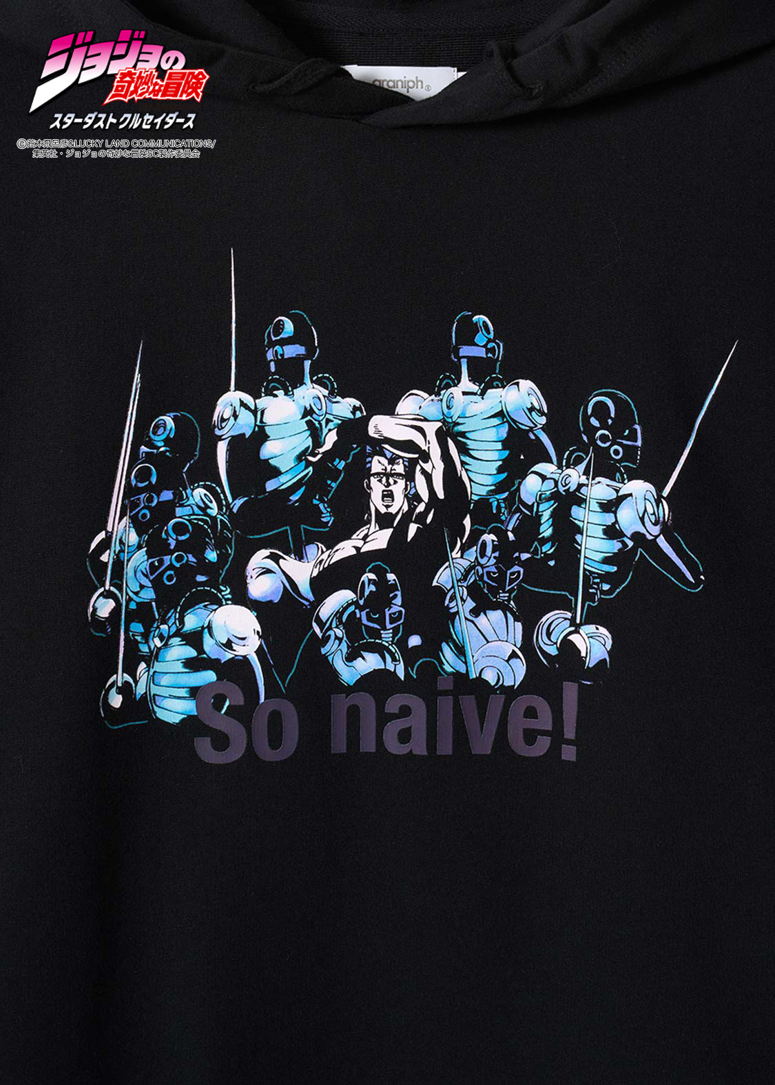 アニメ『ジョジョの奇妙な冒険 スターダストクルセイダース』より。ポルナレフを中心にして、スタンド「シルバーチャリオッツ」の残像が囲むデザイン。ポルナレフの「甘い甘い・・・」というセリフの英訳をバックプリントで表現しました。さらに、フードには“肉の芽”の刺繍をあしらっています。