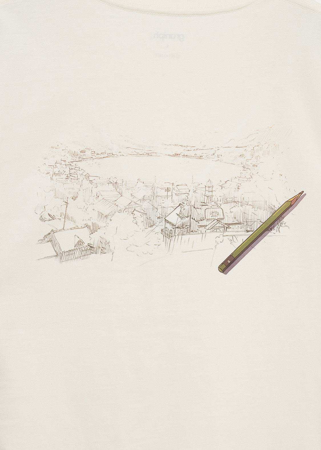 映画『君の名は。』より。山深い田舎町に暮らす女子高校生・三葉と東京で暮らす男子高校生・瀧、出会うはずのない二人が入れ替わることで動き出す運命の物語。三葉を探すために瀧が覚えている糸守の風景をスケッチしたデザイン。ポケットの中には口噛み酒が刺繍されています。
