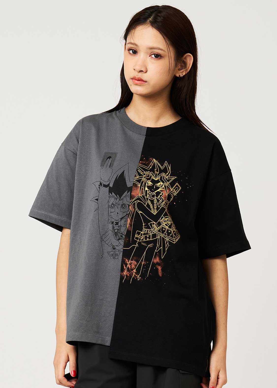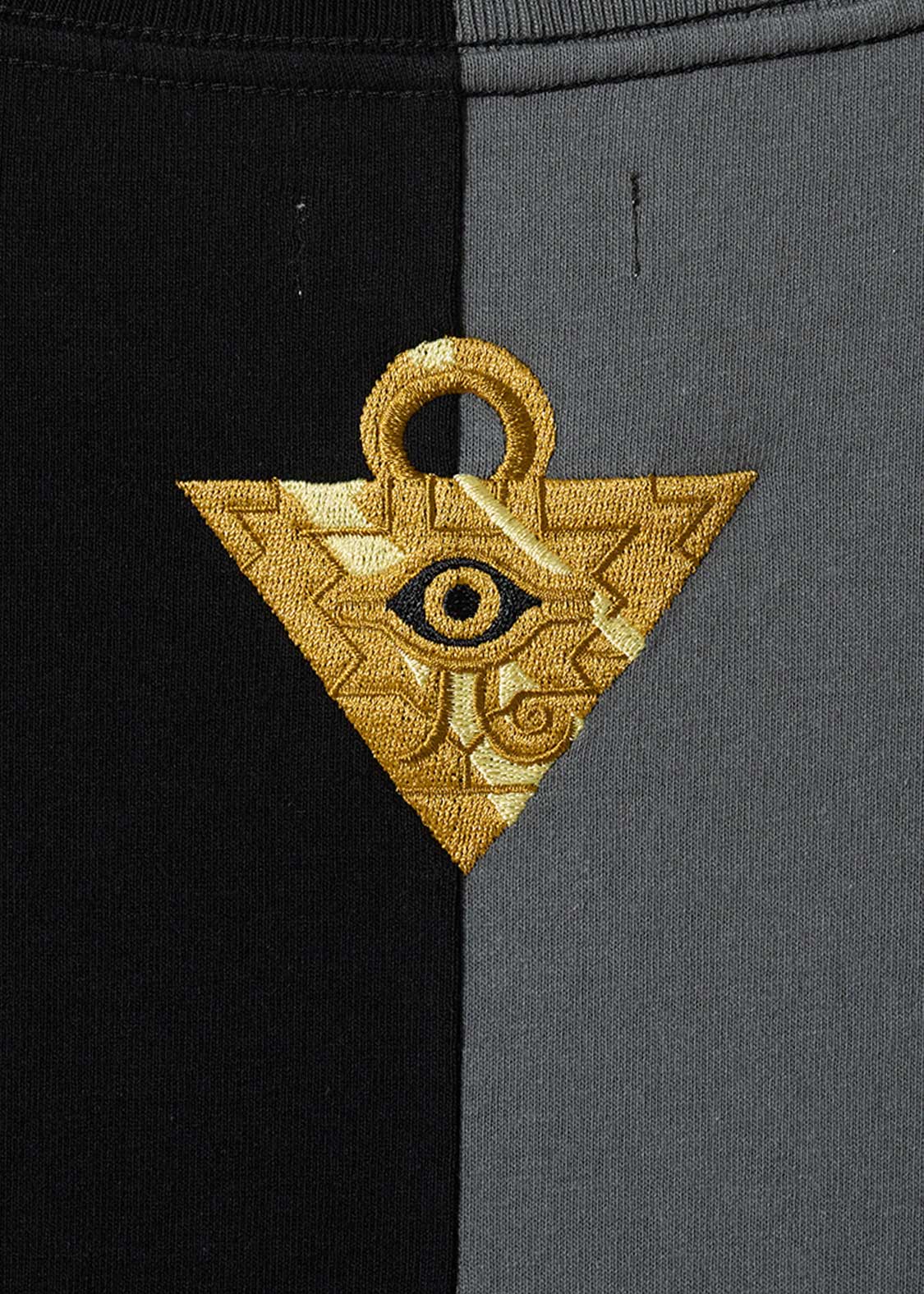 武藤遊戯とその中にいるもう1人の遊戯を生地の切り替えを使って表現したユニークなデザイン。バックには2人を繋ぐきっかけとなった「千年パズル」が刺繍されています。