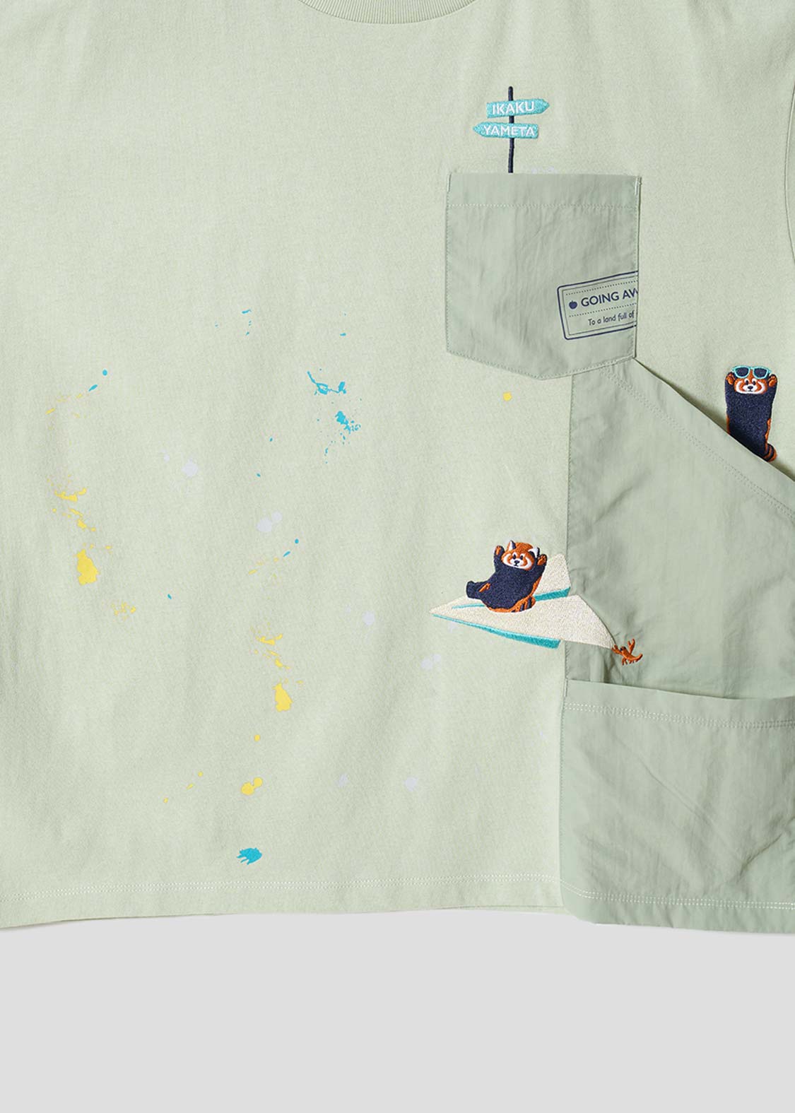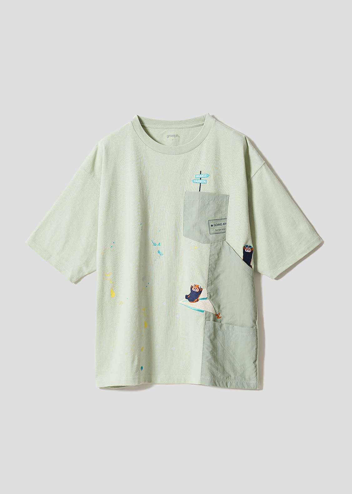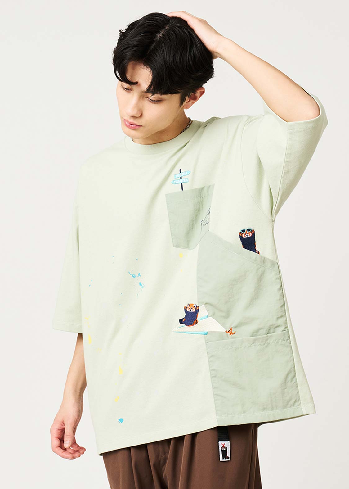 ・ナイロンワッシャー生地を使用したポケットや、ペイントが飛び散ったようなデザインがアクセントになっています。