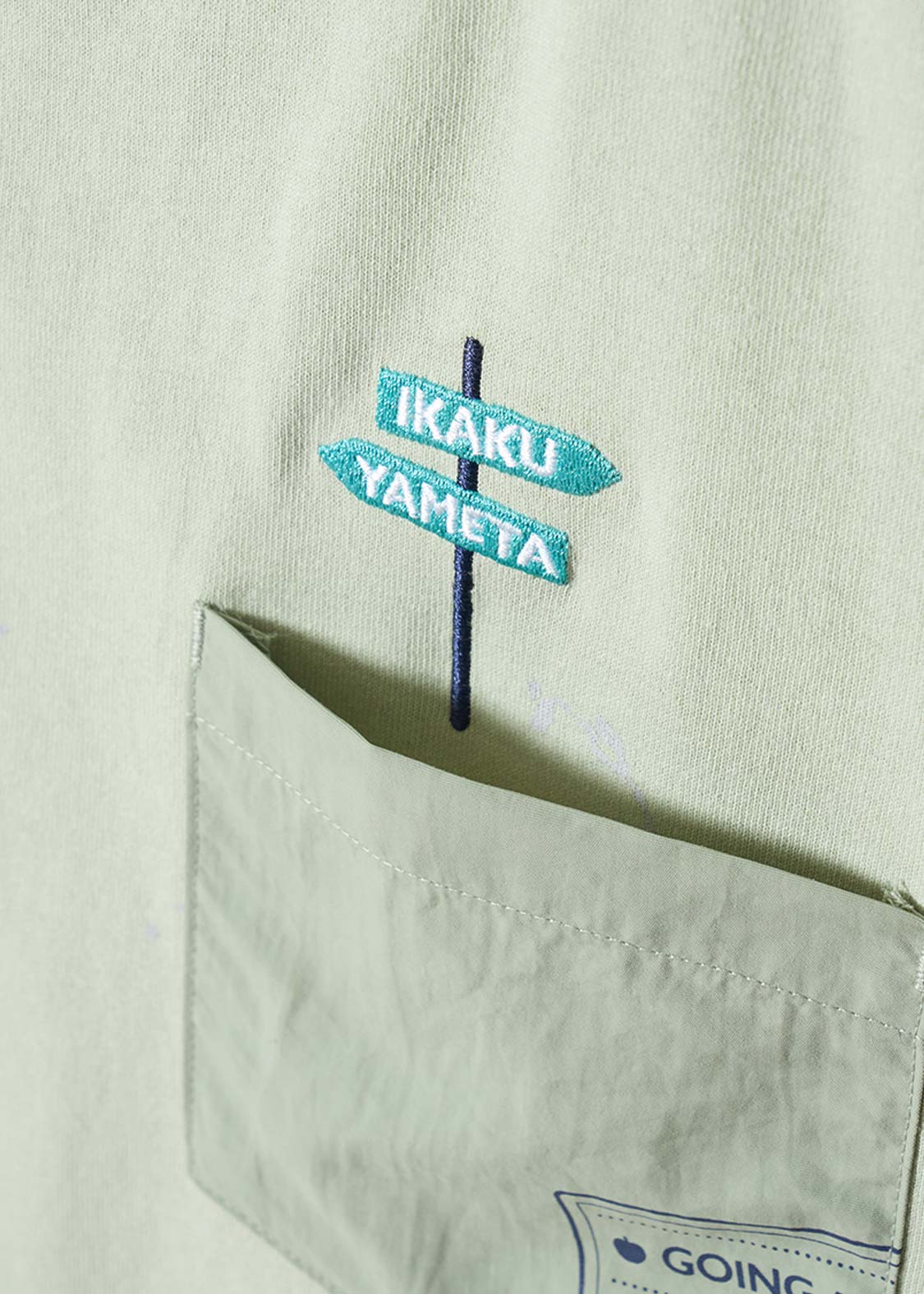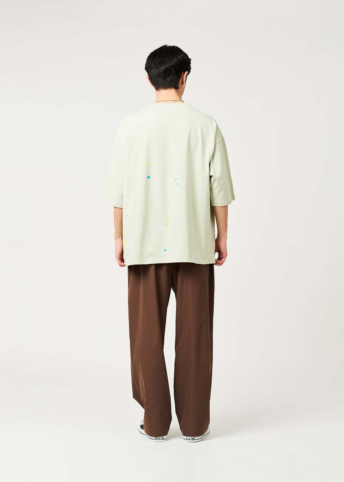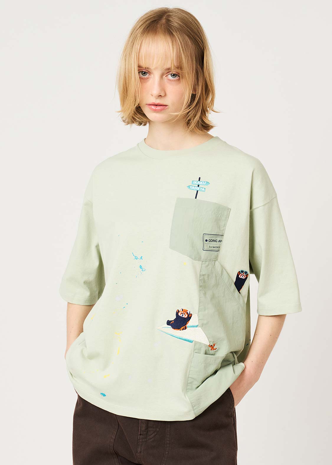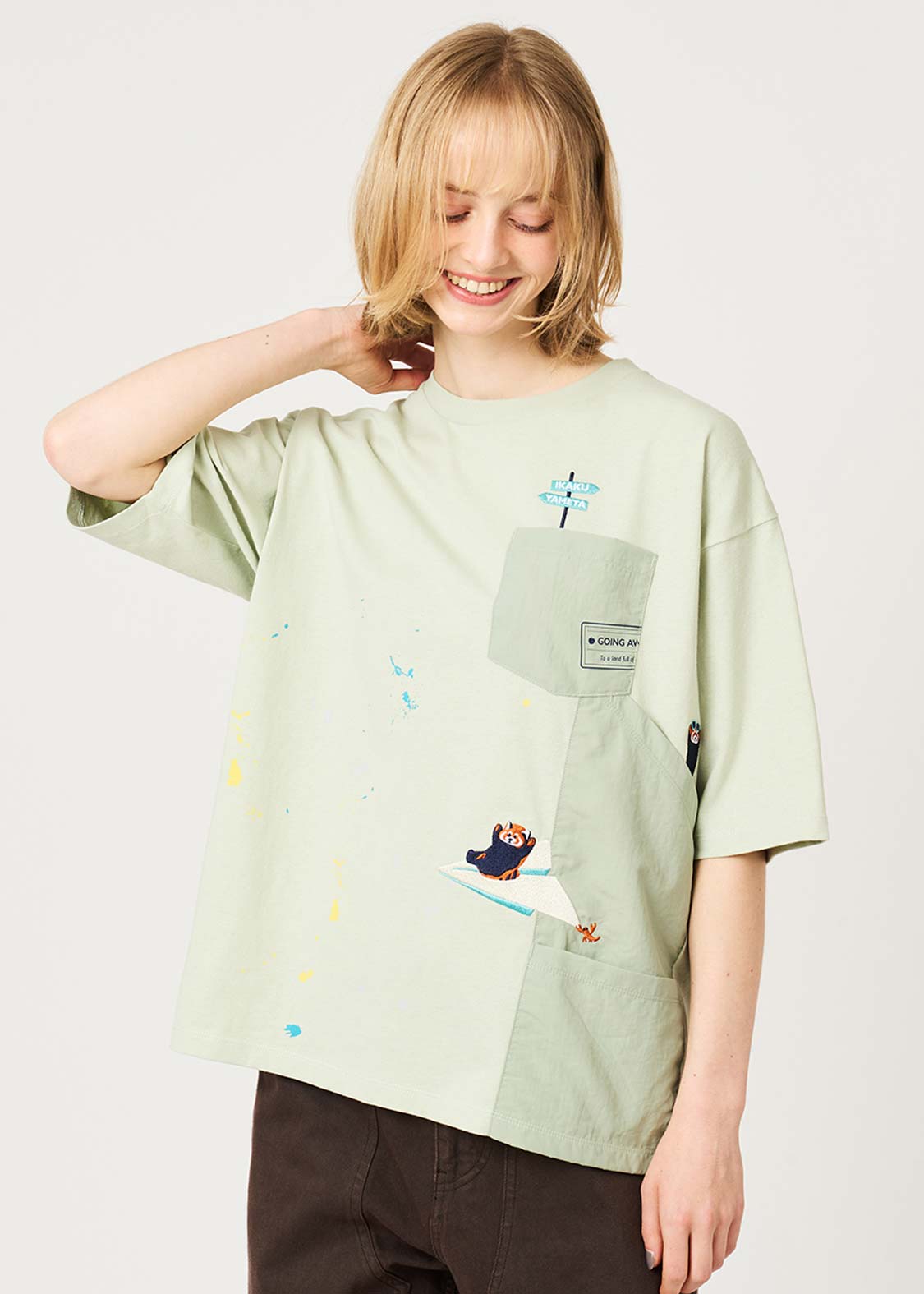 ・ナイロンワッシャー生地を使用したポケットや、ペイントが飛び散ったようなデザインがアクセントになっています。