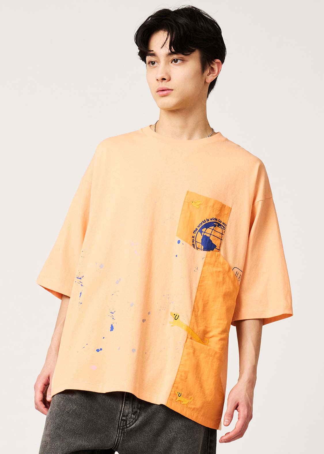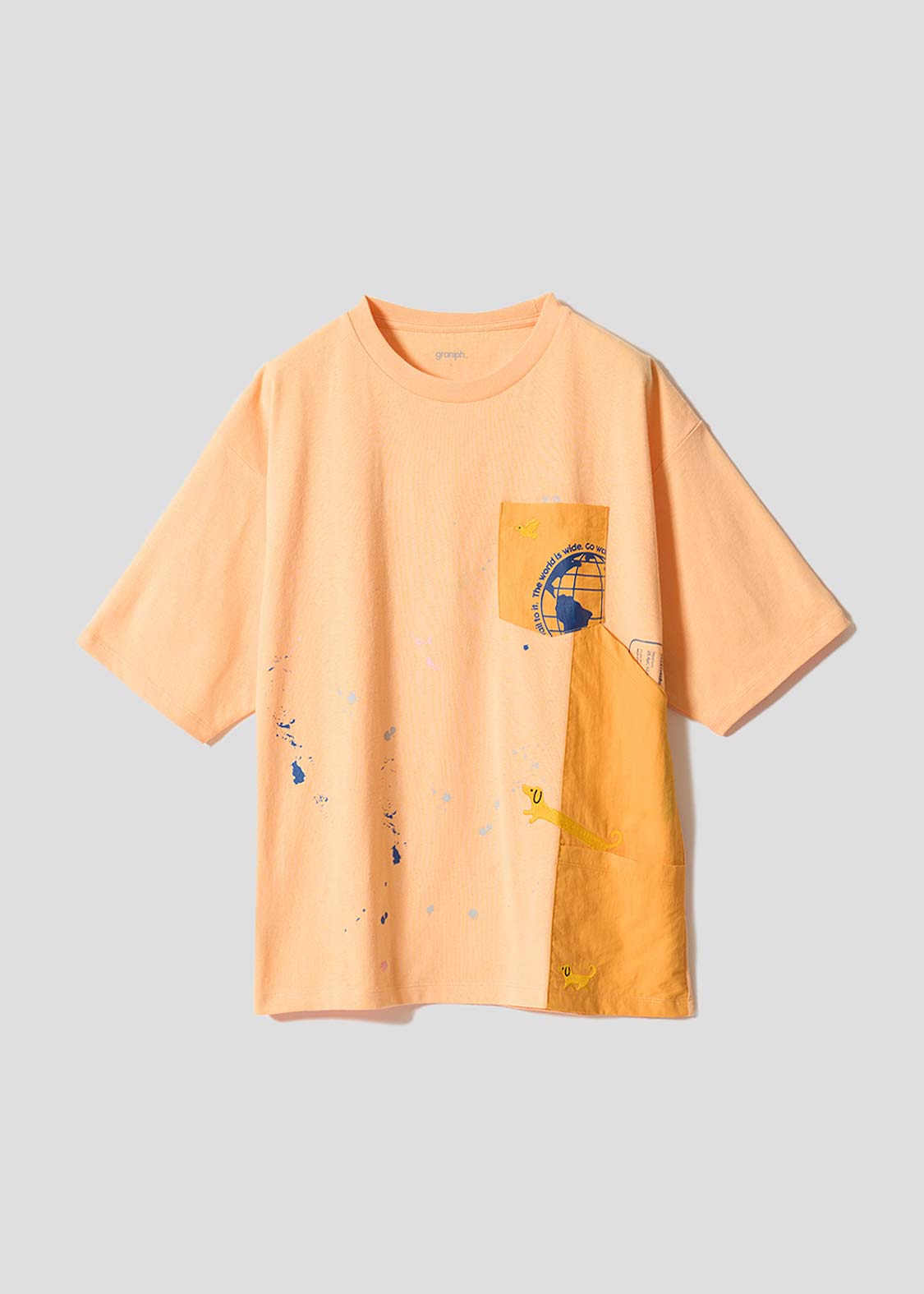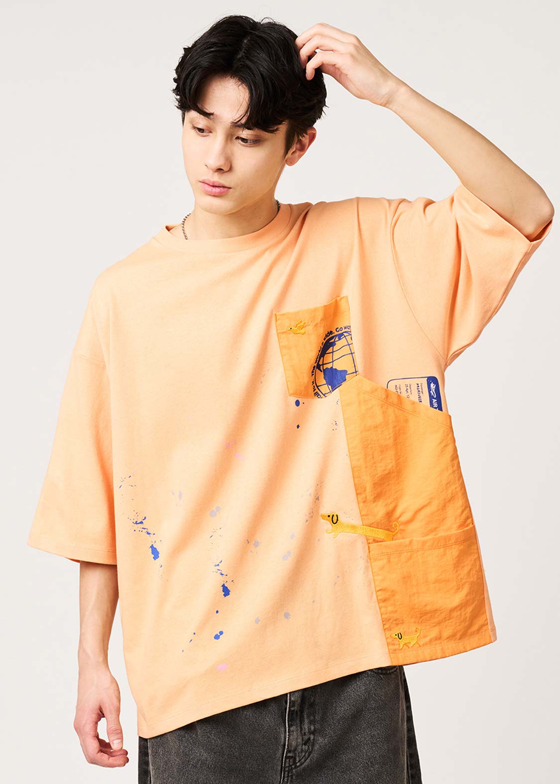 ・ナイロンワッシャー生地を使用したポケットや、ペイントが飛び散ったようなデザインがアクセントになっています。