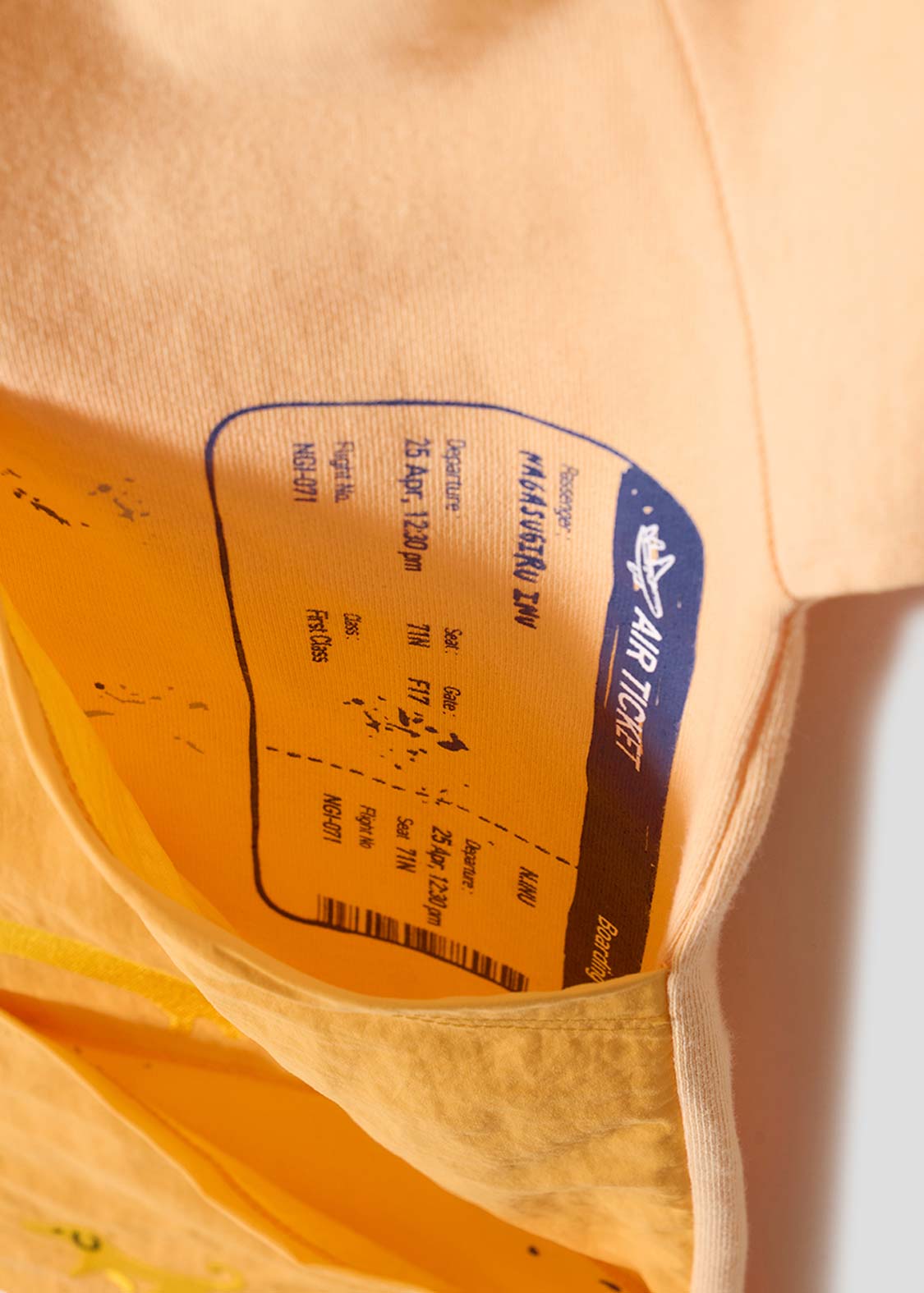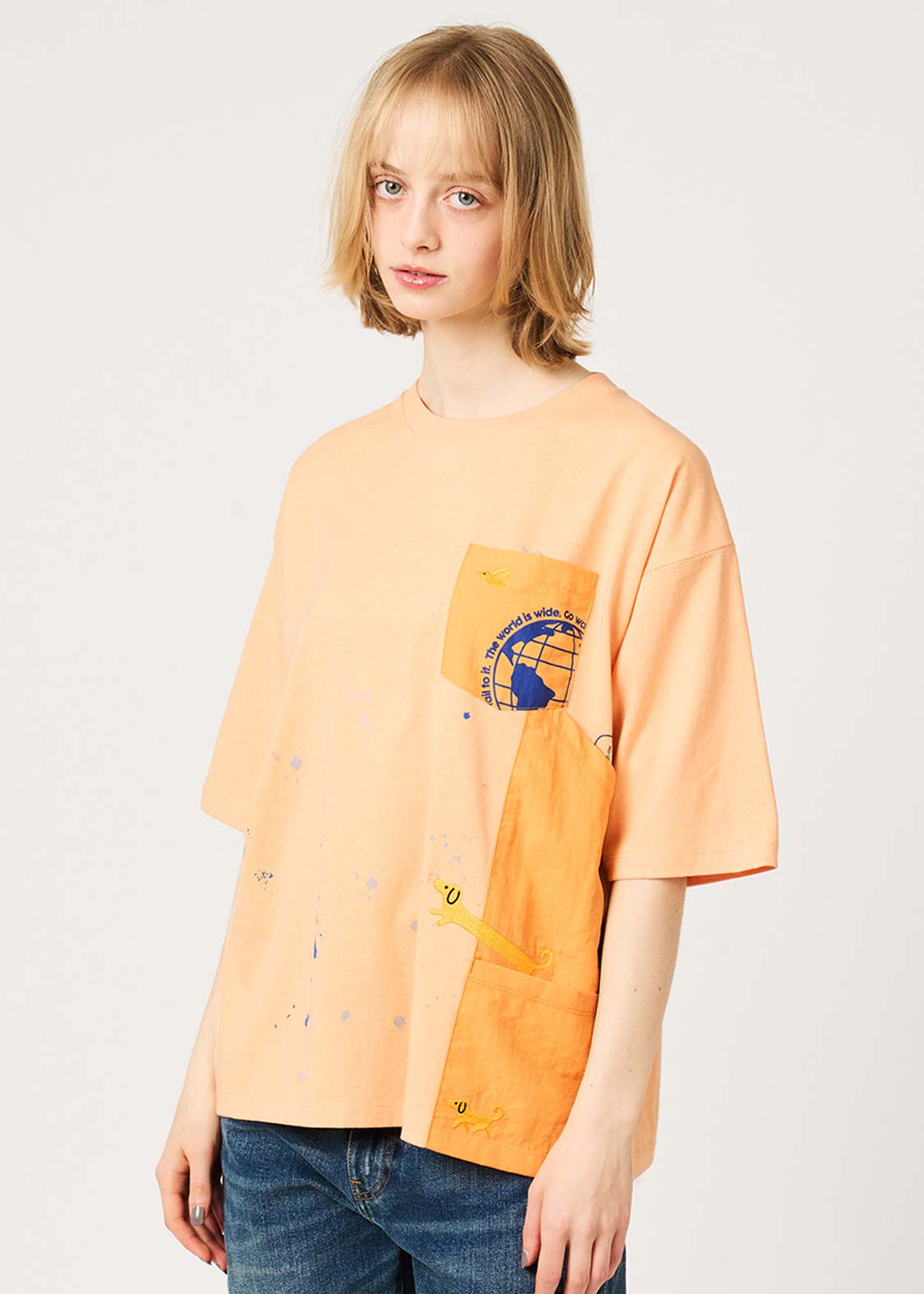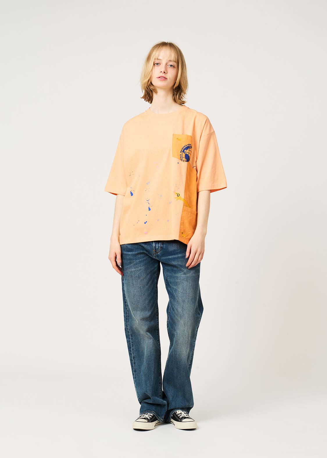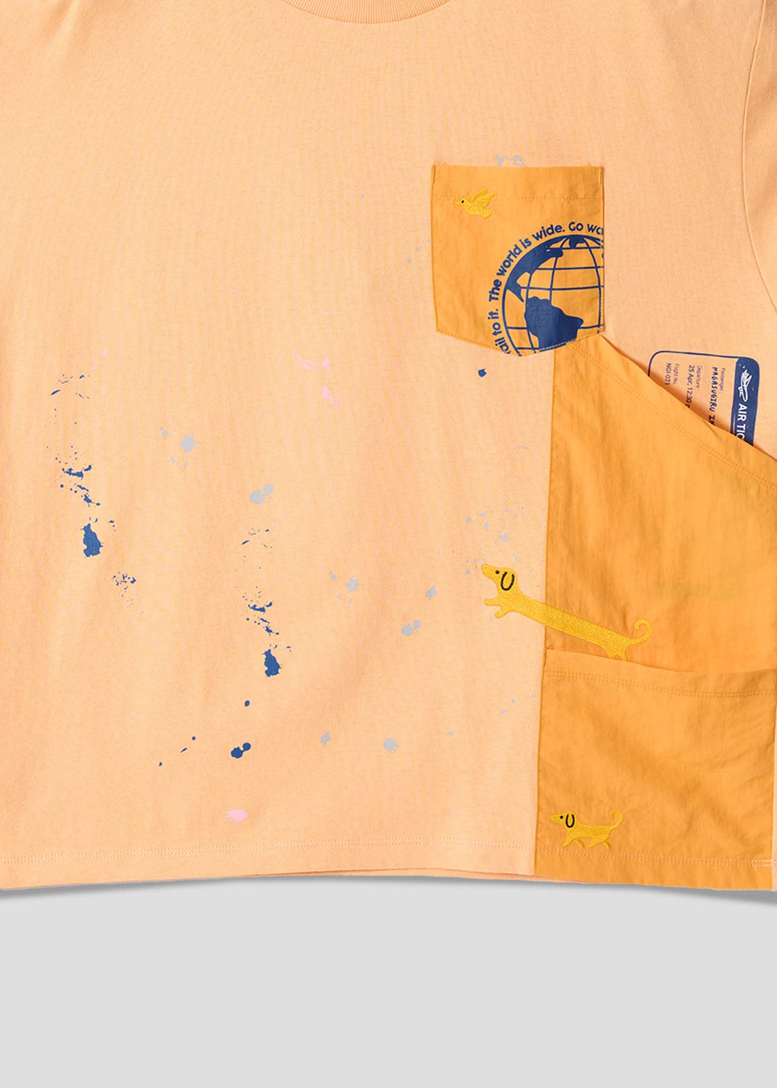 ・ナイロンワッシャー生地を使用したポケットや、ペイントが飛び散ったようなデザインがアクセントになっています。