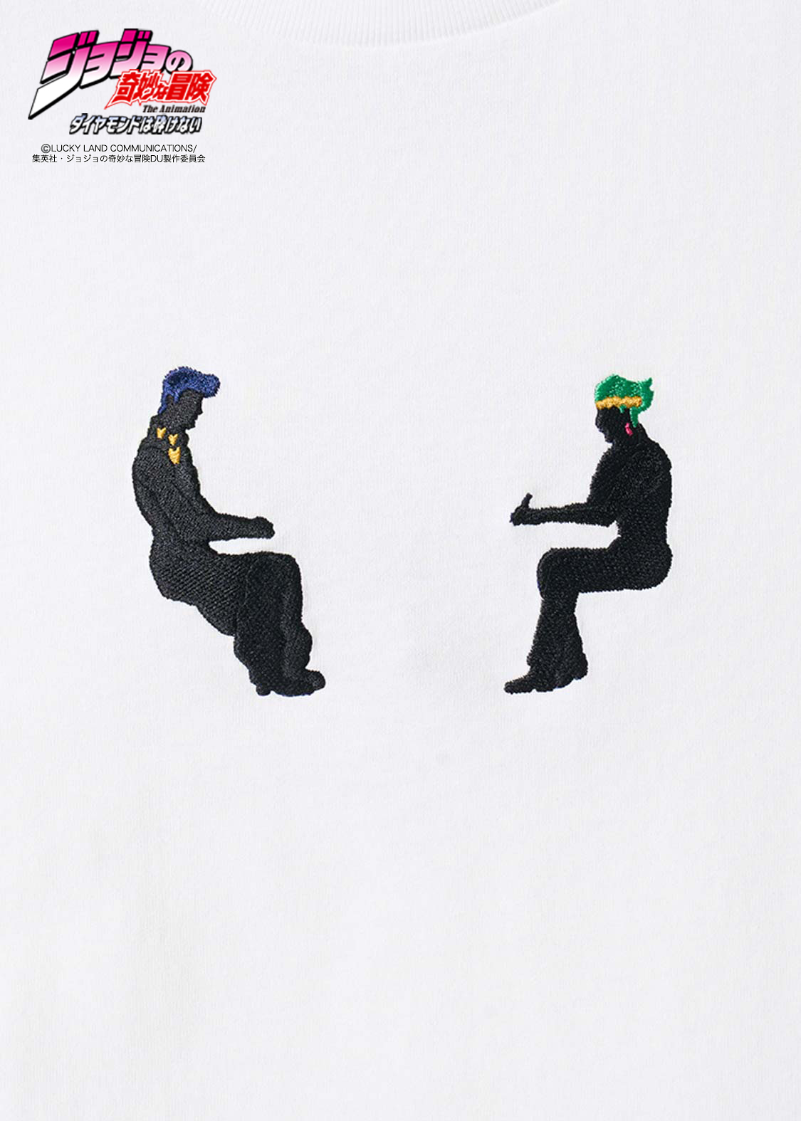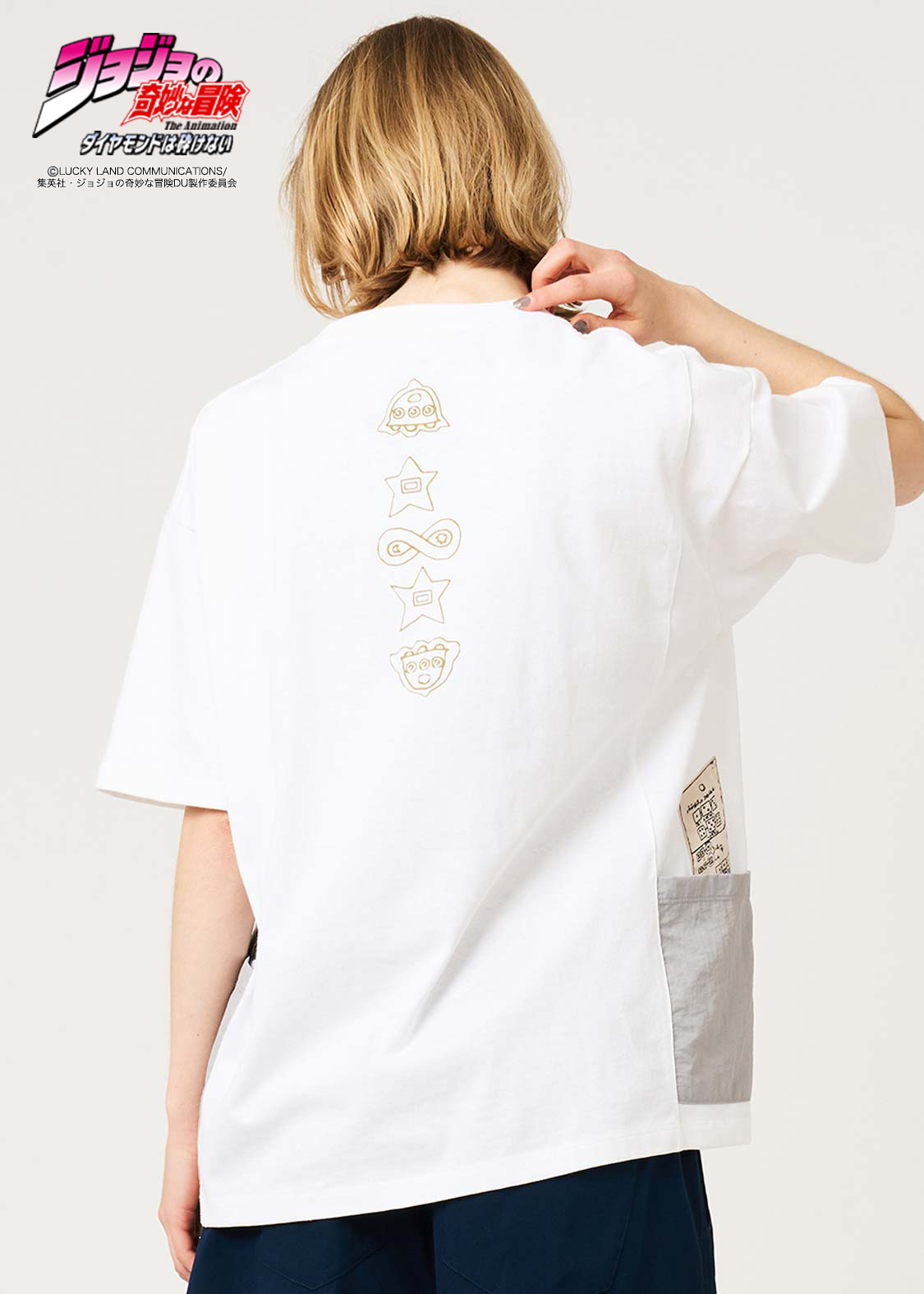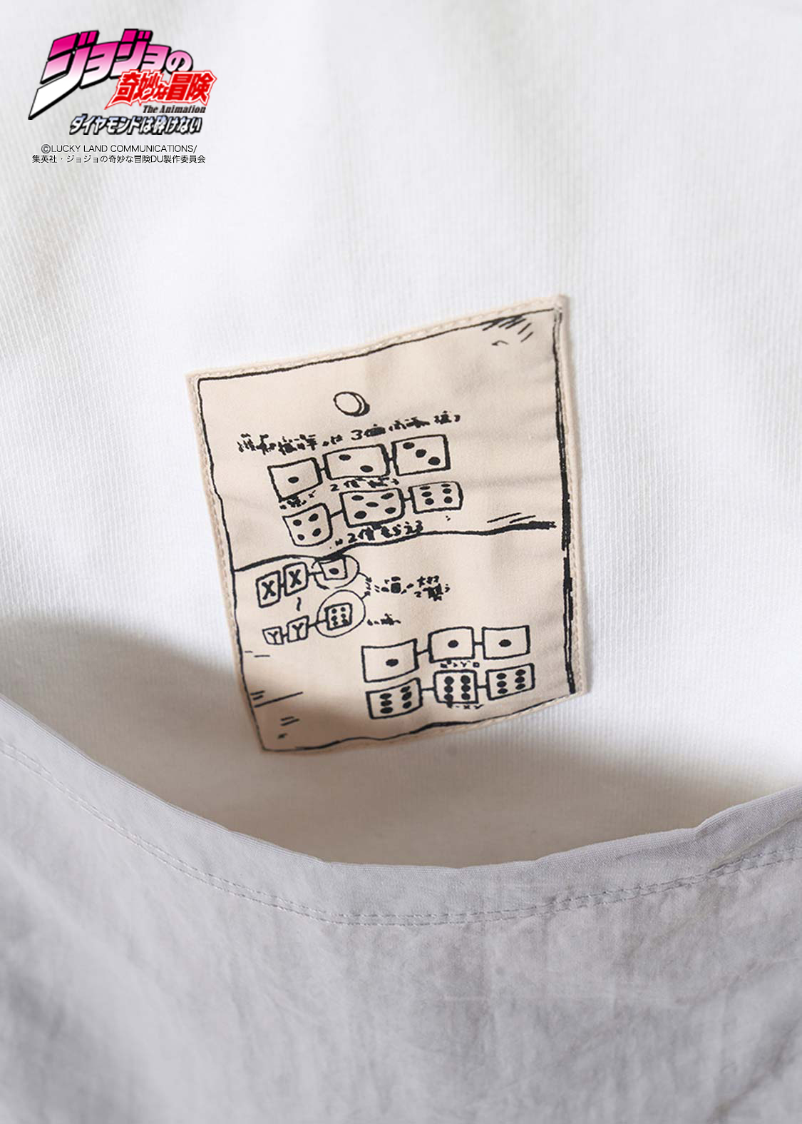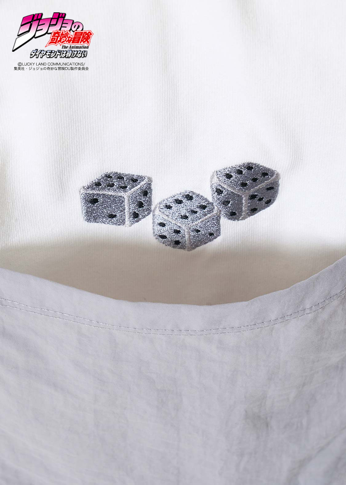 アニメ『ジョジョの奇妙な冒険 ダイヤモンドは砕けない』より。仗助が露伴に持ち掛けた印象的なゲームのシーンをモチーフにしたデザイン。フロントにはゲームをする2人の姿を刺繍であしらいました。ポケットにはプリントされたルール表と、宇宙人・未起隆が変身したサイコロの刺繍をそれぞれ配置。バックには未起隆の服の柄がプリントされアクセントになっています。
