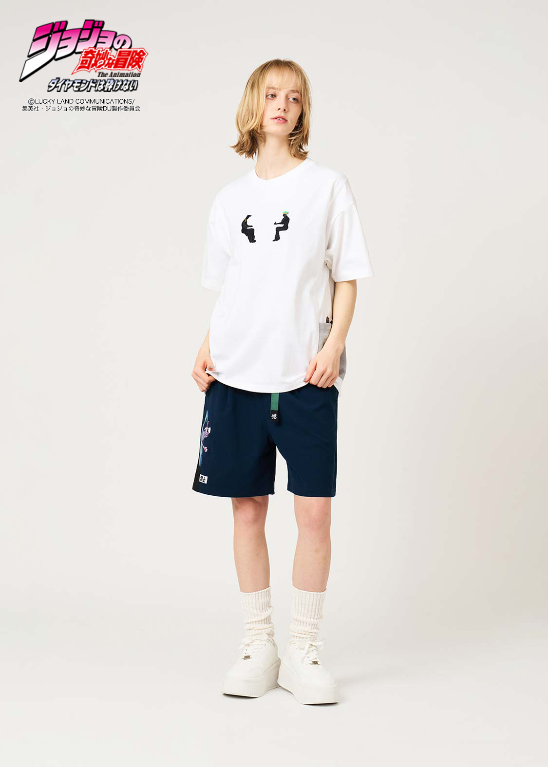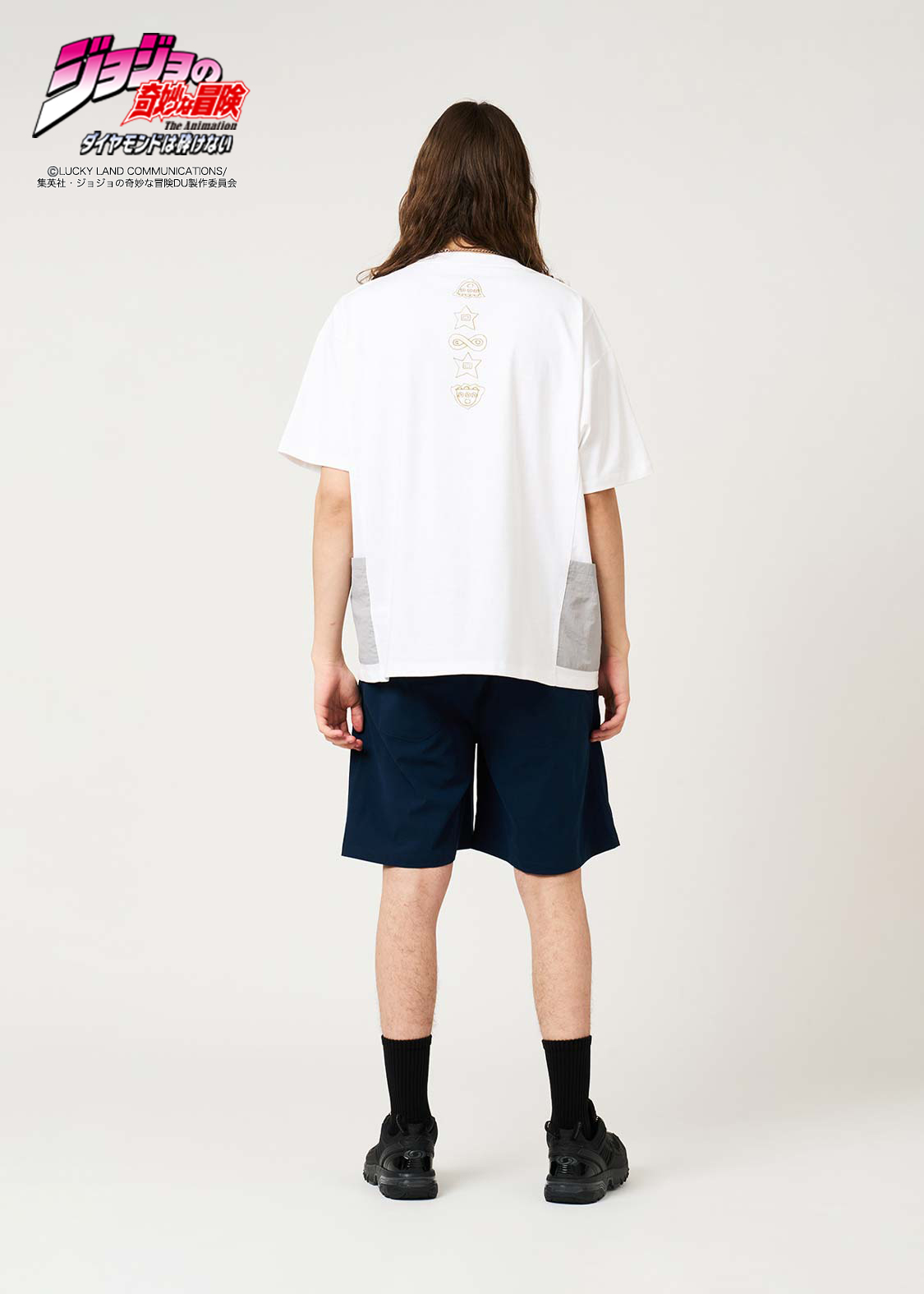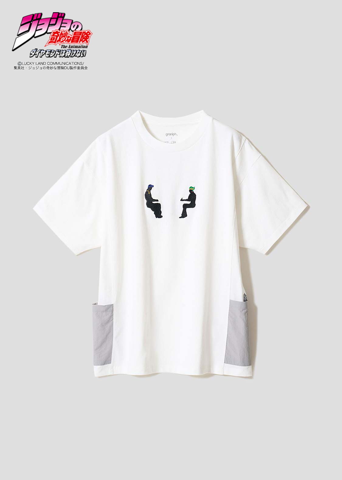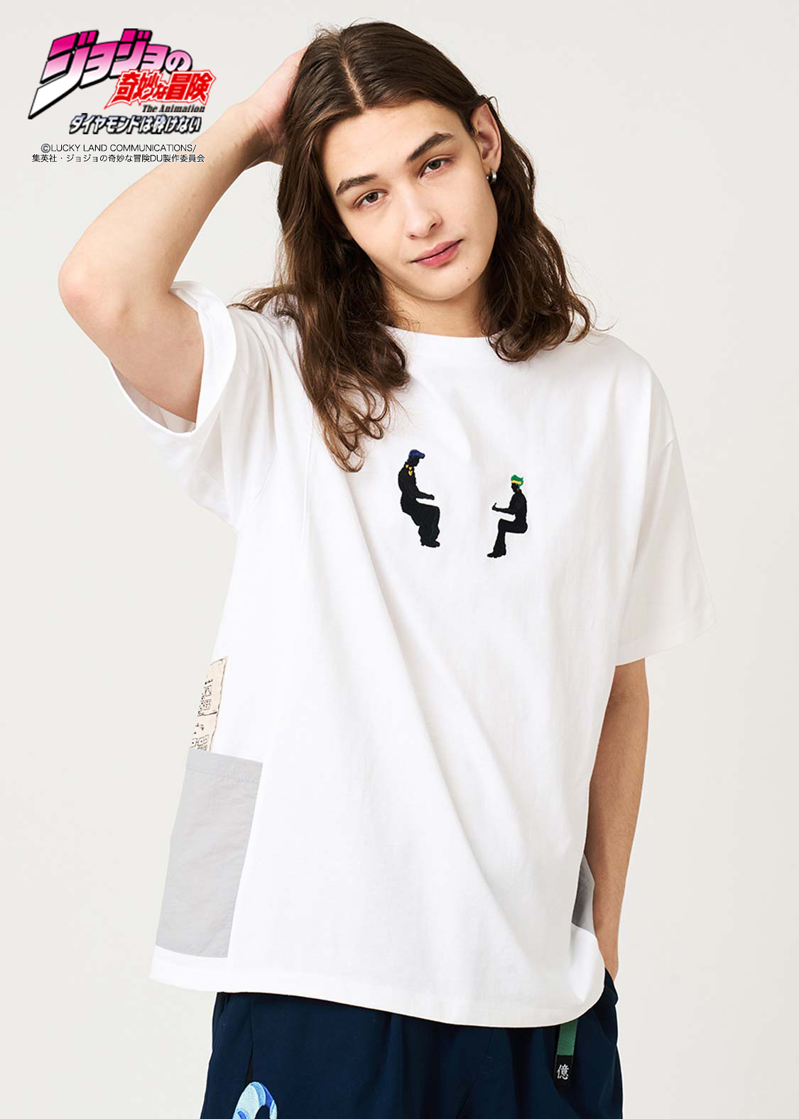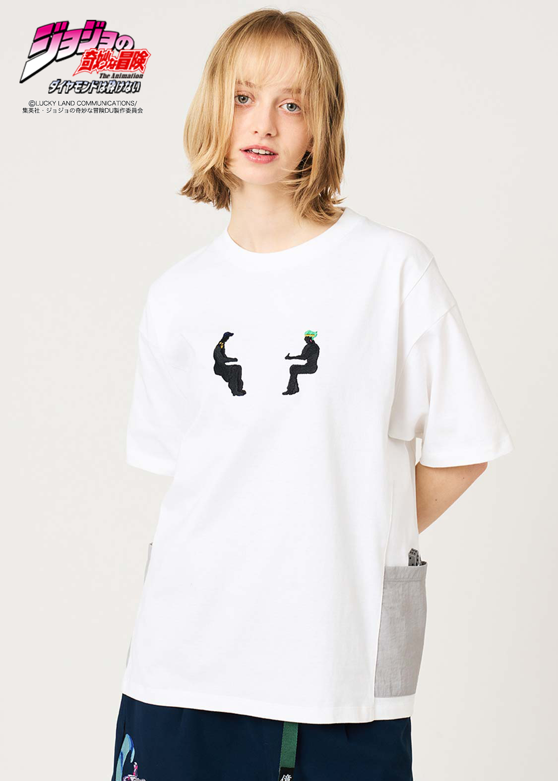 アニメ『ジョジョの奇妙な冒険 ダイヤモンドは砕けない』より。仗助が露伴に持ち掛けた印象的なゲームのシーンをモチーフにしたデザイン。フロントにはゲームをする2人の姿を刺繍であしらいました。ポケットにはプリントされたルール表と、宇宙人・未起隆が変身したサイコロの刺繍をそれぞれ配置。バックには未起隆の服の柄がプリントされアクセントになっています。