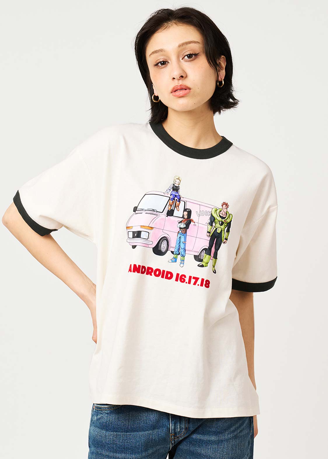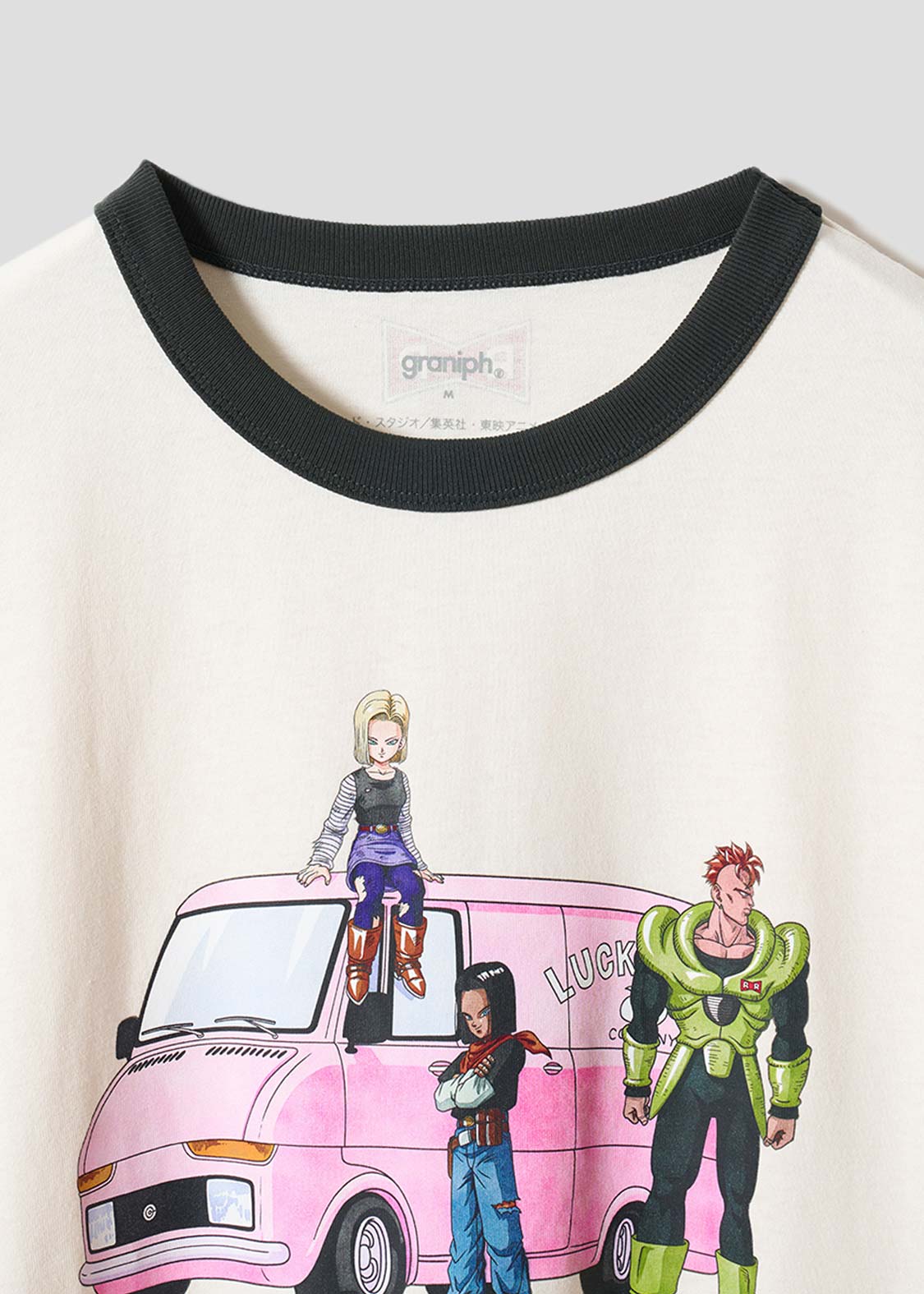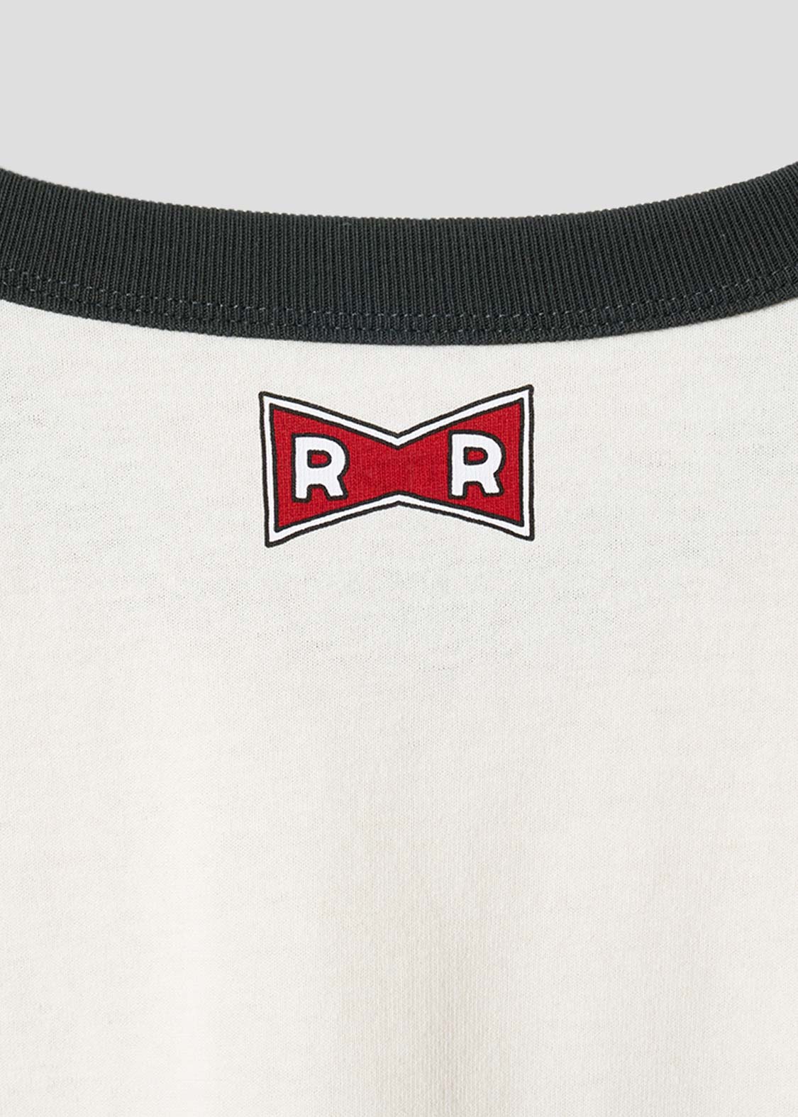 人造人間16号17号18号の3人をプリントしたデザイン。強い力を持ち、悟空を倒すことを目的としながらも、その道中のムダを楽しむ余裕を感じられるシーン。ANDROID 16.17.18の文字はフロッキープリントされています。バックの首元にはレッドリボン軍のマークをプリントしました。