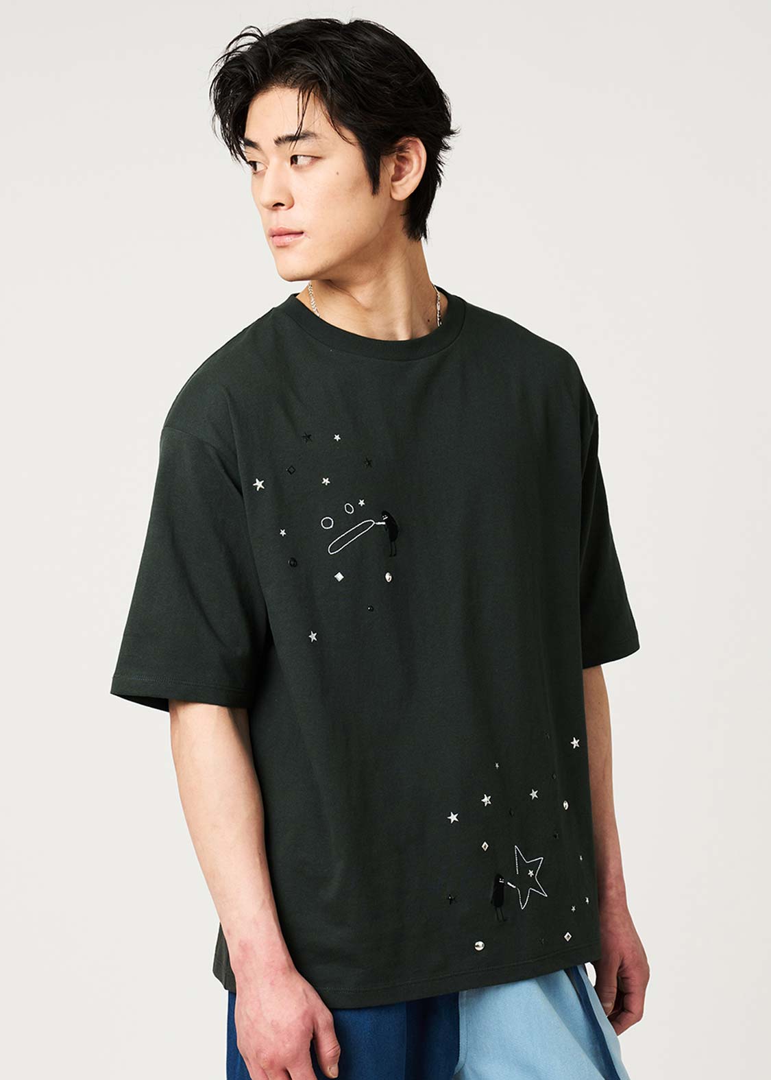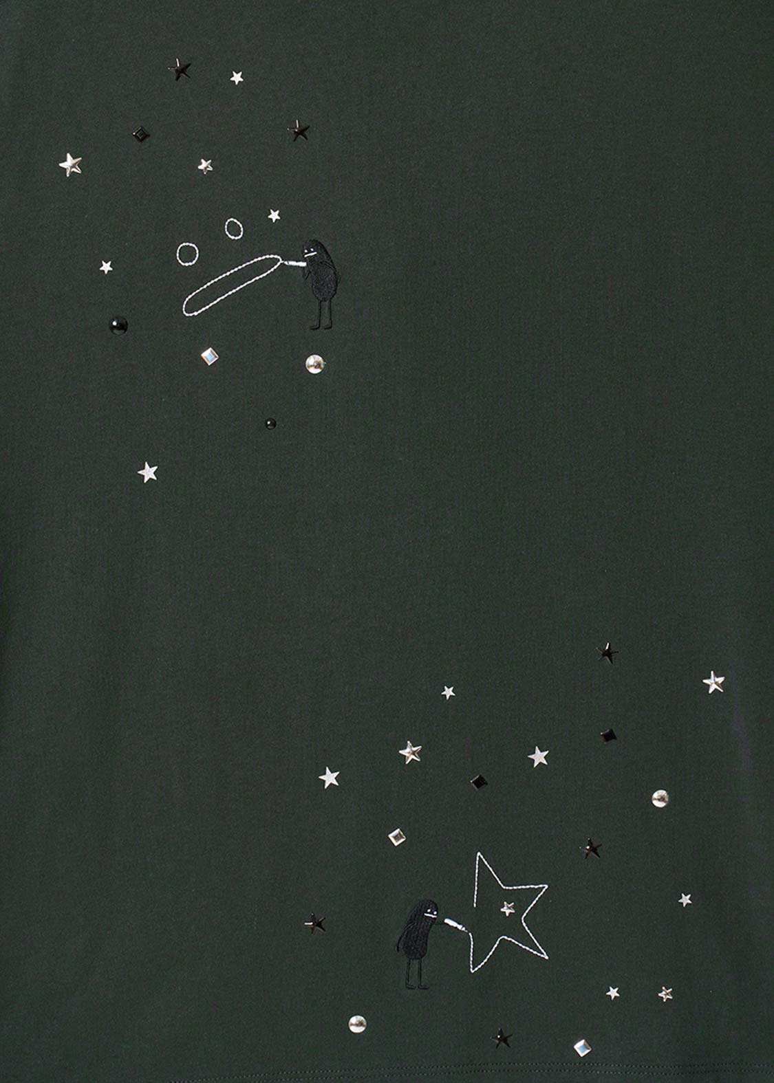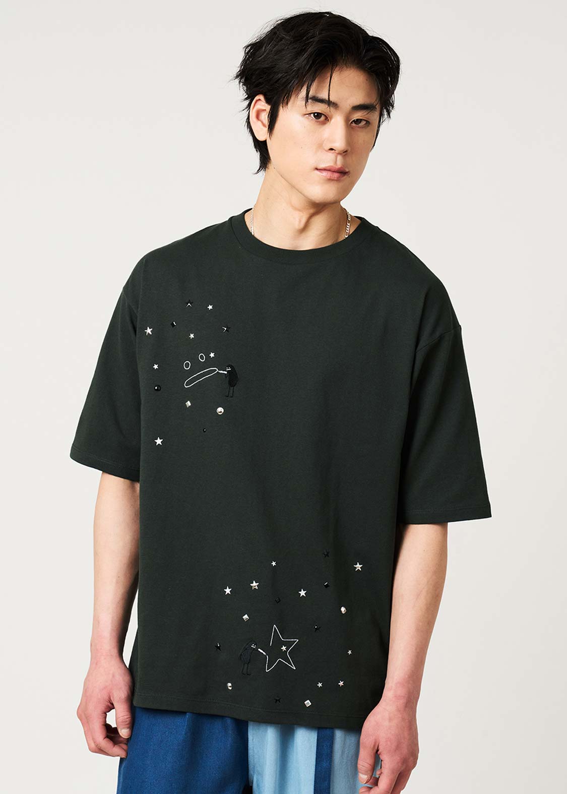 ・ホットフィックスと呼ばれる熱で圧着した小さなメタルチップを散りばめた、アクセントが効いたデザインです。