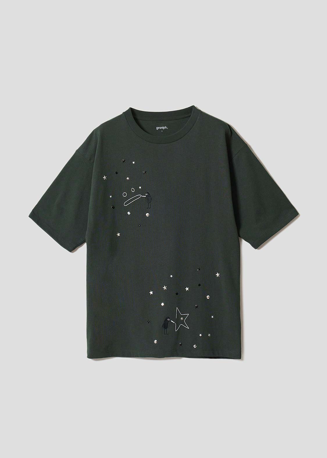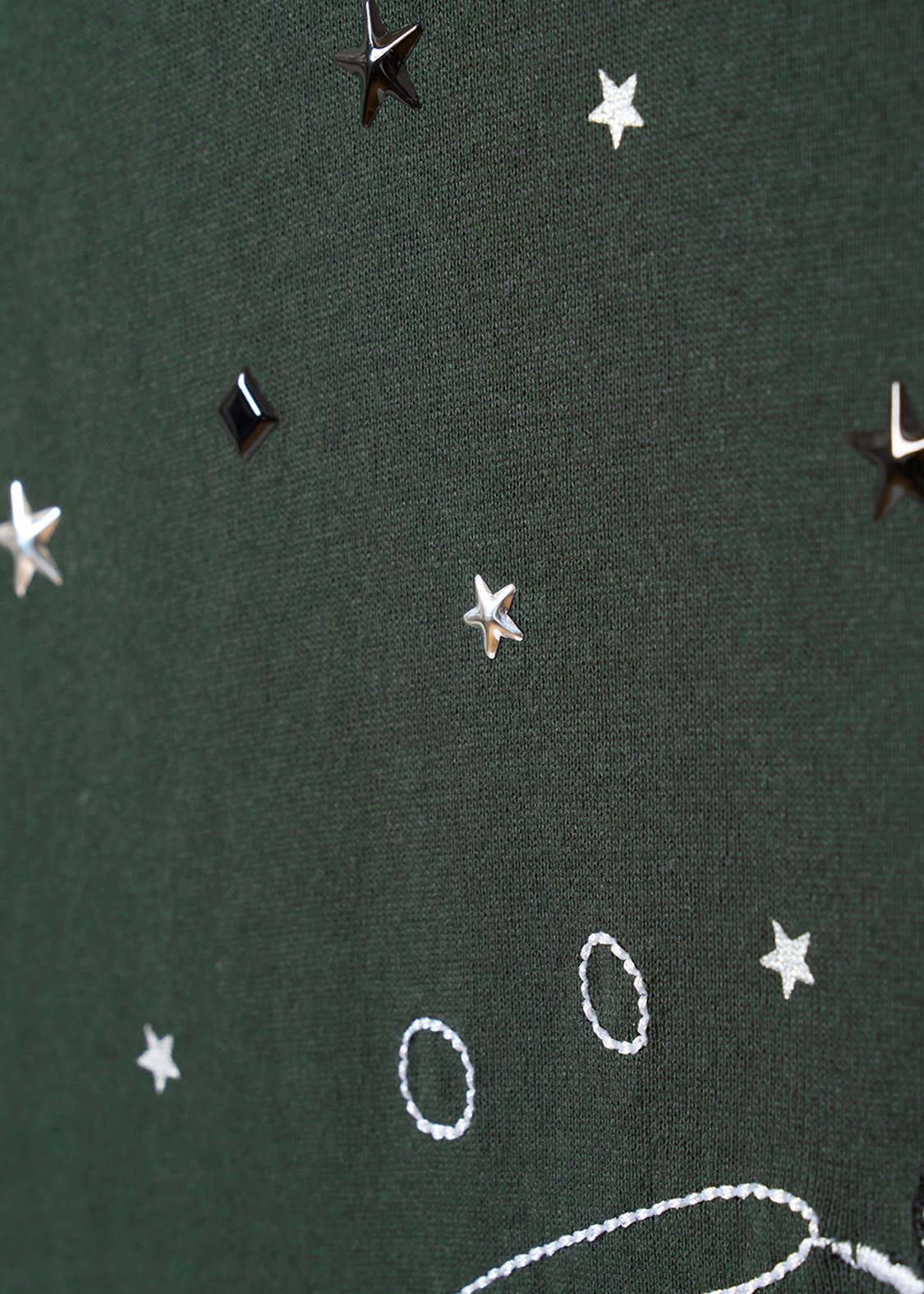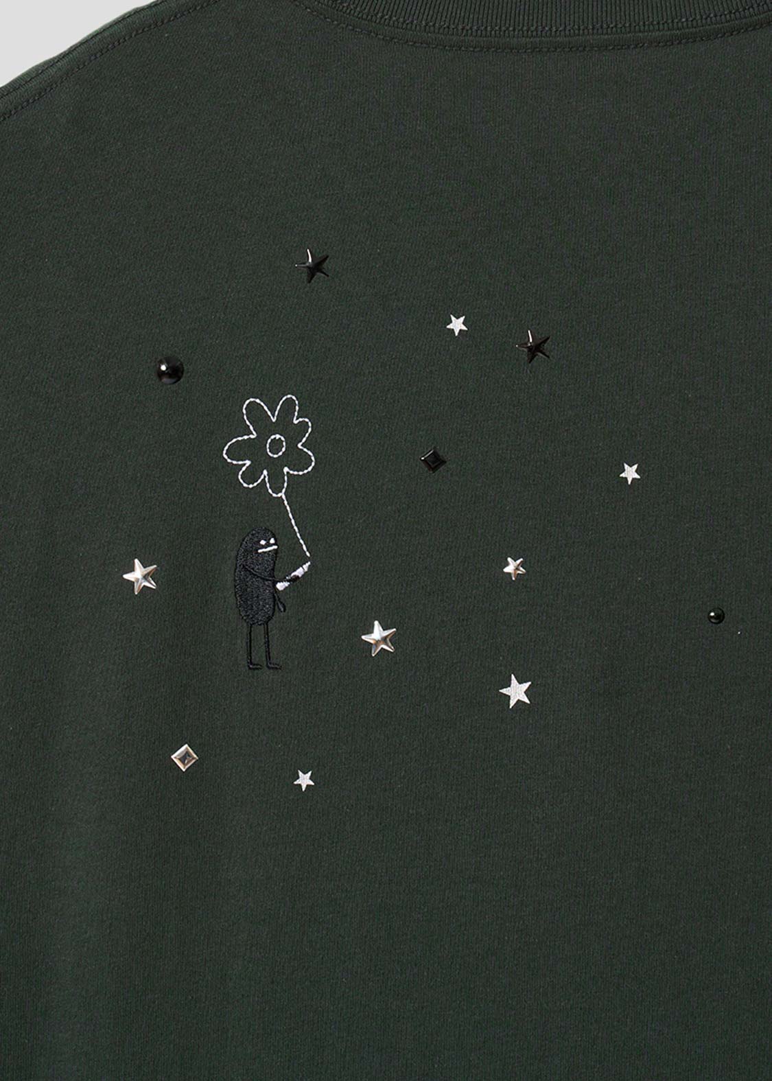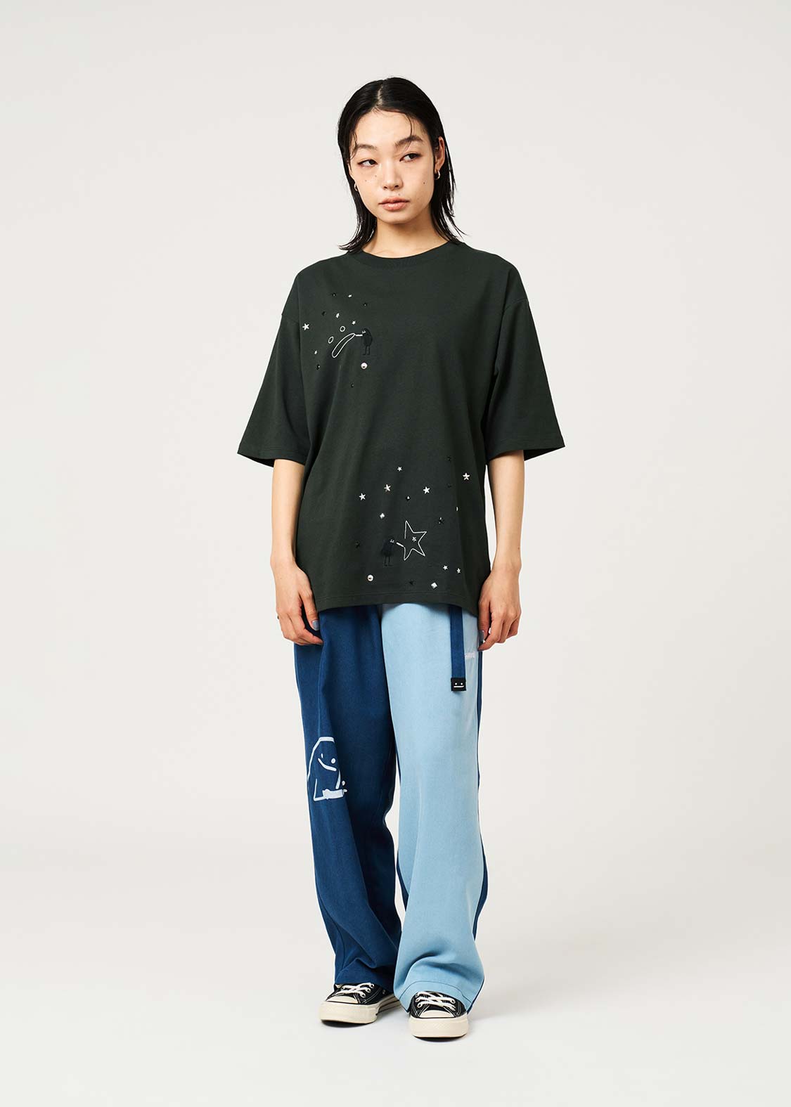 ・ホットフィックスと呼ばれる熱で圧着した小さなメタルチップを散りばめた、アクセントが効いたデザインです。