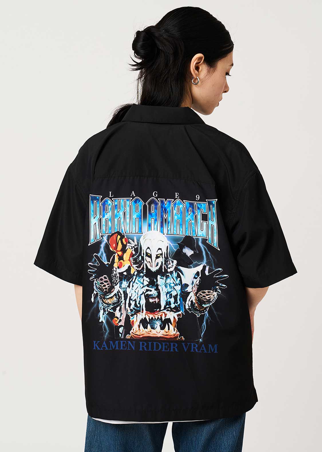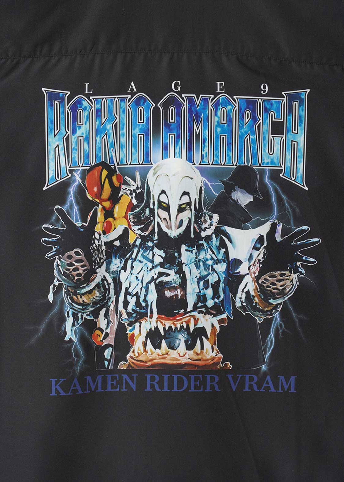 『仮面ライダーガヴ』より。ラーゲ9ことラキア・アマルガにフィーチャーしたデザイン。グラニュートの姿をメインに、人間態と「仮面ライダーヴラム」の姿も描かれています。胸元のポケットの中にプリントされたラキア・アマルガの弟であるコメル・アマルガにも注目です。