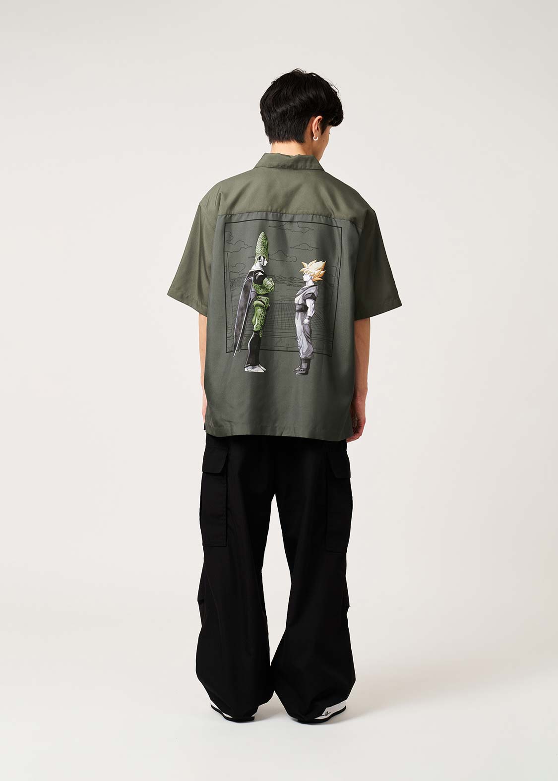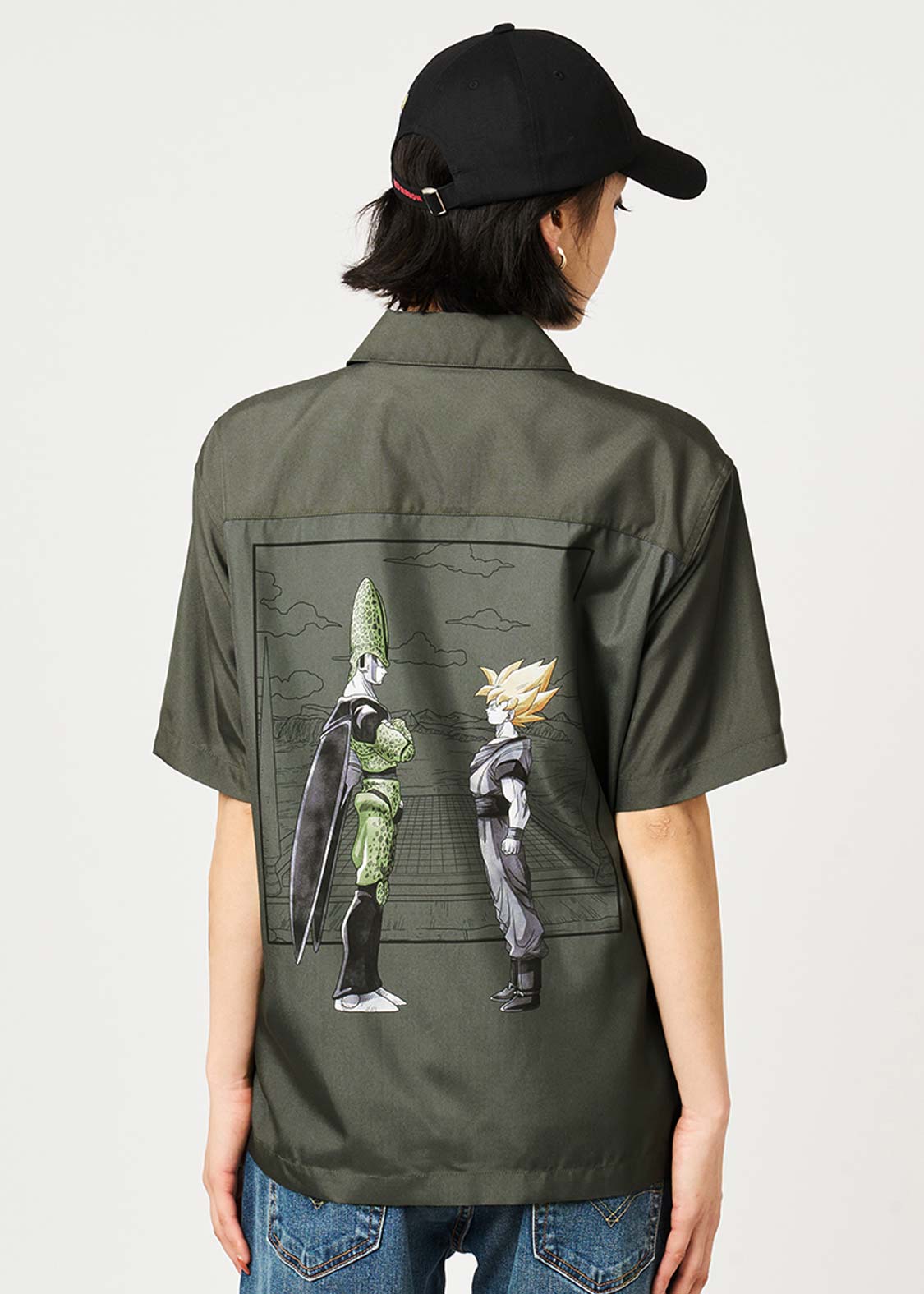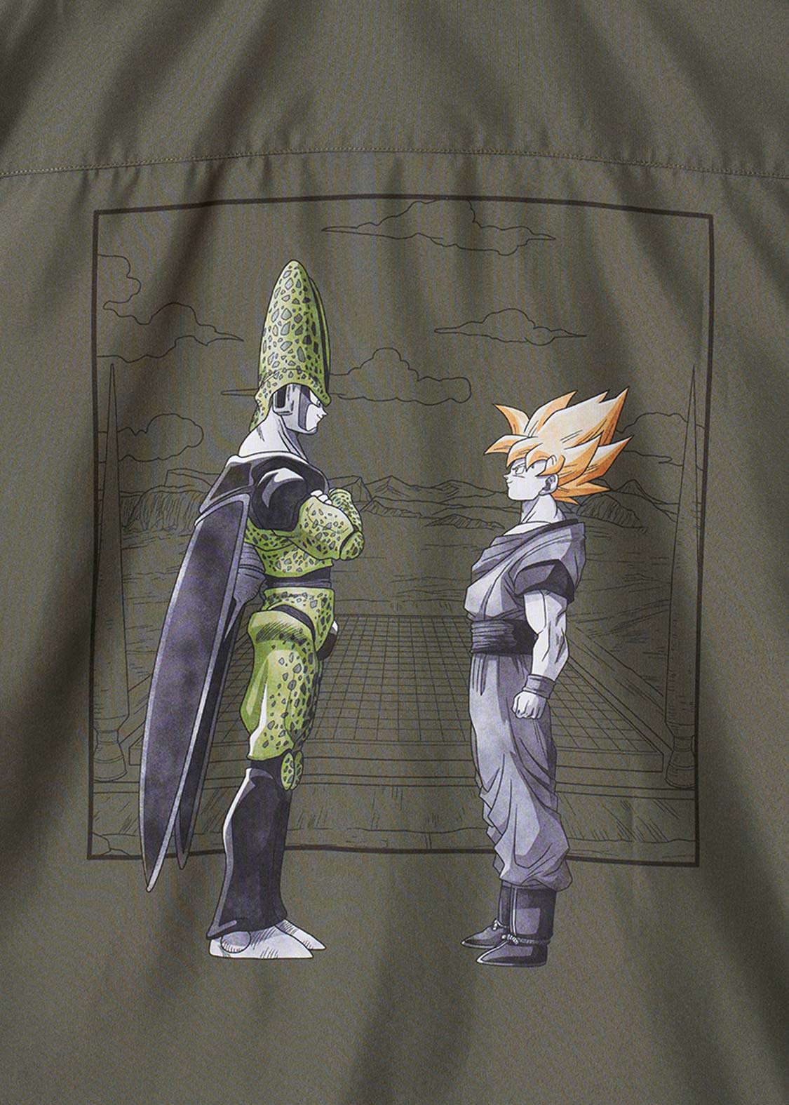 バックにプリントされたメインアートは、セルゲームの舞台となるリングを背景に、セルと悟空が対峙した姿。フロントの胸元にはDRAGON BALL Zの文字が刺繍されています。首元の内側にプリントされた、岩陰から2人の様子を伺うミスター・サタンとテレビクルー2人にも注目です。ボタンのカラーは悟空の道着とセル自身の色をイメージしています。