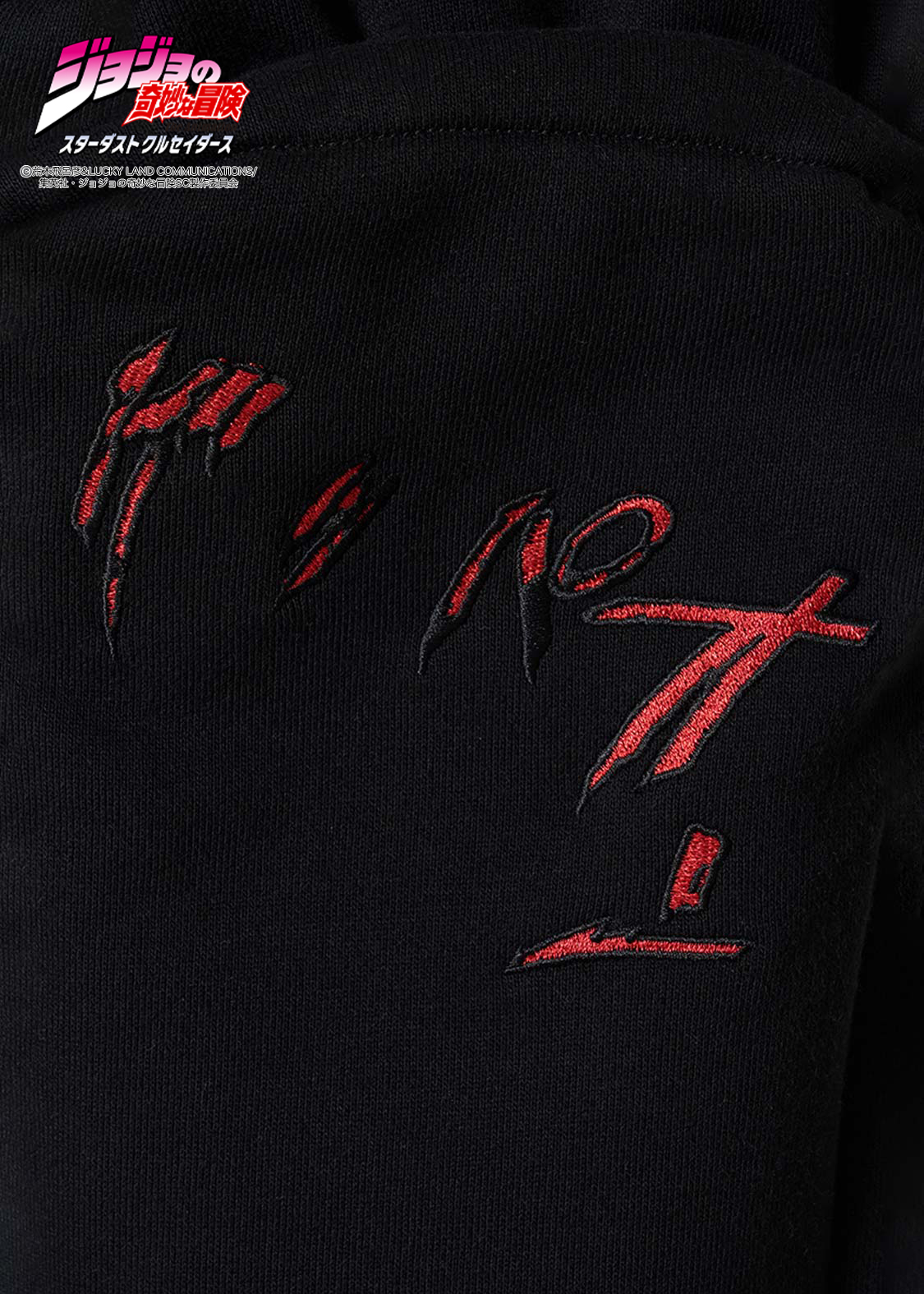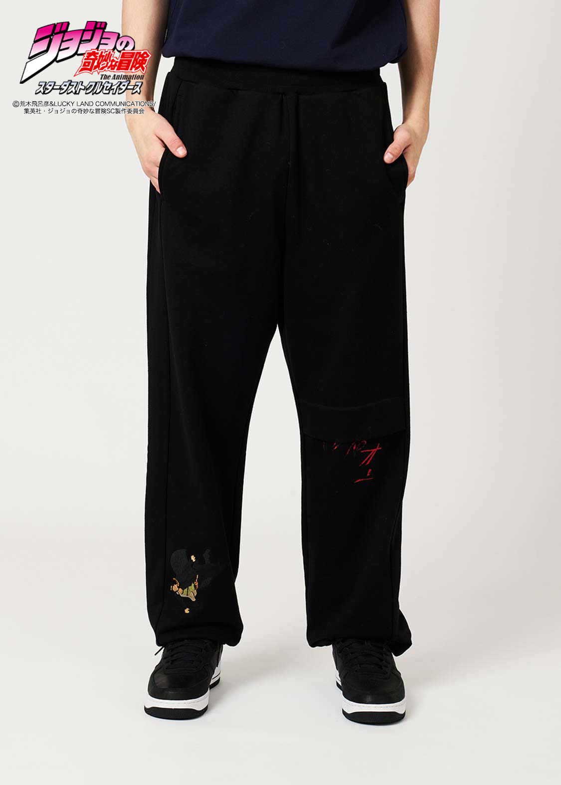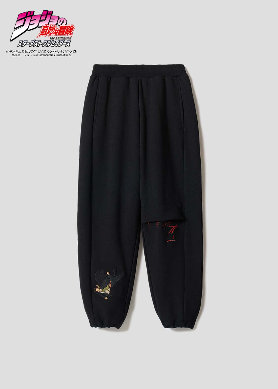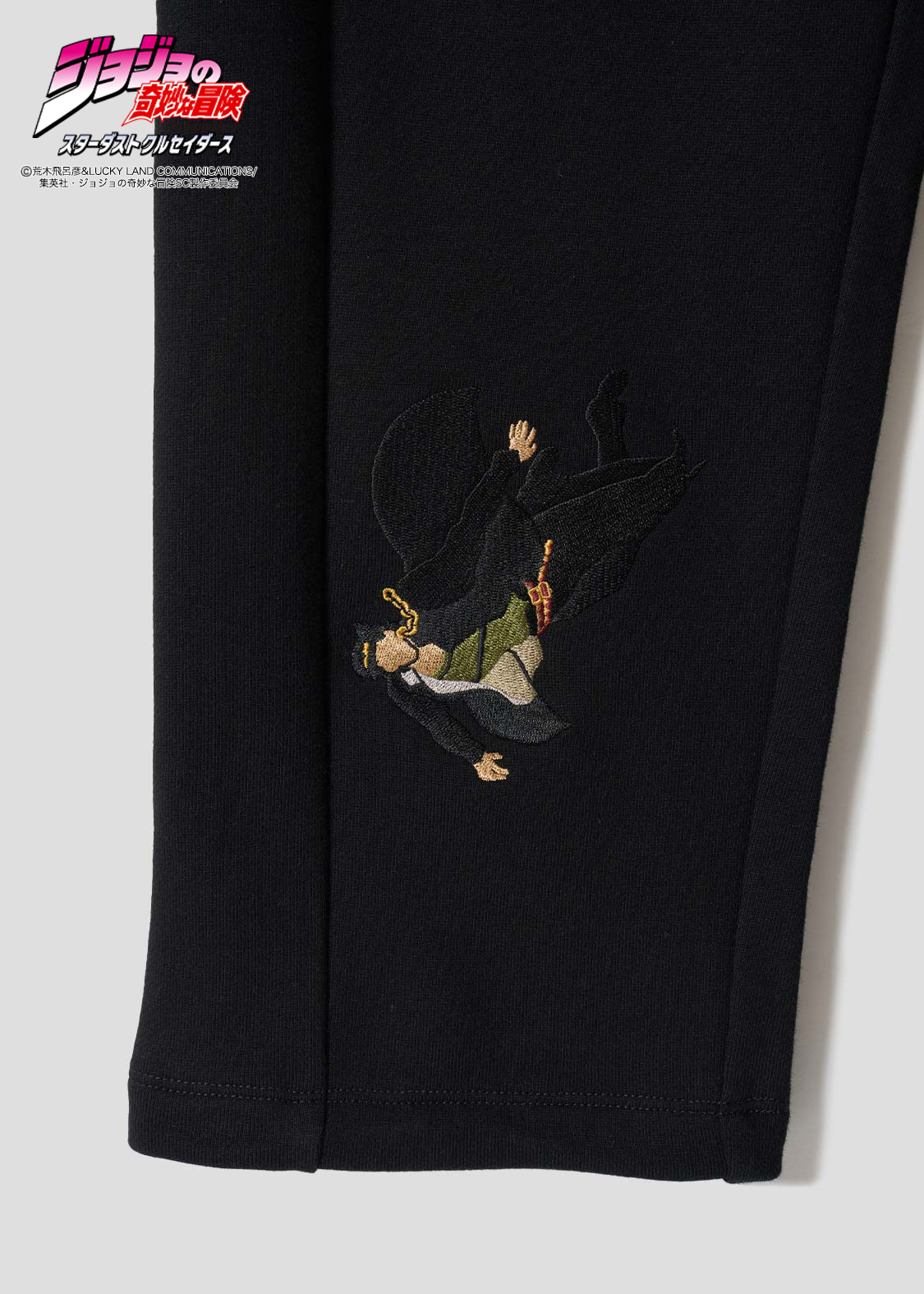 アニメ『ジョジョの奇妙な冒険 スターダストクルセイダース』より。承太郎が花京院のスタンド「ハイエロファントグリーン」に攻撃を受けたシーンをモチーフにしたデザイン。切れた左足をタックで表現し、その際の擬音「グッパオン」を刺繍で施しました。右足には落下する承太郎を刺繍であしらい、バックポケットには花京院が描いた承太郎の油絵を忍ばせています。
