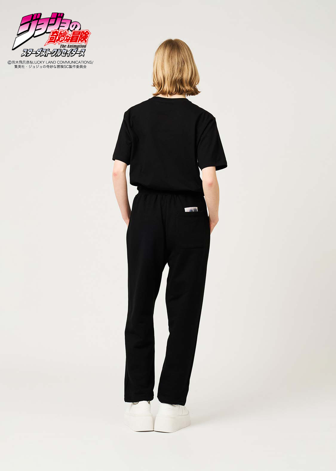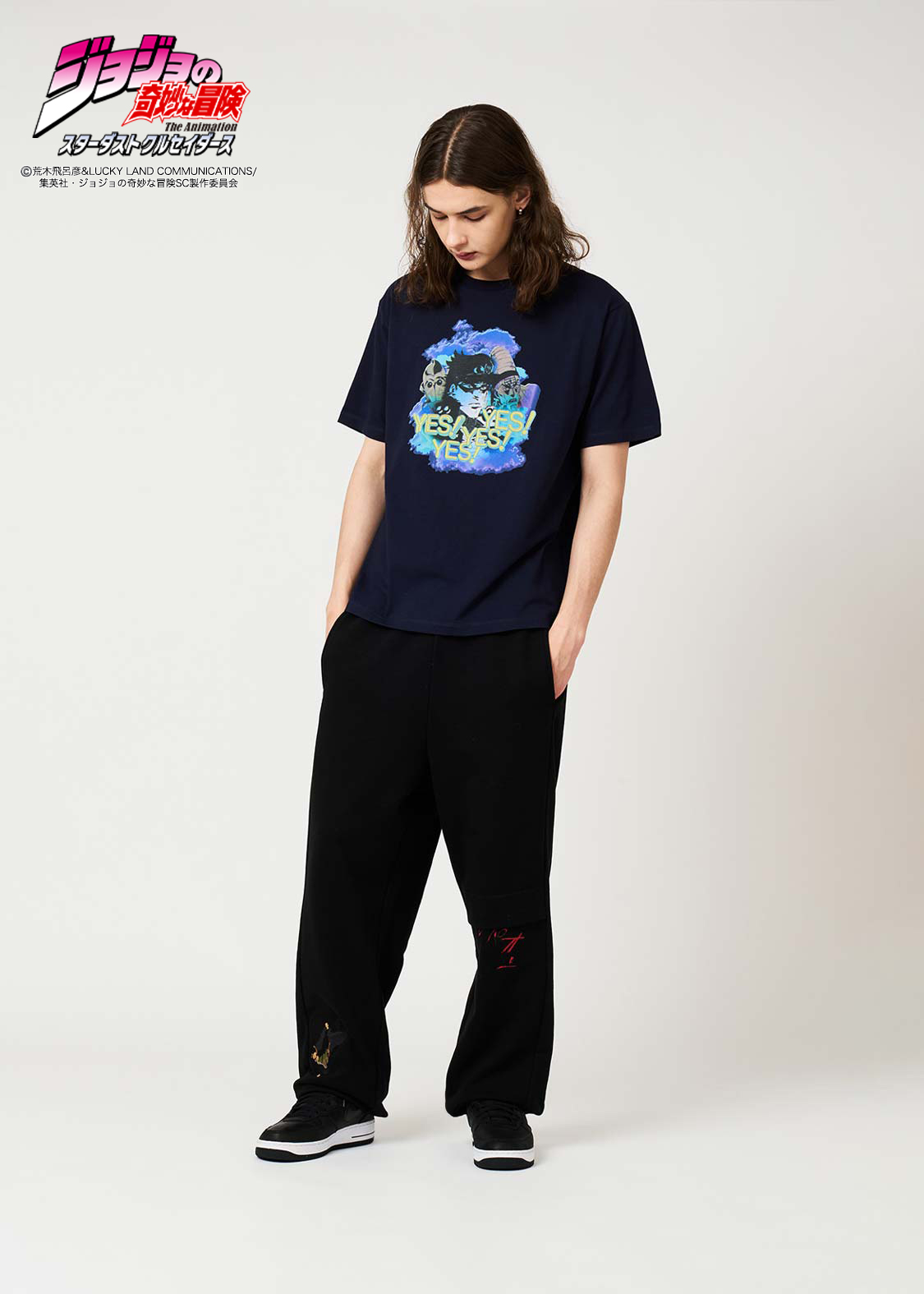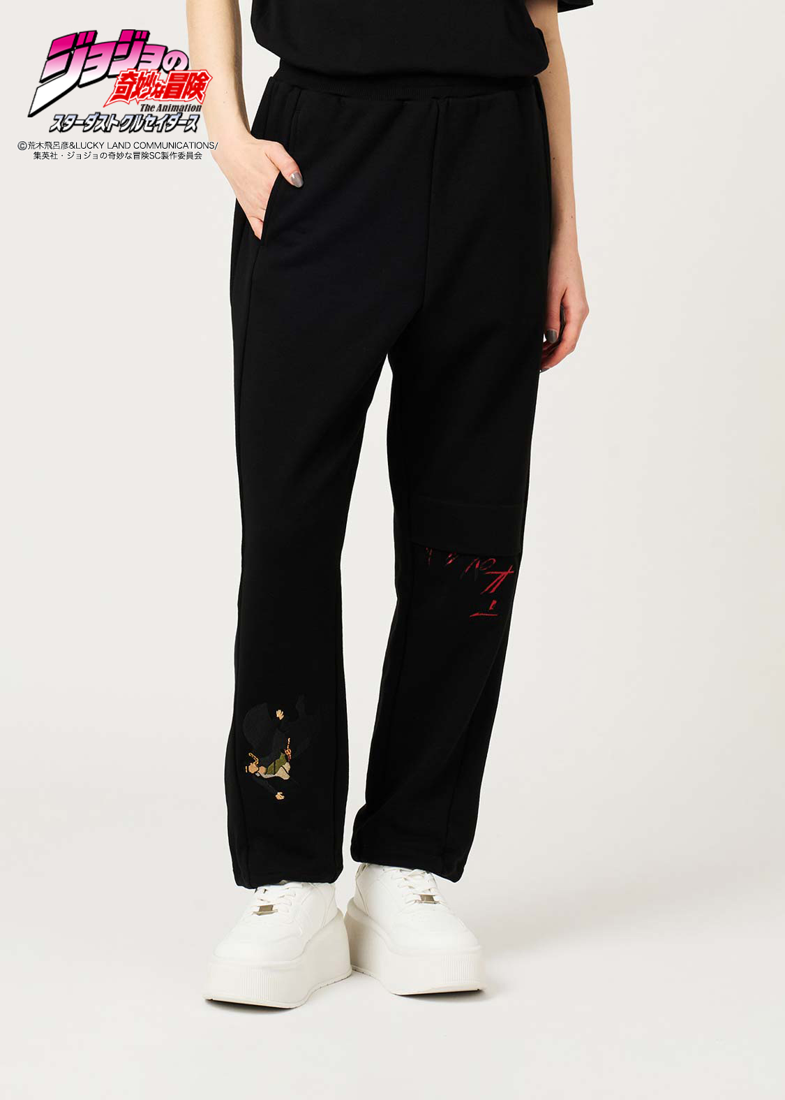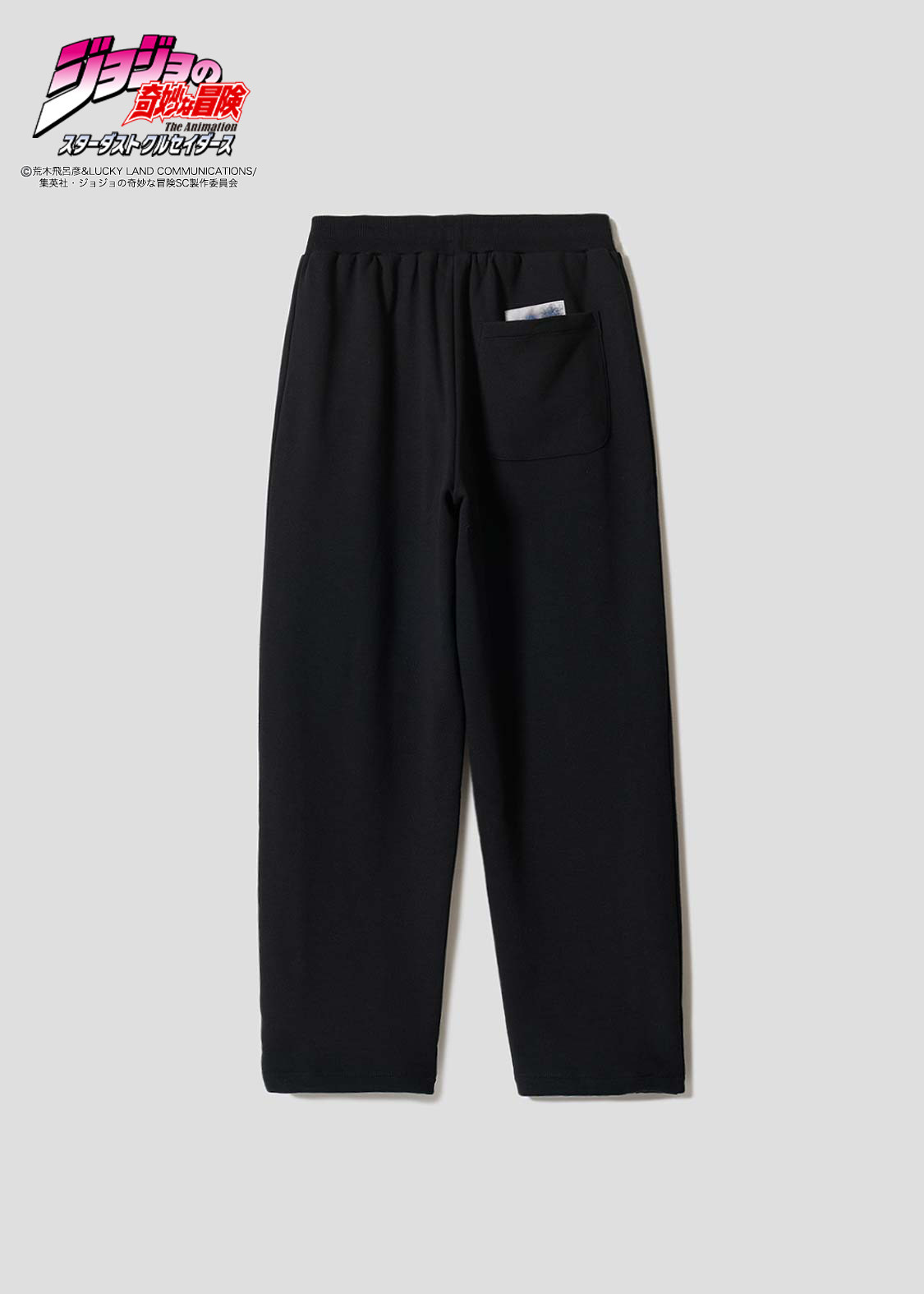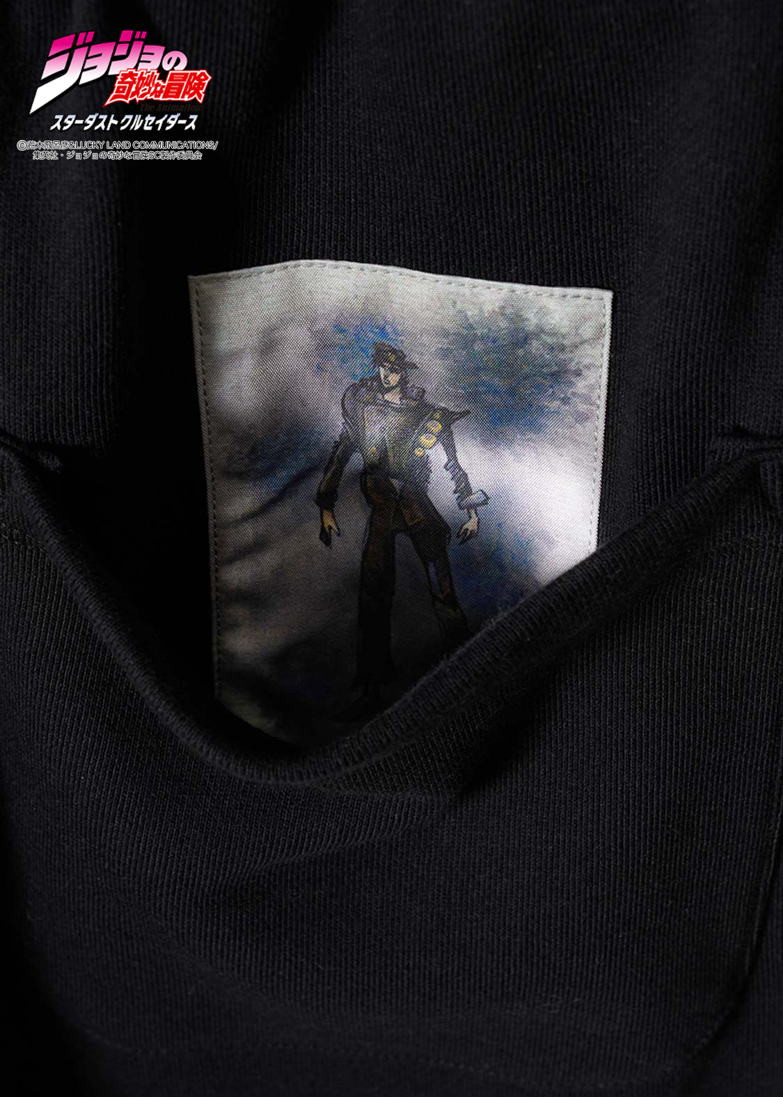 アニメ『ジョジョの奇妙な冒険 スターダストクルセイダース』より。承太郎が花京院のスタンド「ハイエロファントグリーン」に攻撃を受けたシーンをモチーフにしたデザイン。切れた左足をタックで表現し、その際の擬音「グッパオン」を刺繍で施しました。右足には落下する承太郎を刺繍であしらい、バックポケットには花京院が描いた承太郎の油絵を忍ばせています。