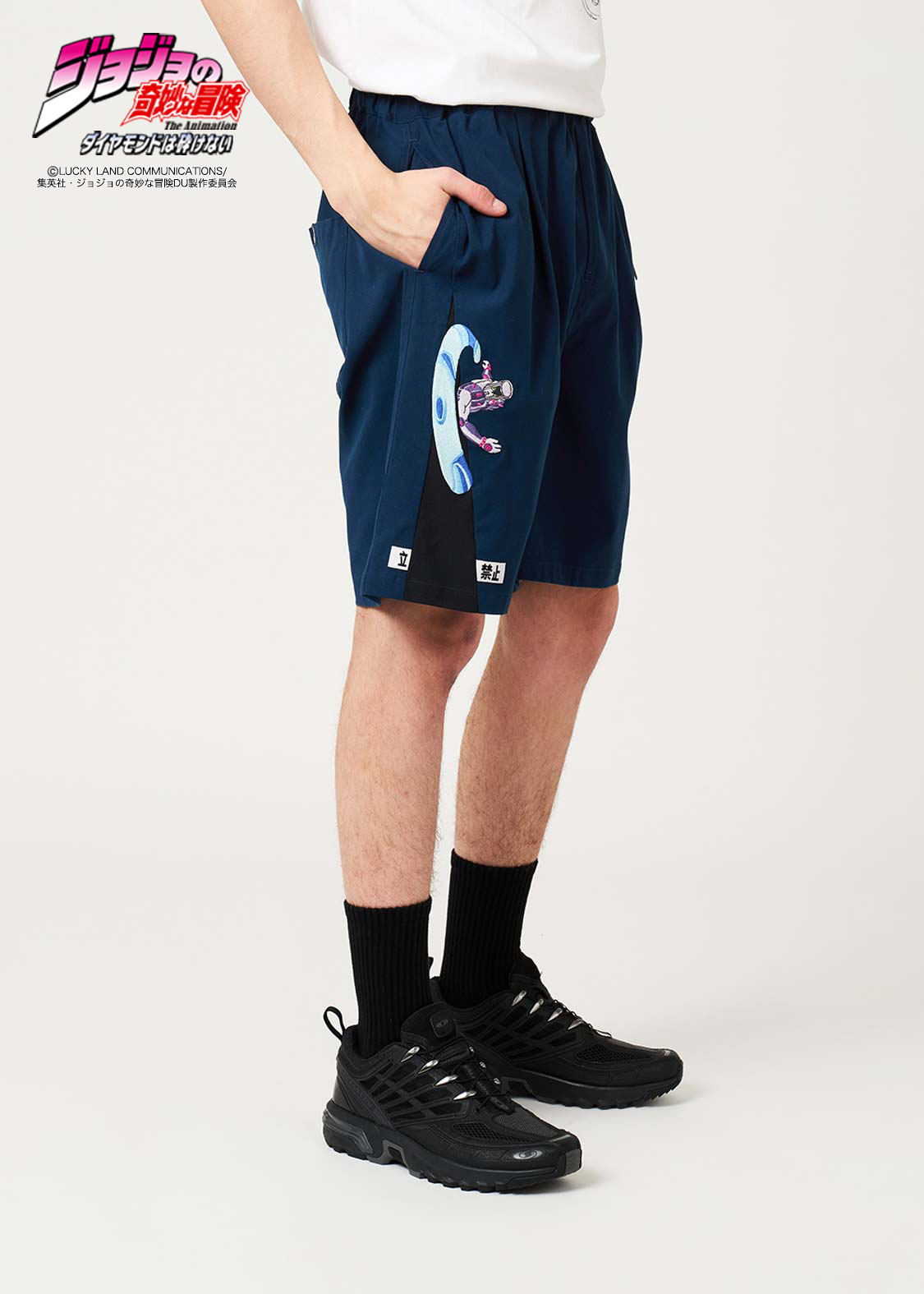 アニメ『ジョジョの奇妙な冒険 ダイヤモンドは砕けない』より。虹村 億泰とスタンド「ザ・ハンド」をモチーフにしたデザイン。刺繍であしらった「ザ・ハンド」と切り替え、さらに削り取られた看板を織りネームで施し、その能力を表現しました。ベルトやバックポケットには億泰の衣装モチーフを織りネームであしらっているのもポイントです。