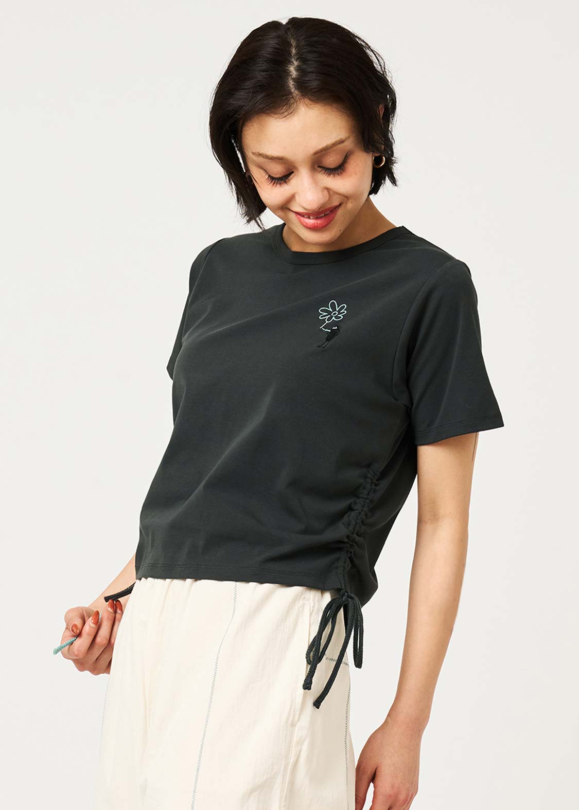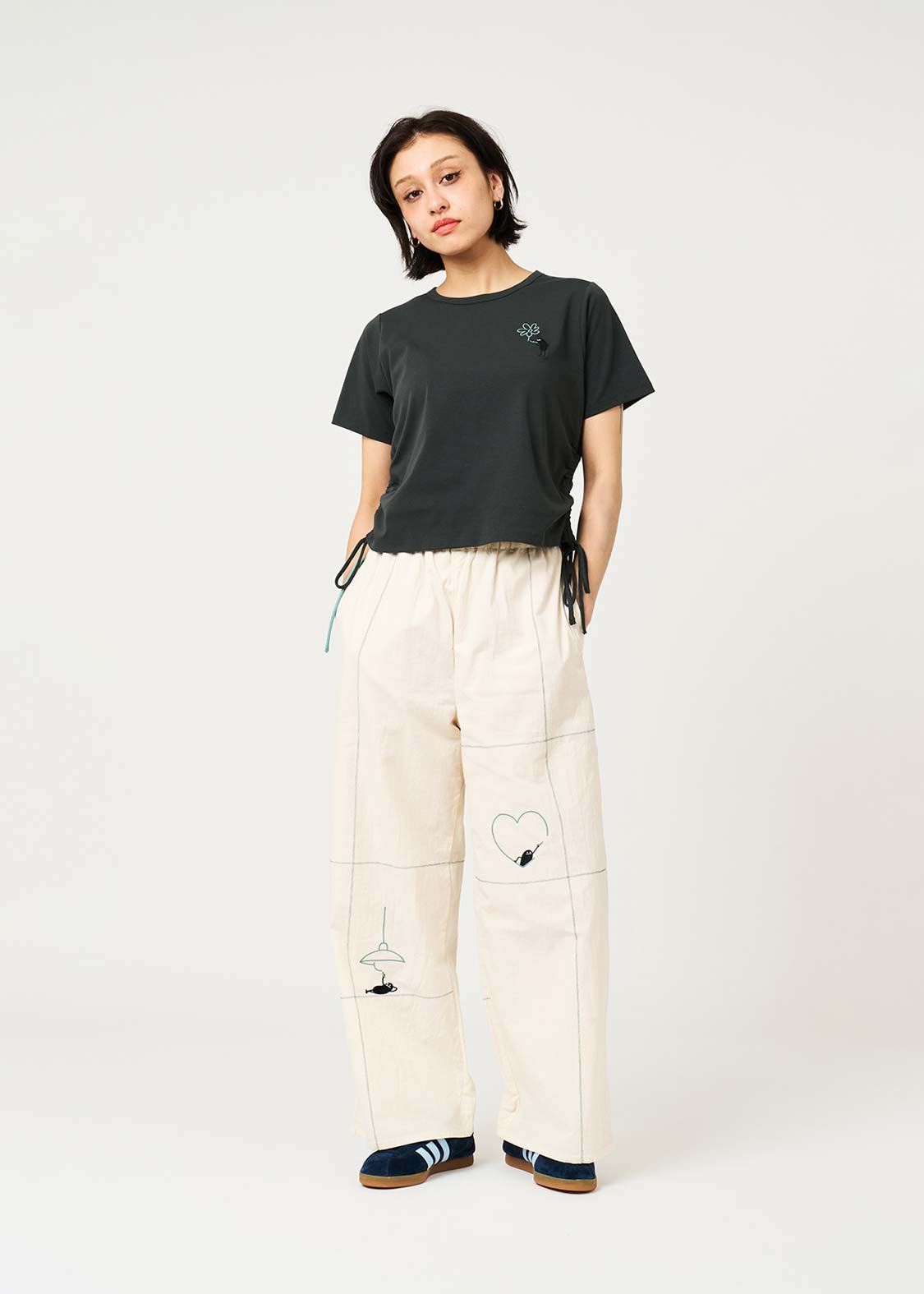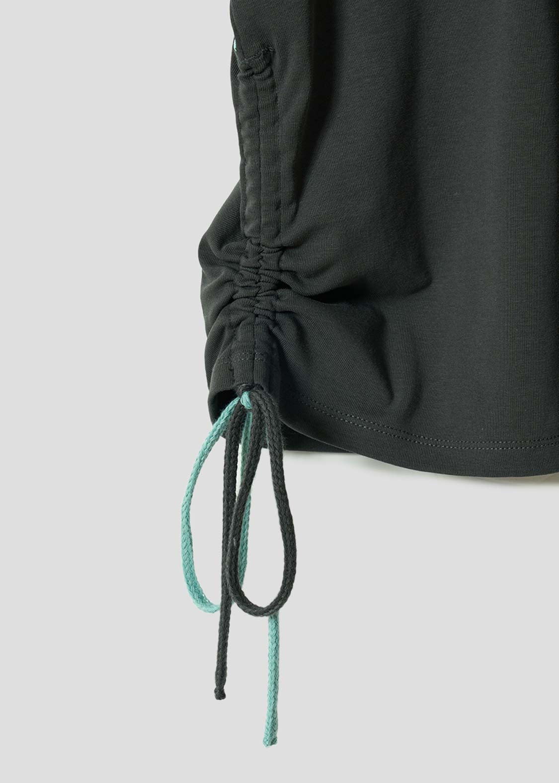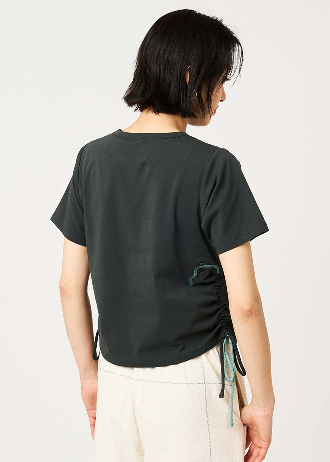 ・サイドにドローストリング仕様のリボンを配し、好みの丈やシルエットに調整できます。
