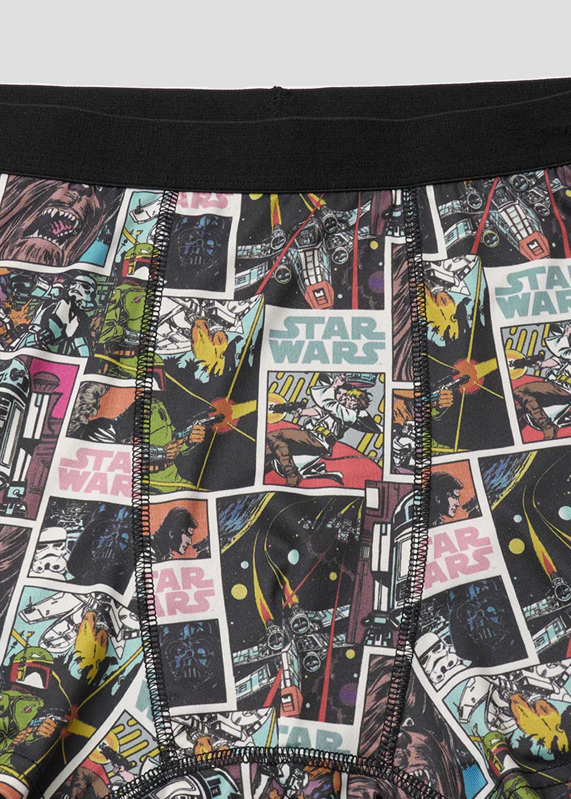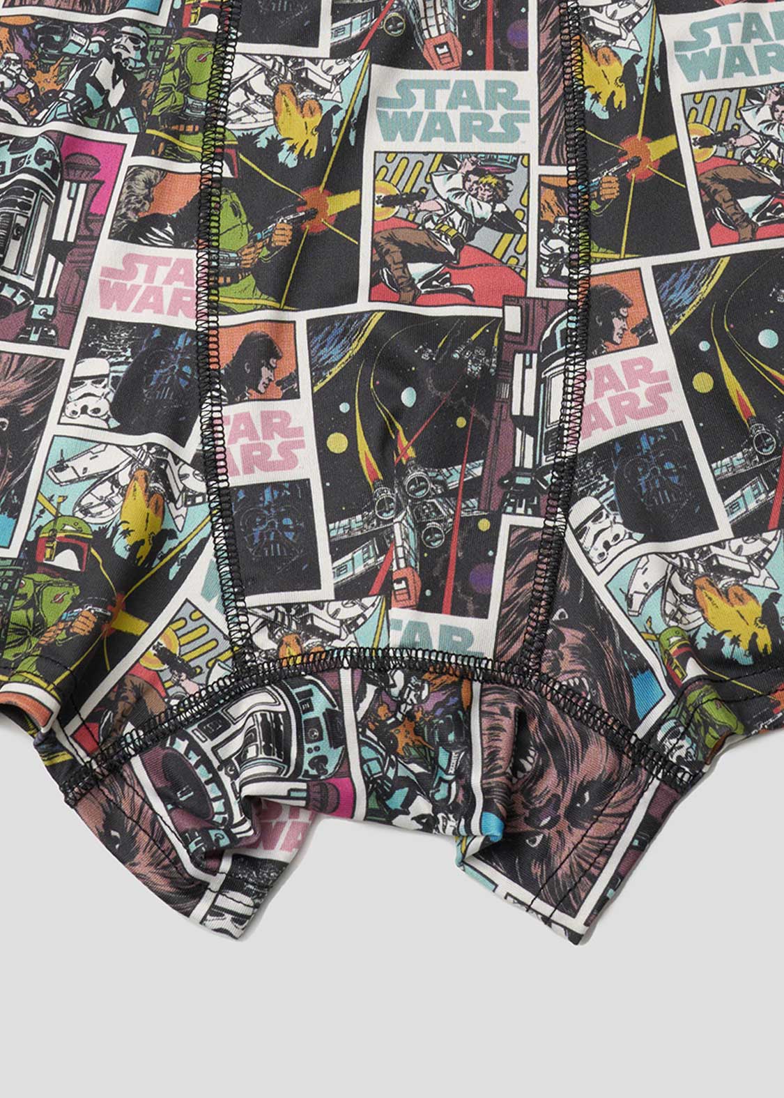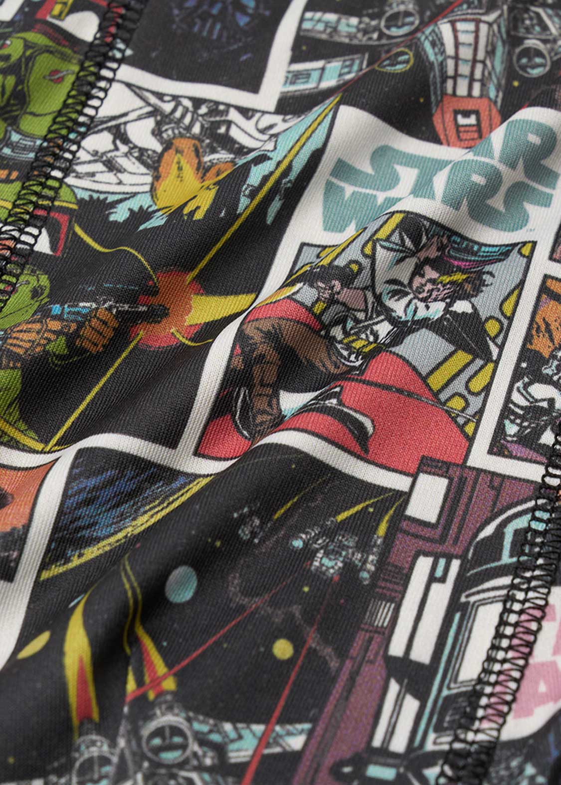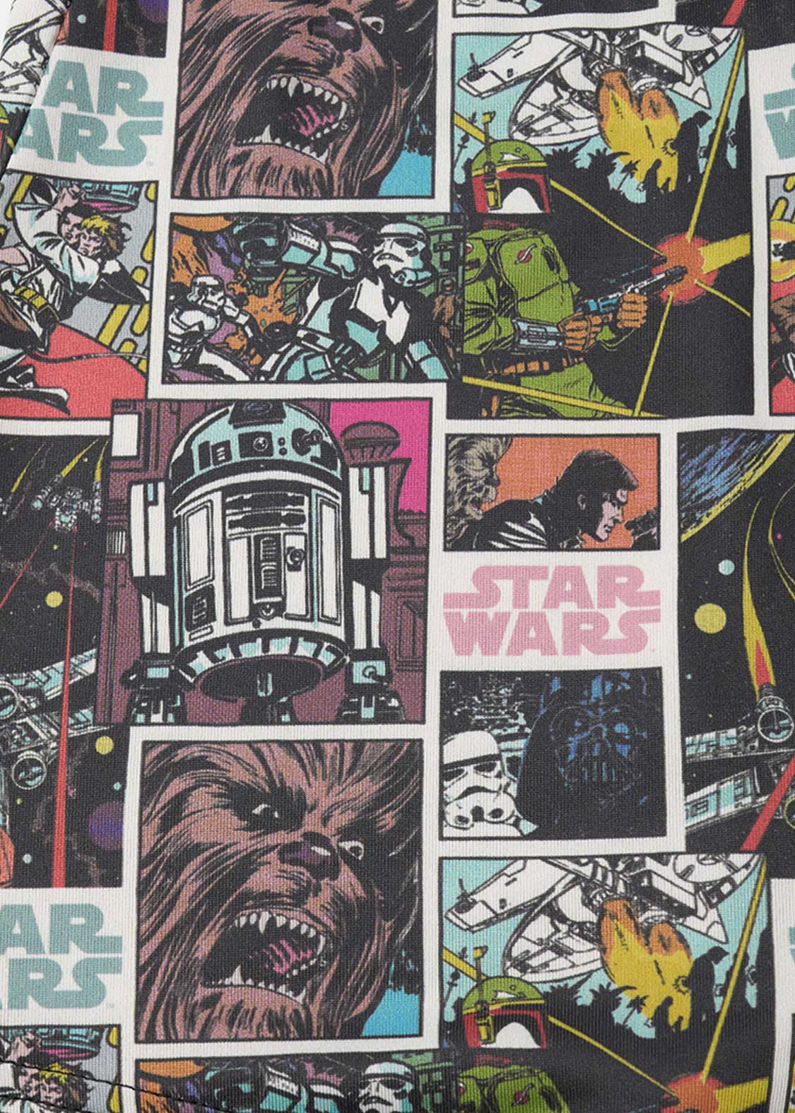 R2-D2やチューバッカ、スターファイターなどをコミック風に描いたパターン柄のデザインです。