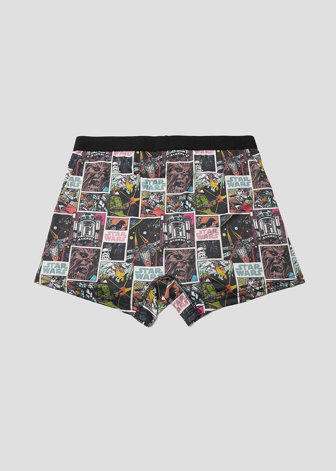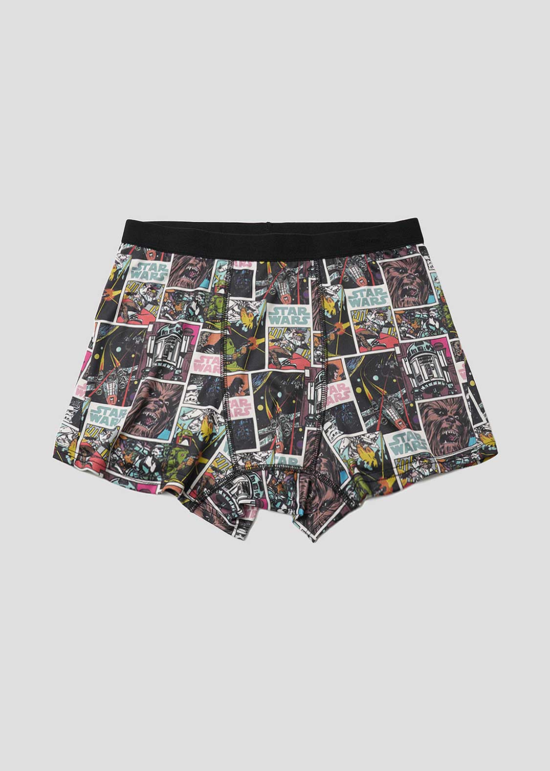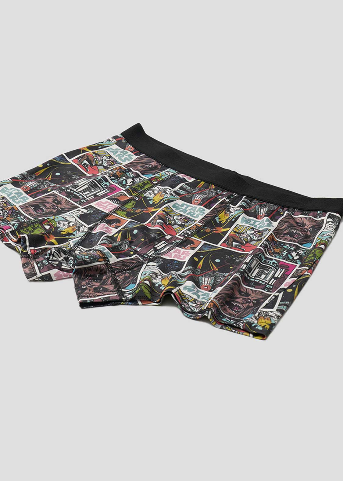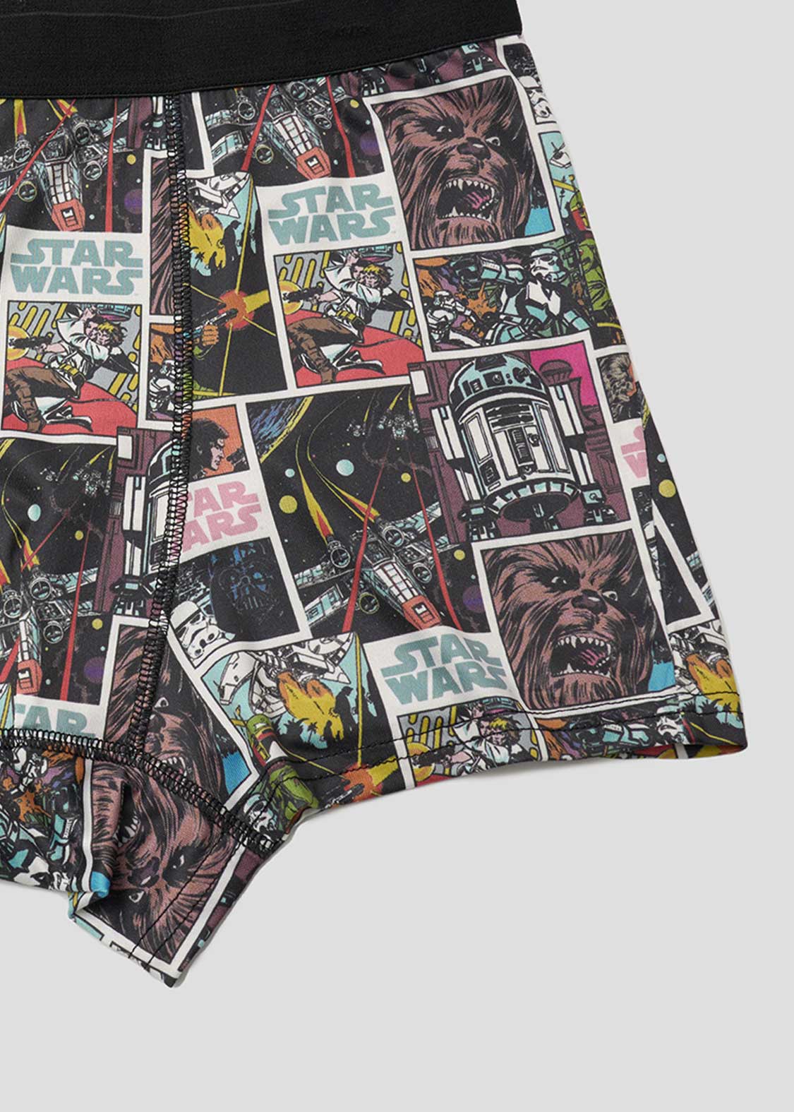 R2-D2やチューバッカ、スターファイターなどをコミック風に描いたパターン柄のデザインです。