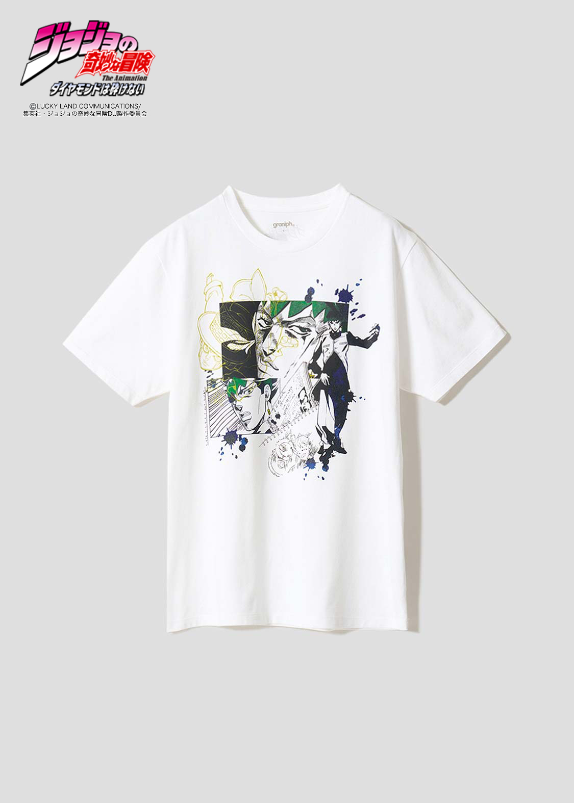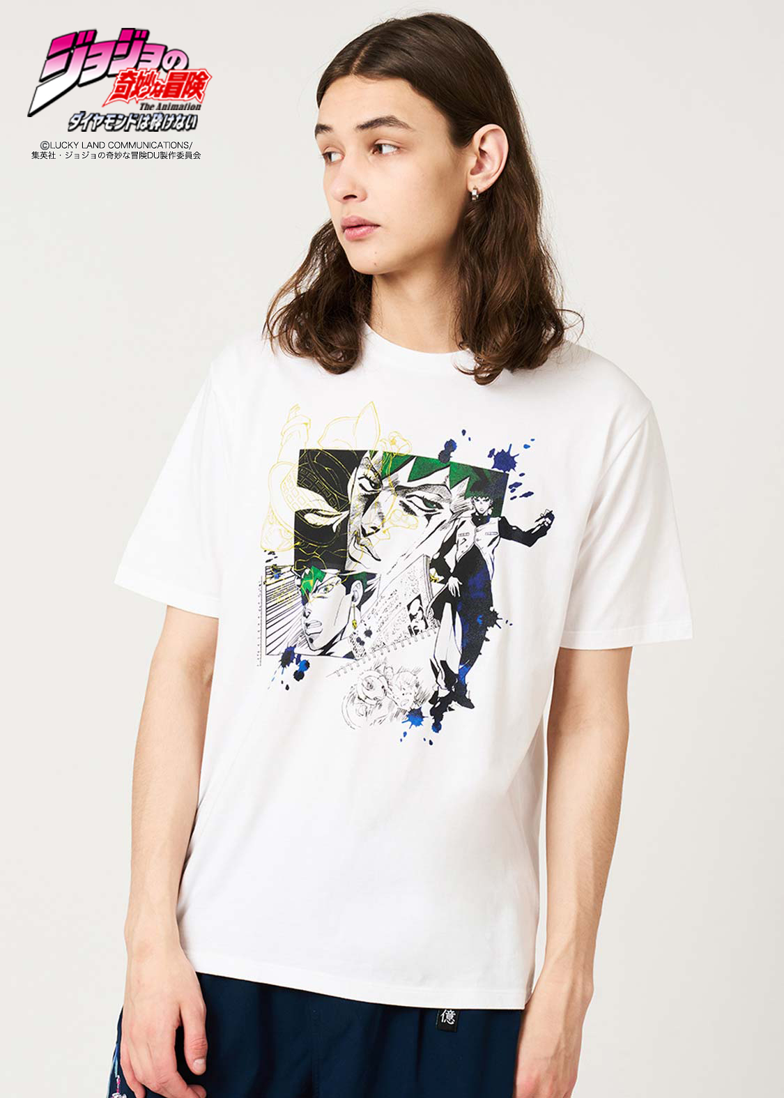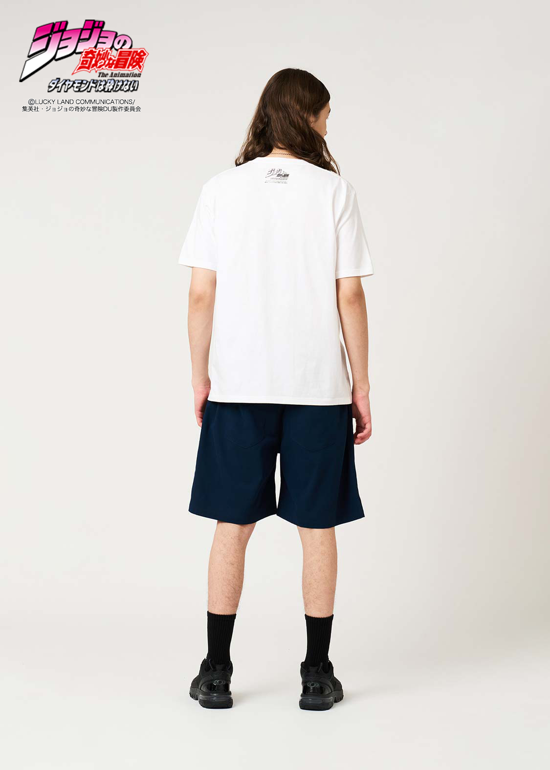 アニメ『ジョジョの奇妙な冒険 ダイヤモンドは砕けない』より。杜王町に住む人気漫画家・岸辺露伴の印象的なポージングをはじめ、スタンド「ヘブンズ・ドアー」、そして彼が描いたスケッチなどを組み合わせたデザインです。リアリティを追求し新たなアイデアのために手段を選ばない---そんな露伴の魅力があふれています。