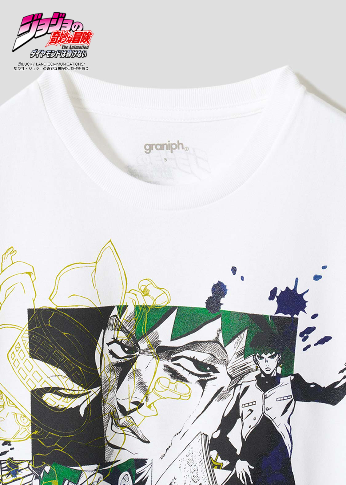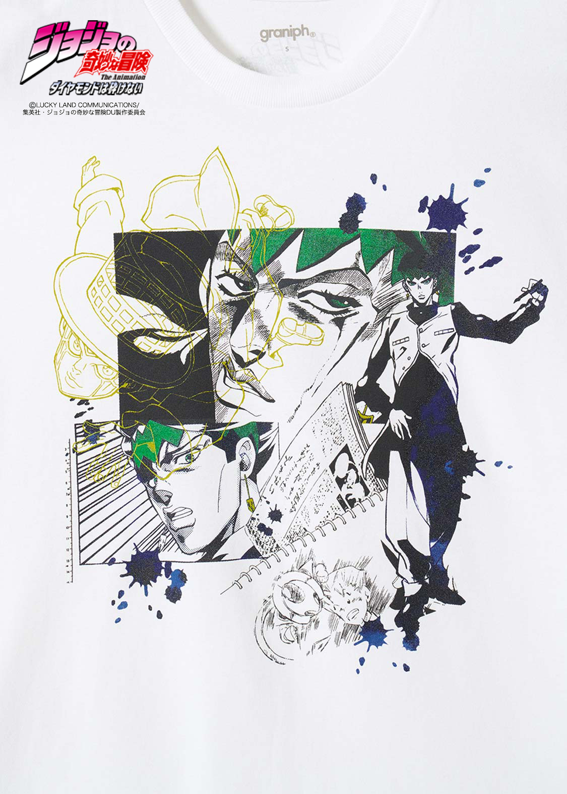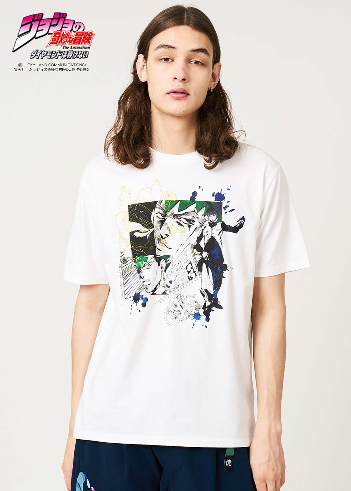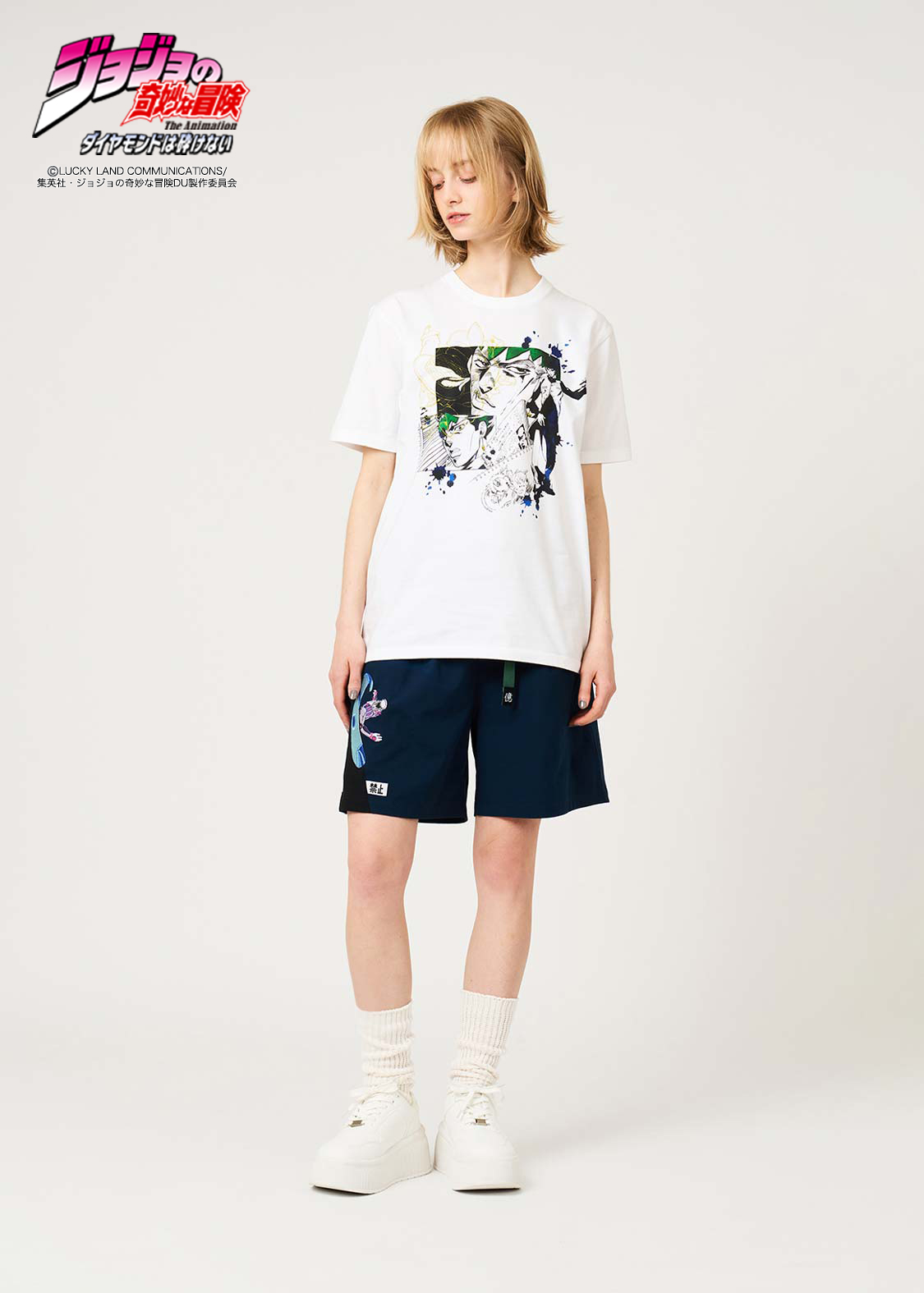 アニメ『ジョジョの奇妙な冒険 ダイヤモンドは砕けない』より。杜王町に住む人気漫画家・岸辺露伴の印象的なポージングをはじめ、スタンド「ヘブンズ・ドアー」、そして彼が描いたスケッチなどを組み合わせたデザインです。リアリティを追求し新たなアイデアのために手段を選ばない---そんな露伴の魅力があふれています。