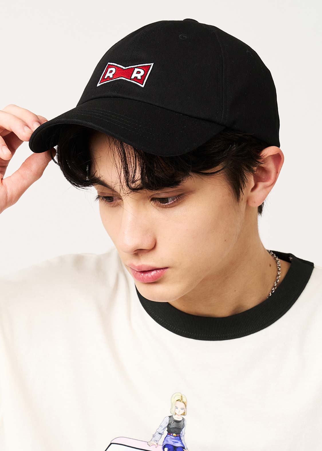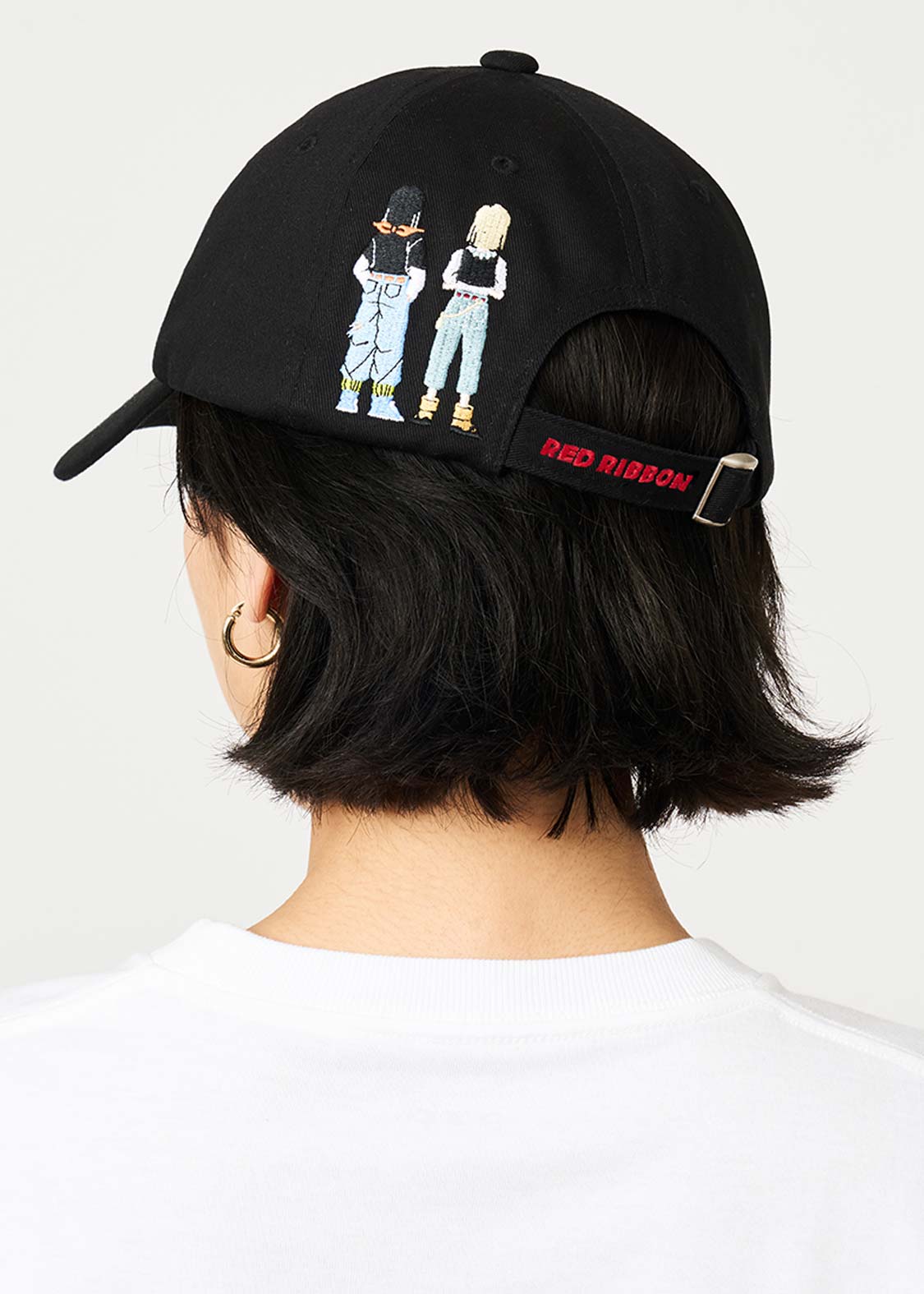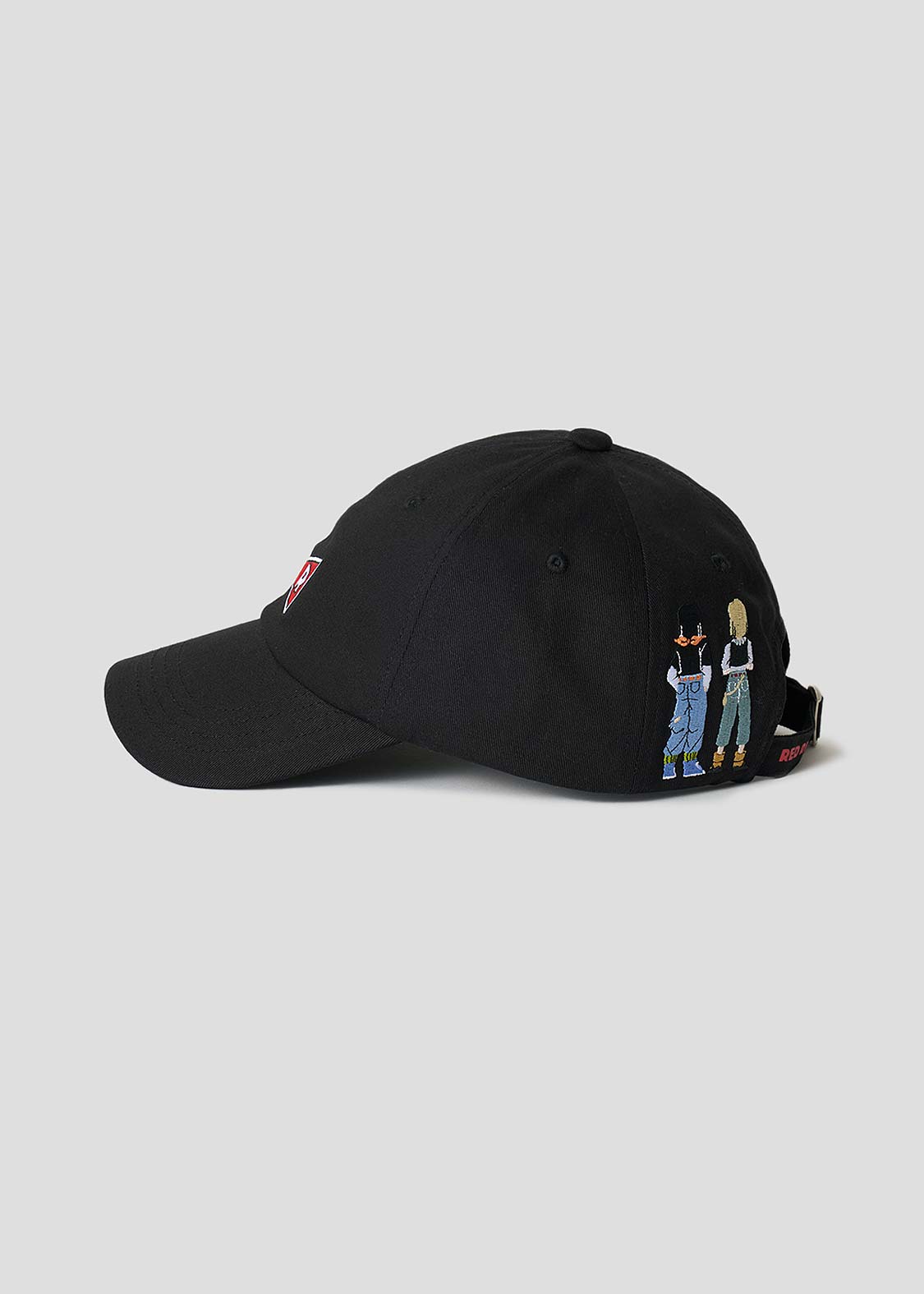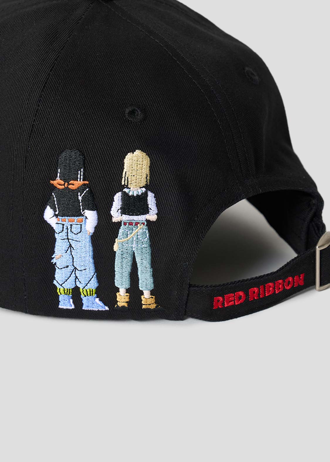 フロントはレッドリボン軍のマーク、バックは人造人間17号と18号の後ろ姿を刺繍したデザイン。サイズ調節の紐にはRED RIBBONの文字をプリントしました。
