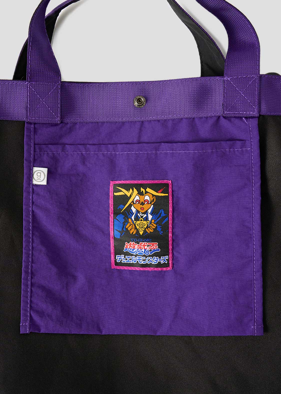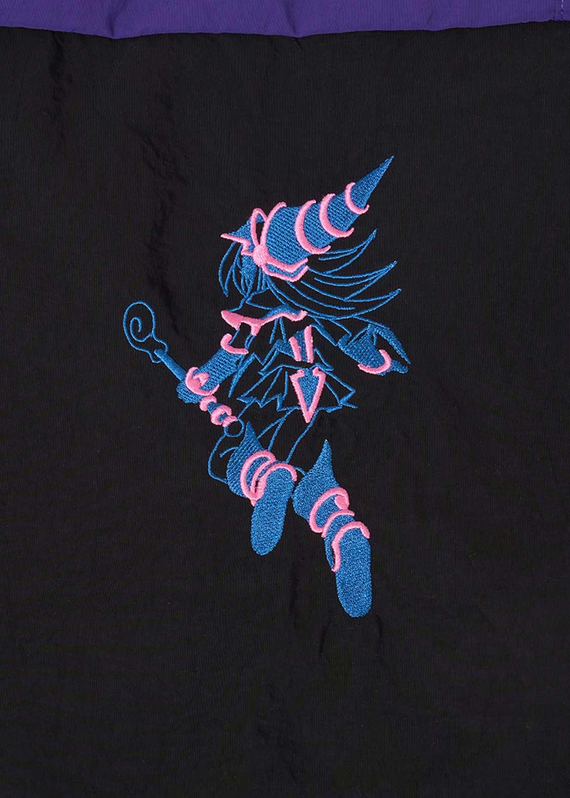 闇遊戯のデッキの核となるエースモンスター「ブラック・マジシャン」をポケットに刺繍し、その弟子である「ブラック・マジシャン・ガール」を、ポケットをめくった位置に刺繍したデザインです。ポケットの内側には、「千年パズル」を手にした遊戯を織りネームであしらっています。