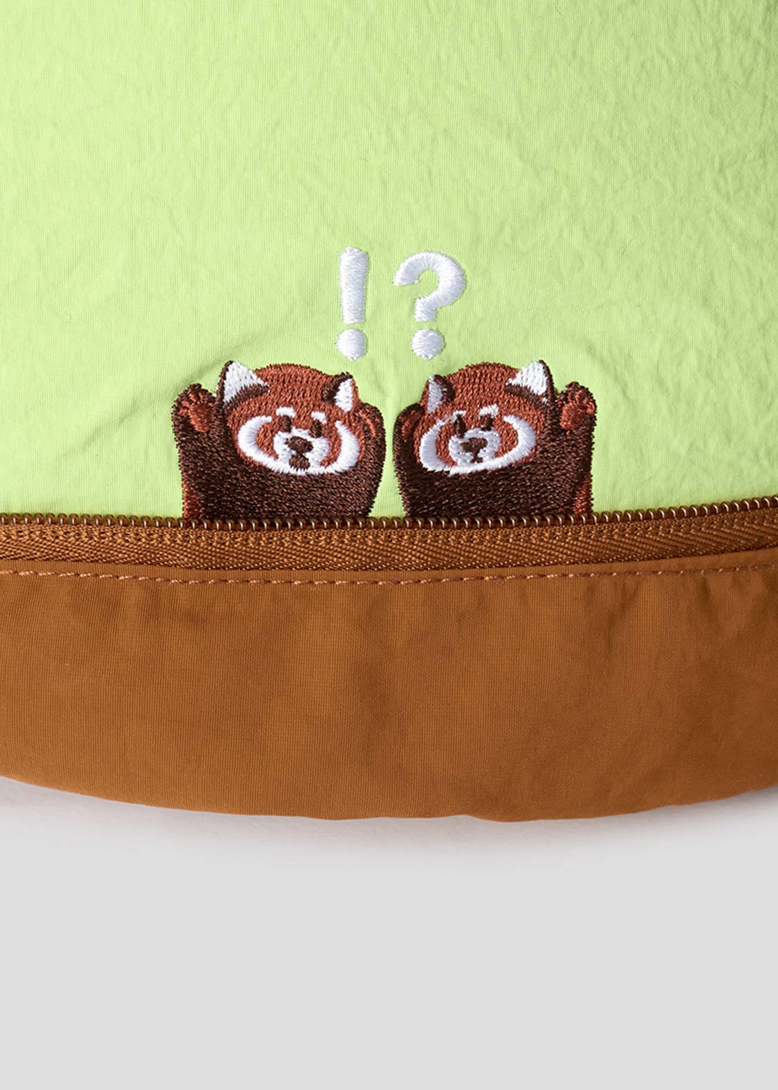 レッサーパンダの「?」と「!」の表情を、遊び心たっぷりにデザイン。ちょっとしたリアクションを切り取った、!?マークがアクセントのグラフィックです。