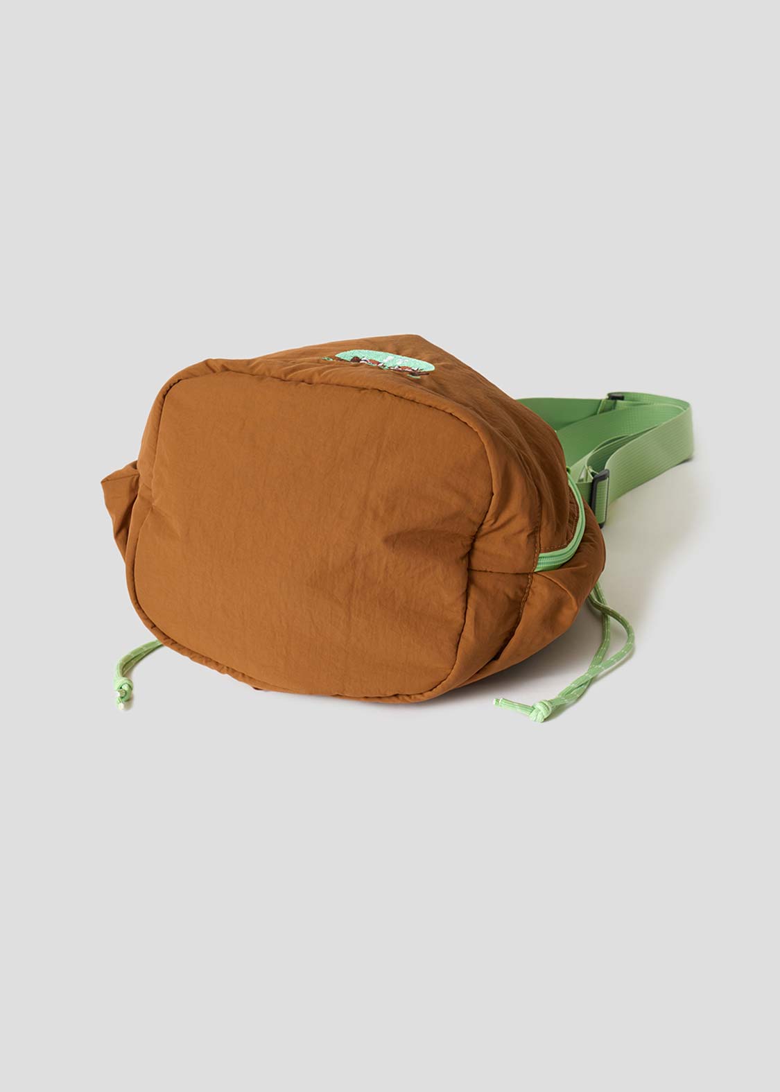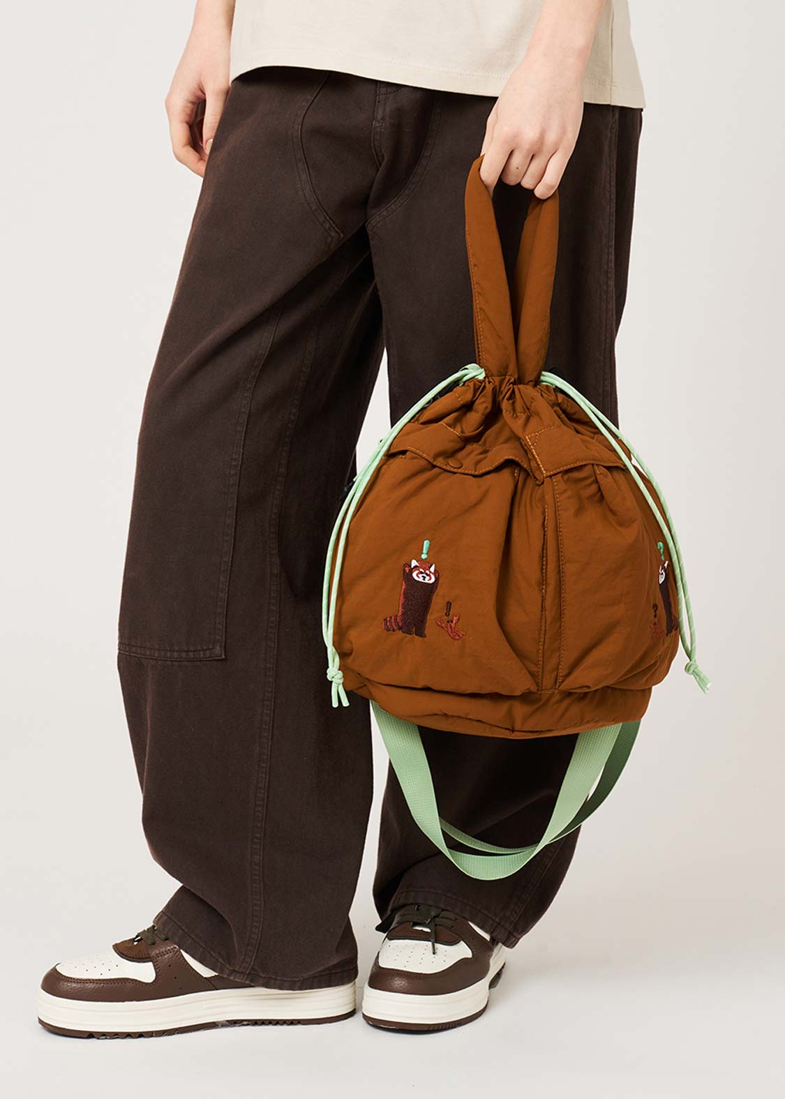 ・光沢感のあるポリエステル生地を使用した巾着バッグ。