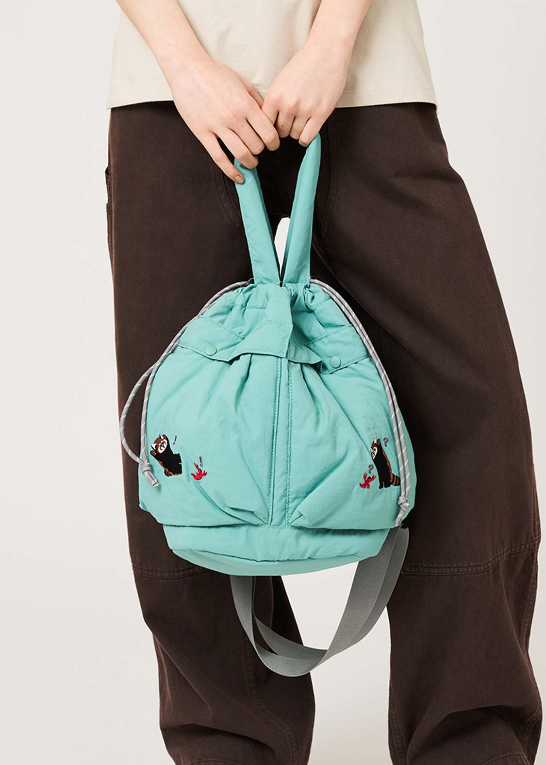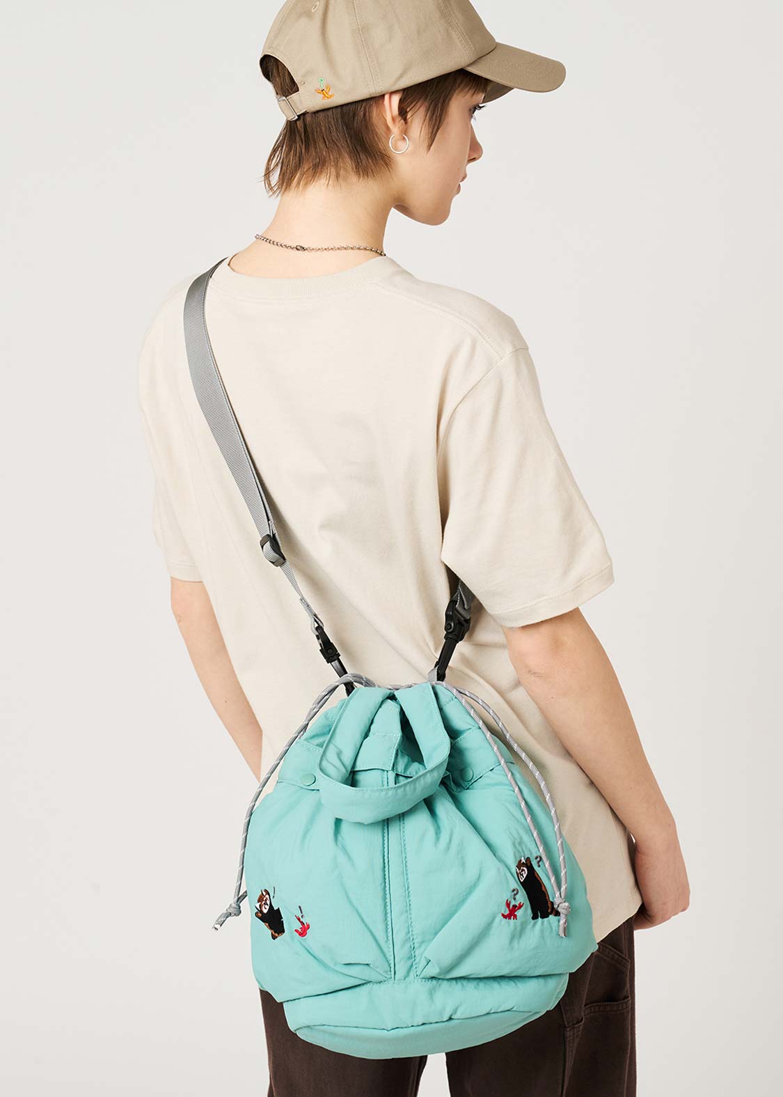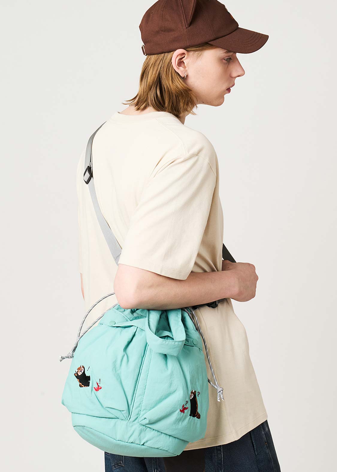 ・光沢感のあるポリエステル生地を使用した巾着バッグ。