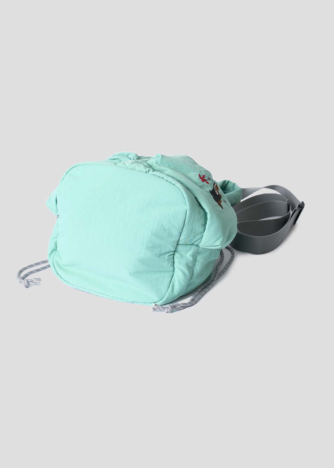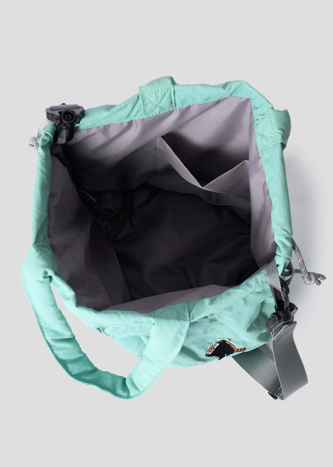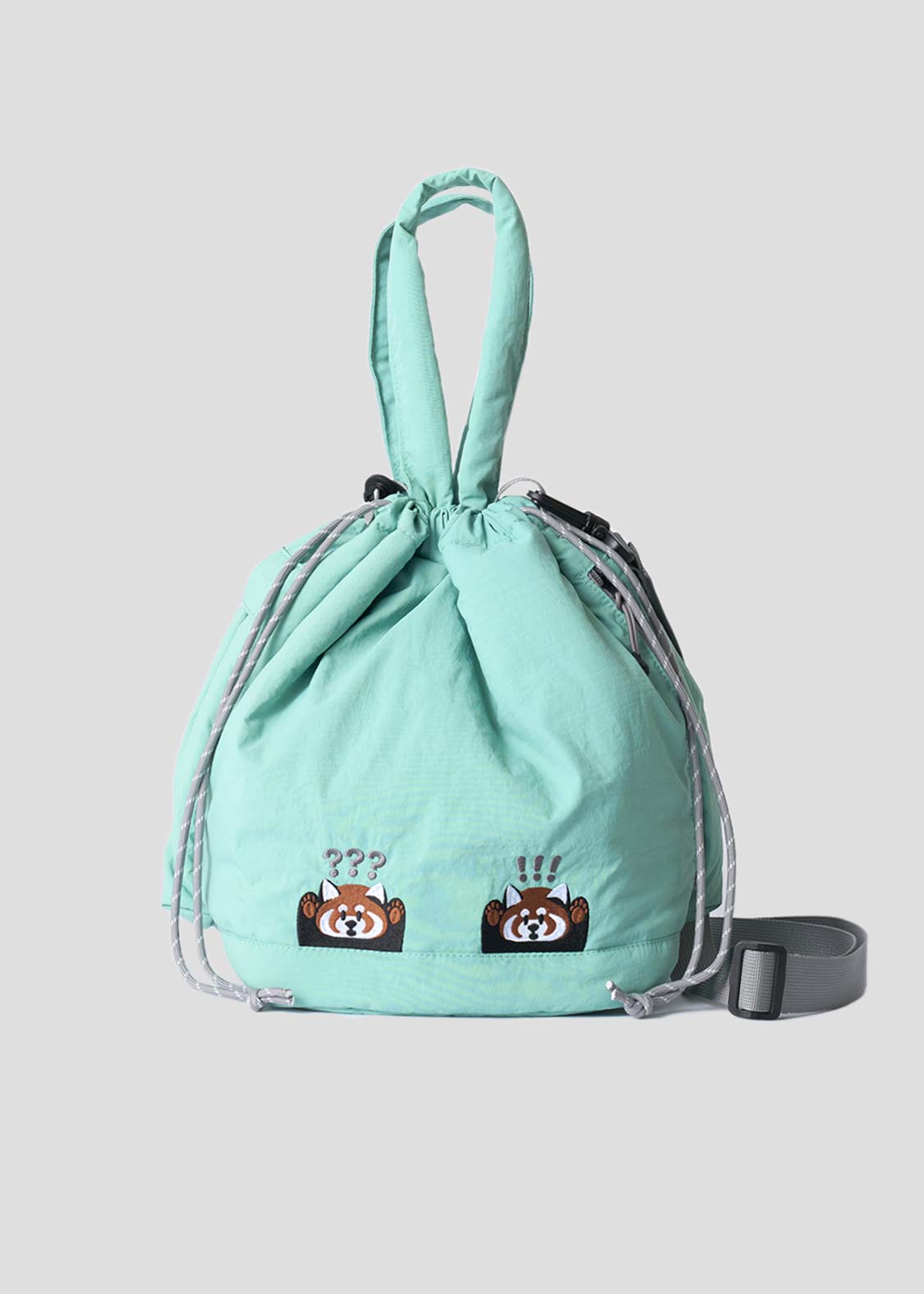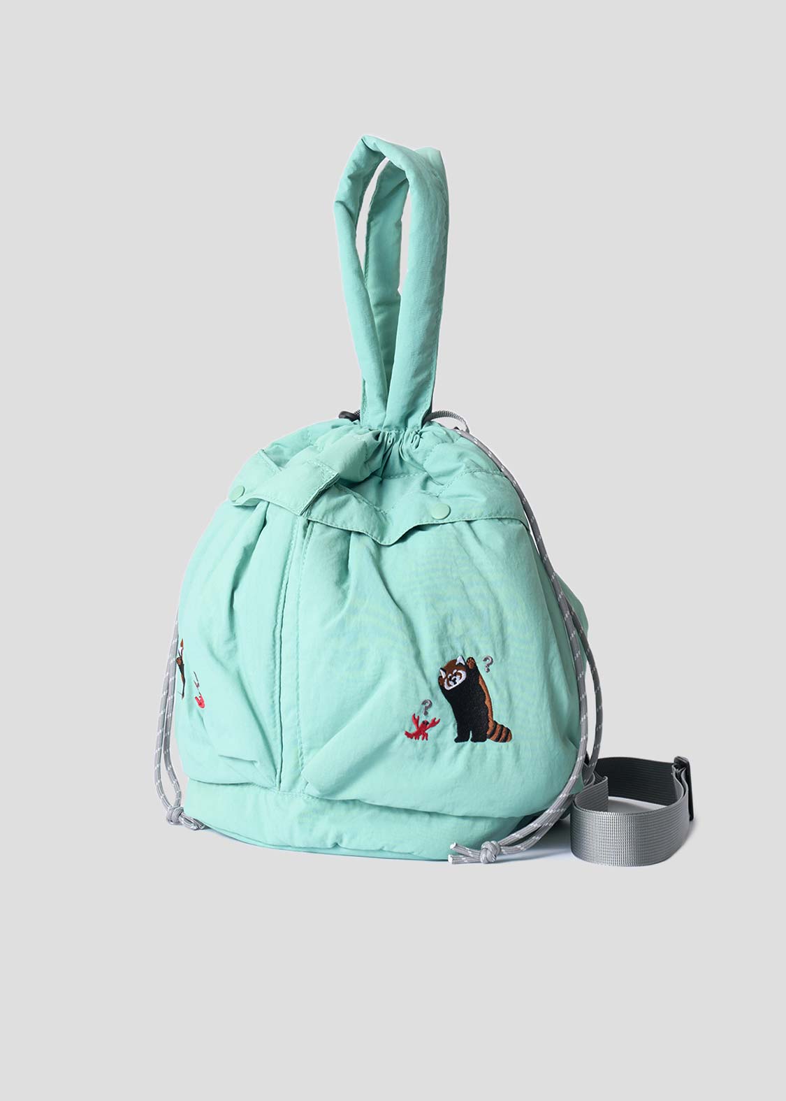 ・光沢感のあるポリエステル生地を使用した巾着バッグ。