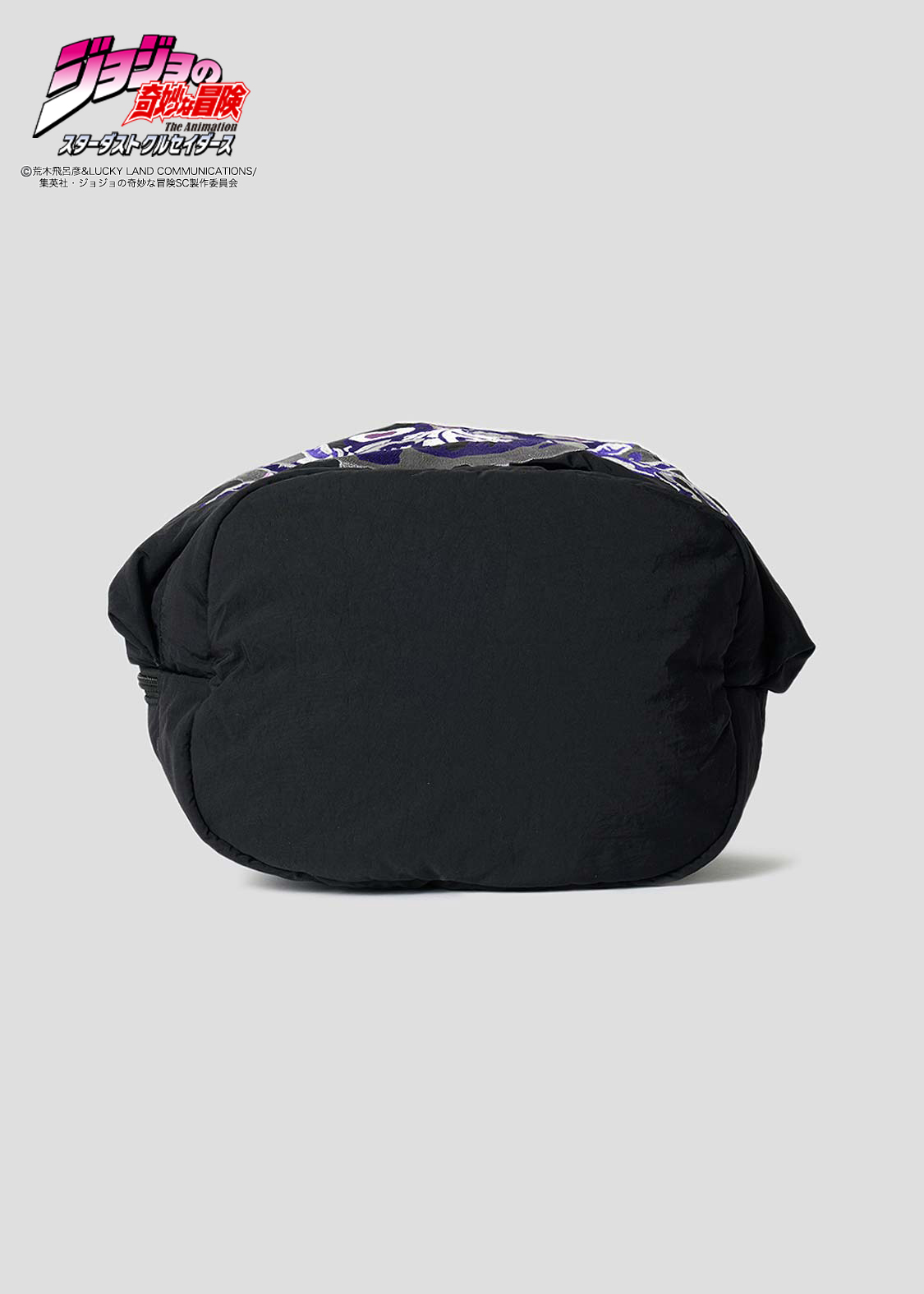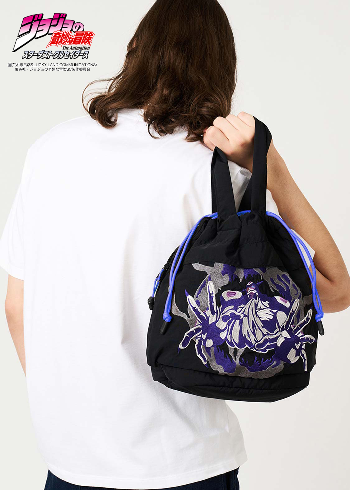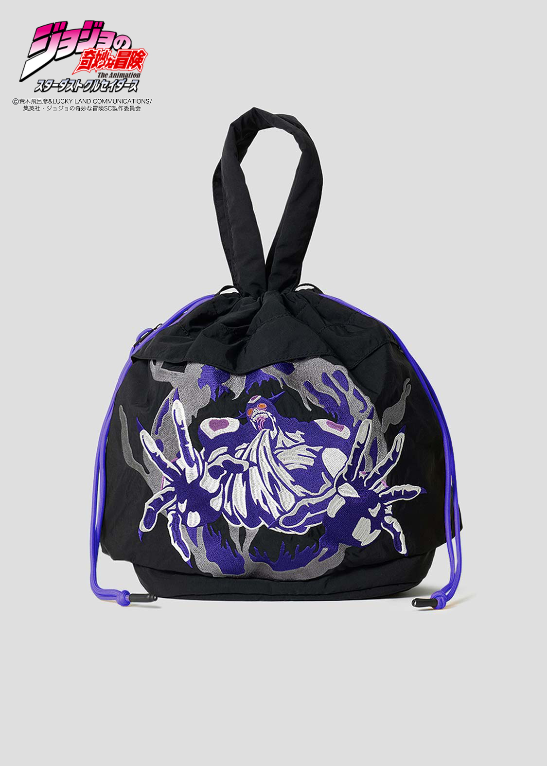 アニメ『ジョジョの奇妙な冒険 スターダストクルセイダース』より。ヴァニラ・アイスとの戦いをモチーフにしたデザインでず。フロントにはスタンド「クリーム」を刺繍であしらい、その内側には口の中から顔をのぞかせるヴァニラ・アイスをプリント。バックにはポルナレフのスタンド「シルバーチャリオッツ」を刺繍で表現しました。さらに、内ポケットにプリントされたアブドゥルとイギーのシルエットも印象的です。