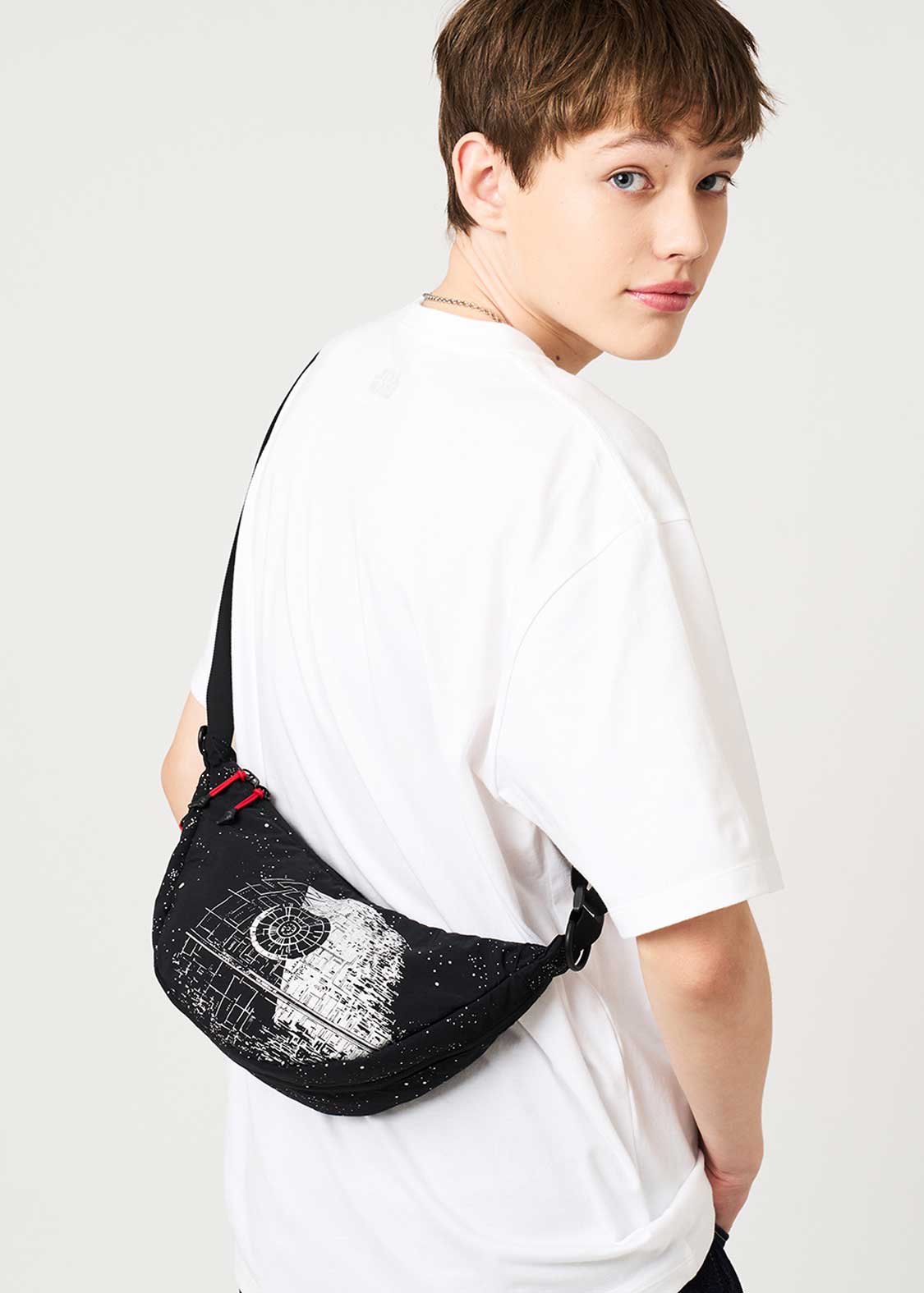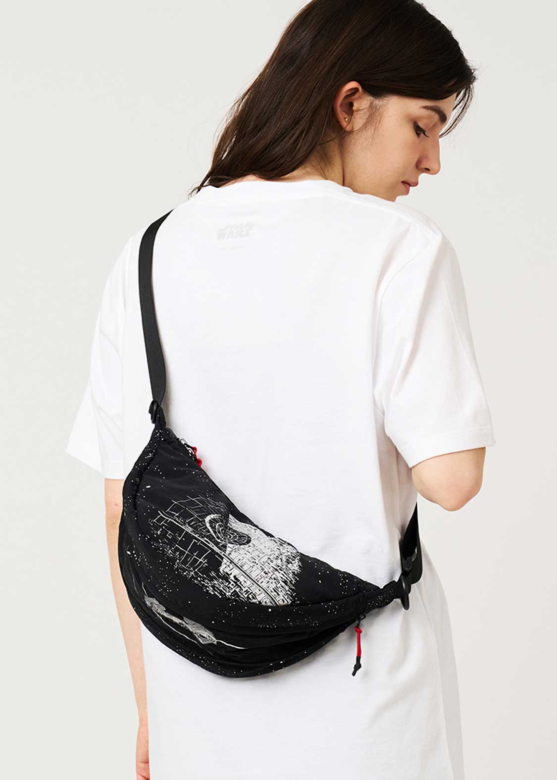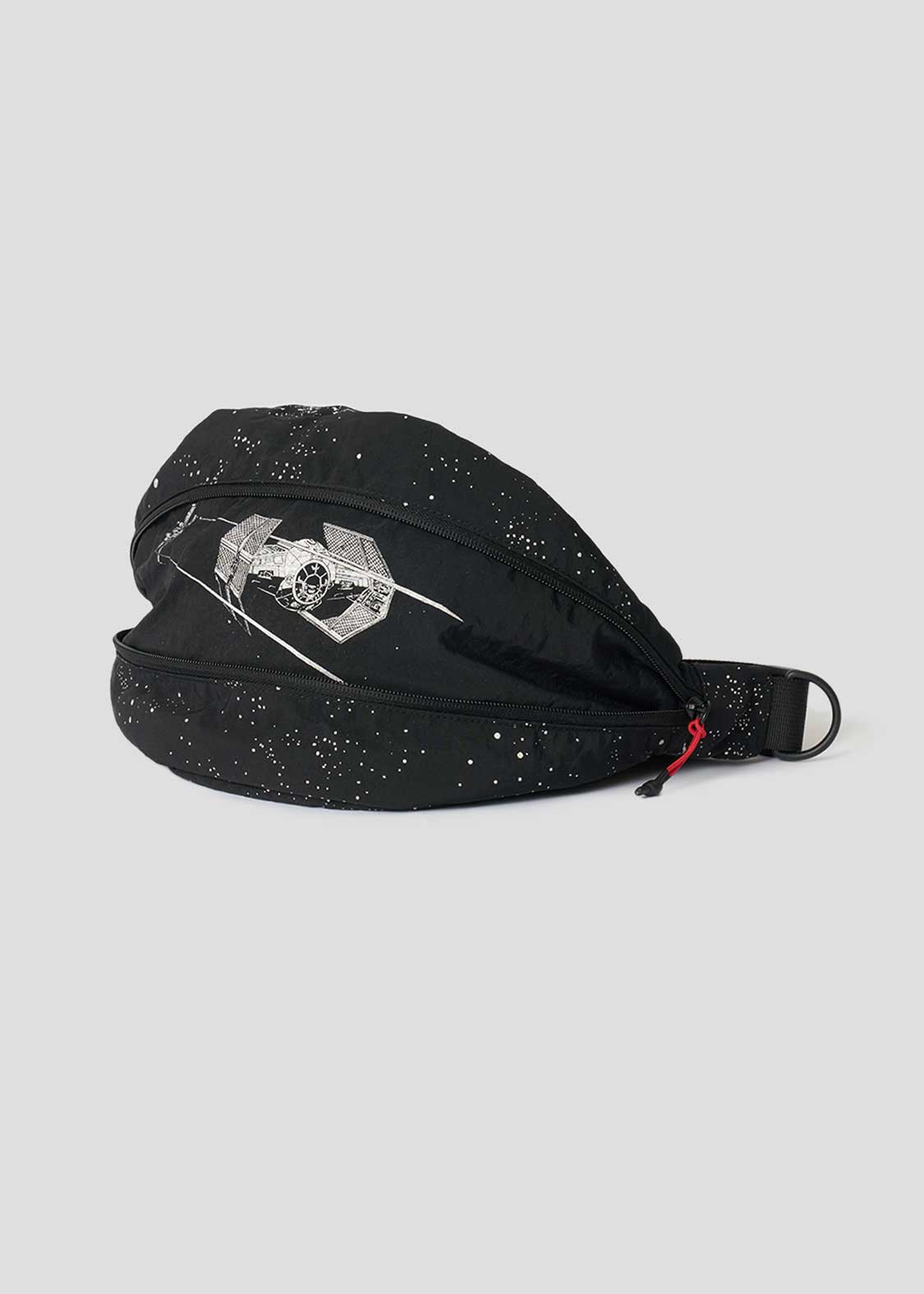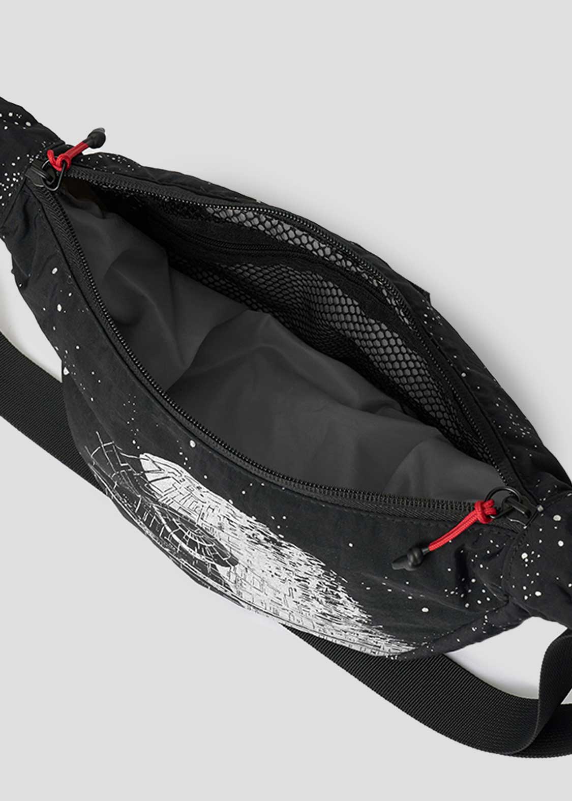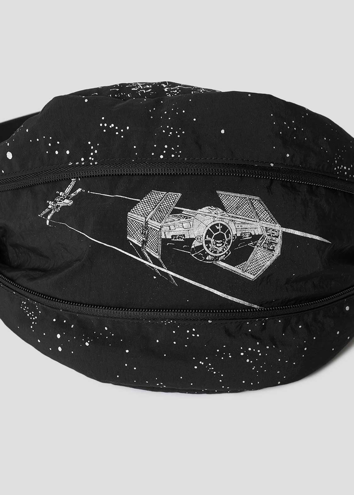 帝国の最終兵器であるデス・スターと宇宙空間をアルミ粉プリントで表現したデザイン。底のファスナーを開けると、Xウイング・スターファイターとタイ・アドバンストx1が現れるギミックもポイントです。『STAR WARS』ロゴは織りネームであしらわれています。