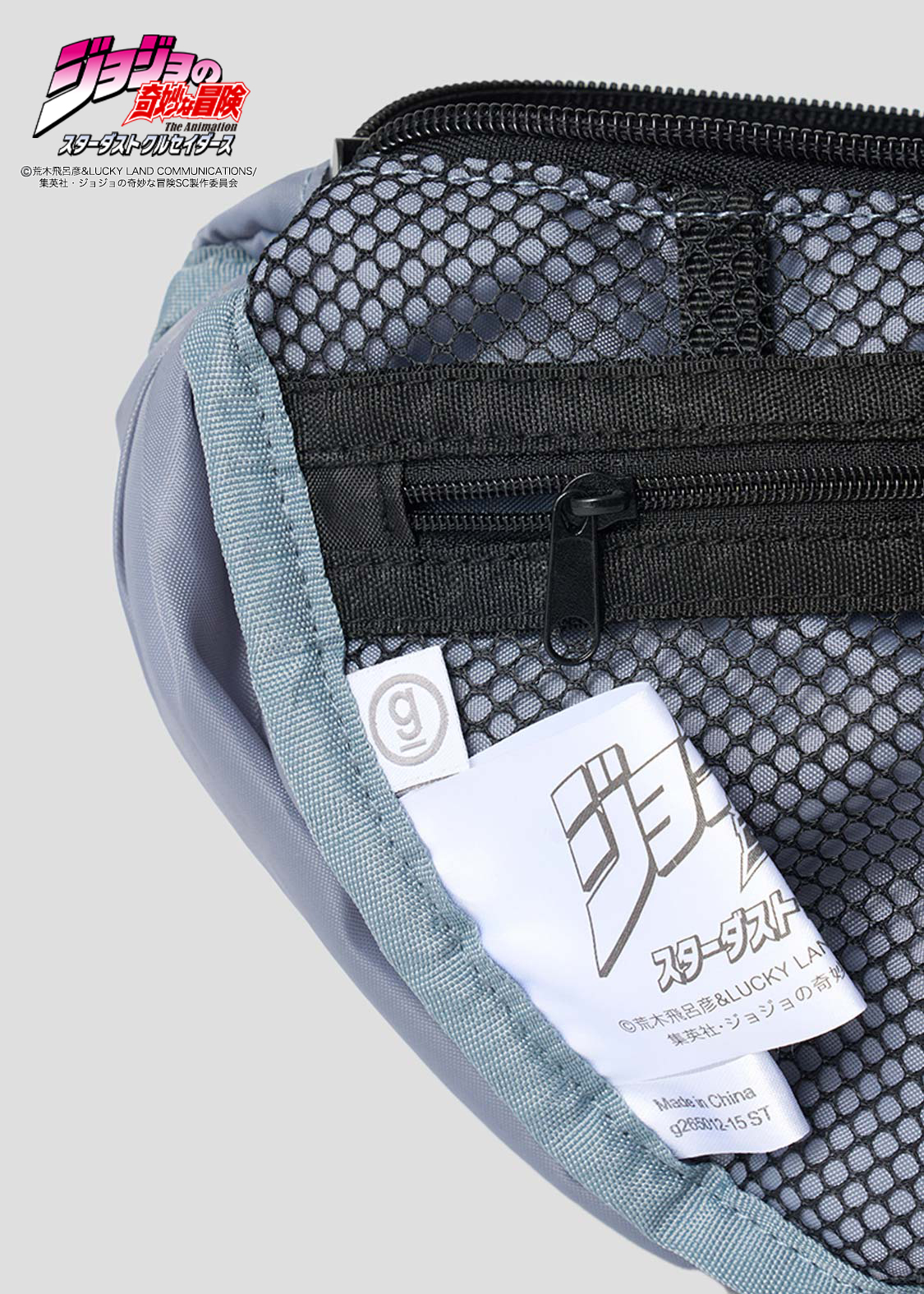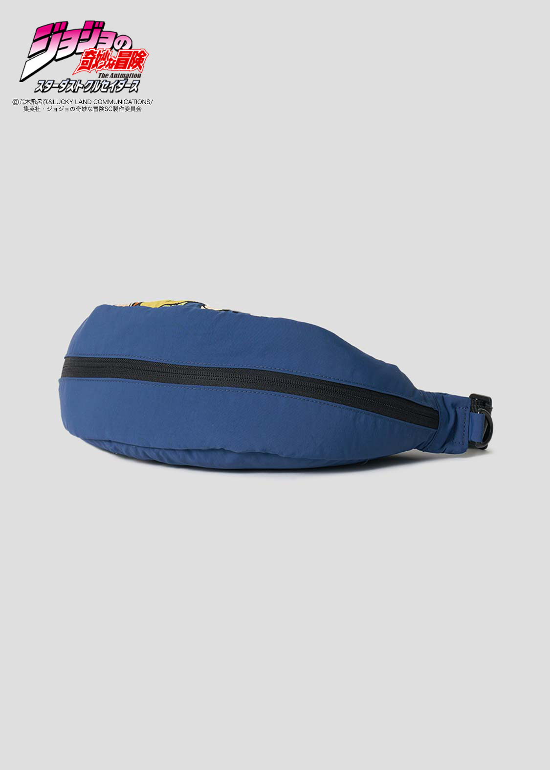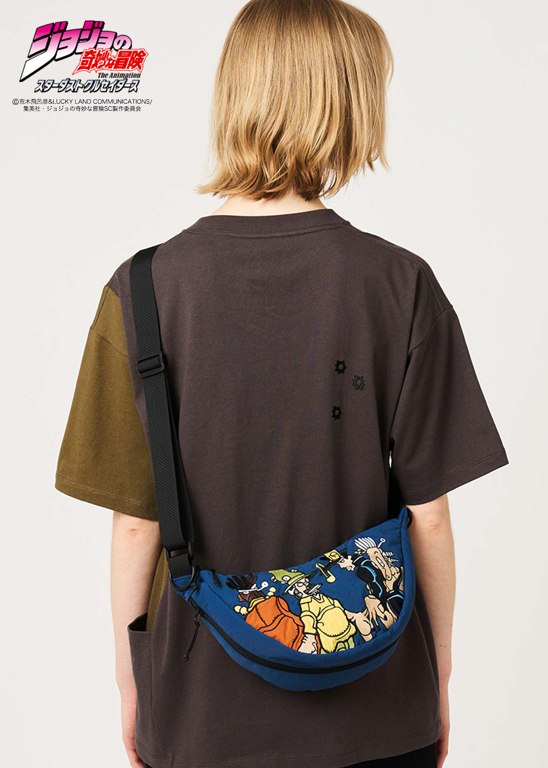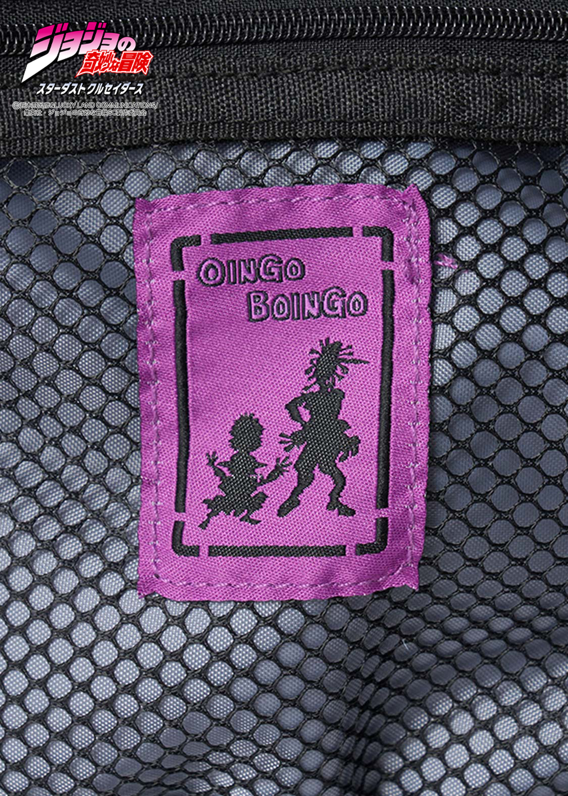 アニメ『ジョジョの奇妙な冒険 スターダストクルセイダース』より。仲良し兄弟のオインゴとボインゴ。弟ボインゴのスタンド「トト神」は100%の確率で近い未来を予知し漫画本に描き出します。その能力で描かれた承太郎、イギー、ジョセフ、ポルナレフ、アブドゥルを刺繍とパッチワークで表現したデザイン。底のファスナーを開けると、オインゴとボインゴが現れるギミックもポイントです。内側には本の表紙をイメージした織りネームをあしらっています。
