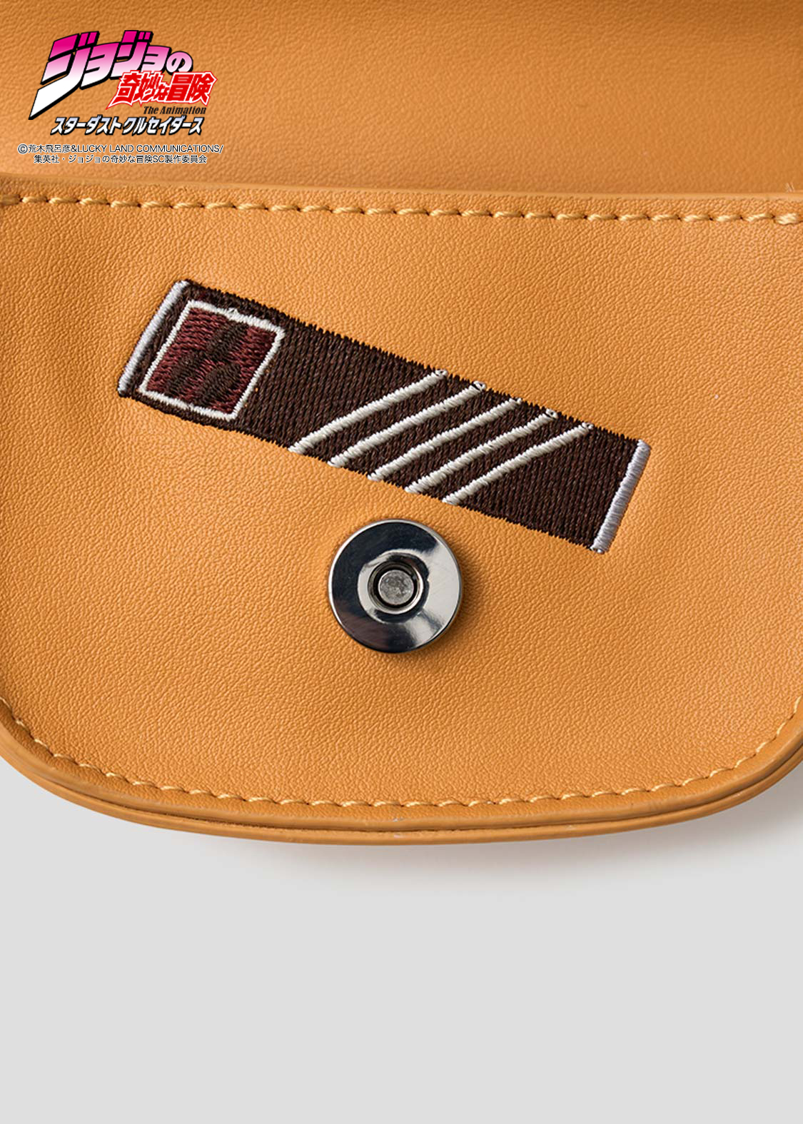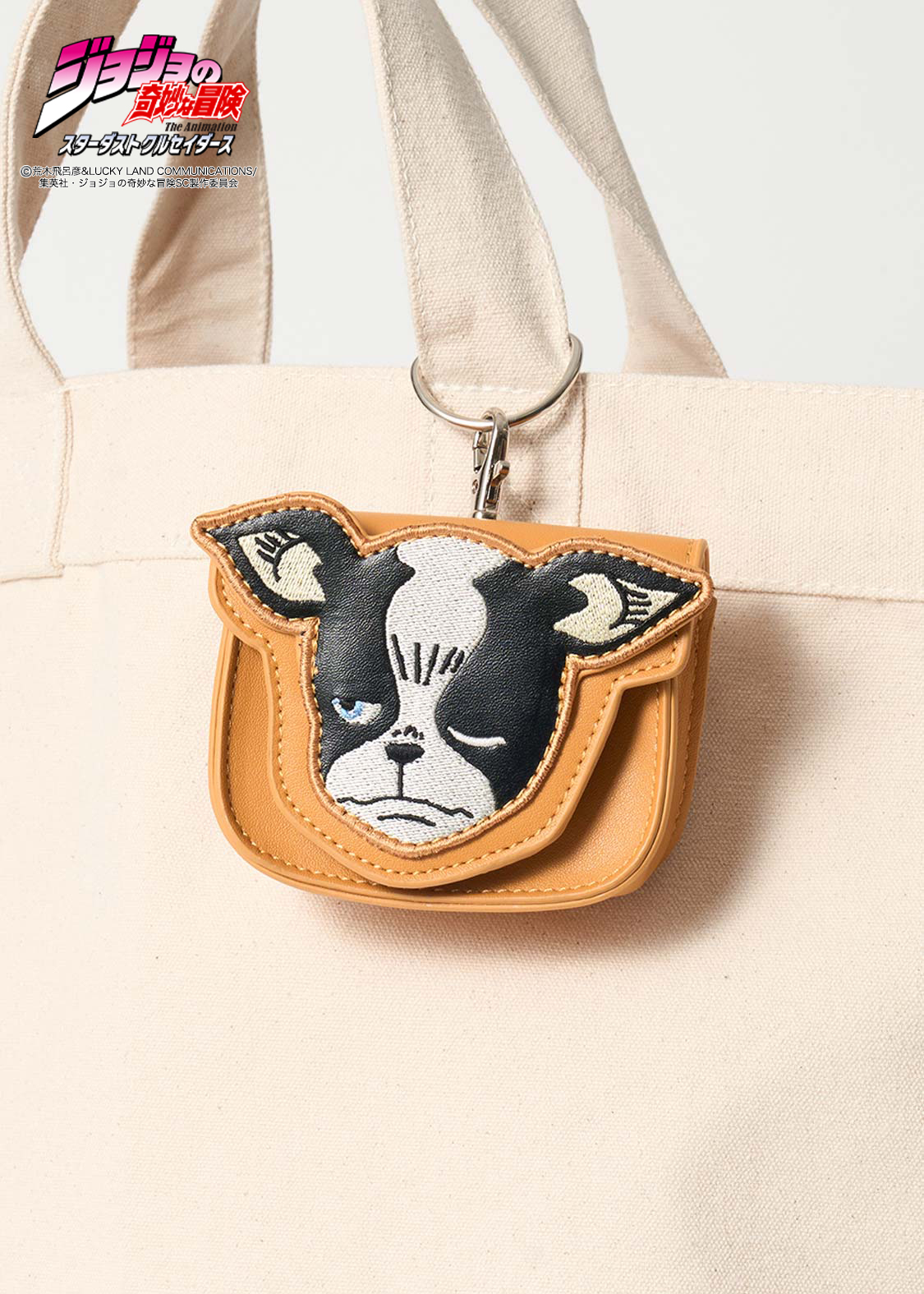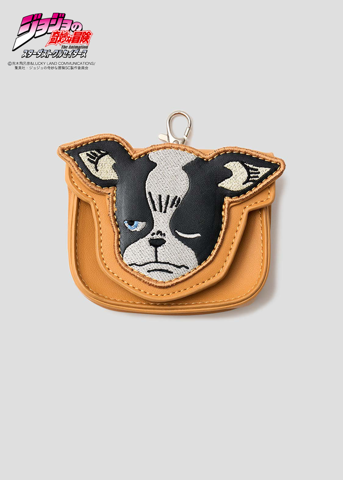 アニメ『ジョジョの奇妙な冒険 スターダストクルセイダース』より。ボストン・テリアのスタンド使いイギーの顔をアップリケと刺繍で表現したデザイン。内側には、大好物のコーヒー味のガムの刺繍をあしらっています。