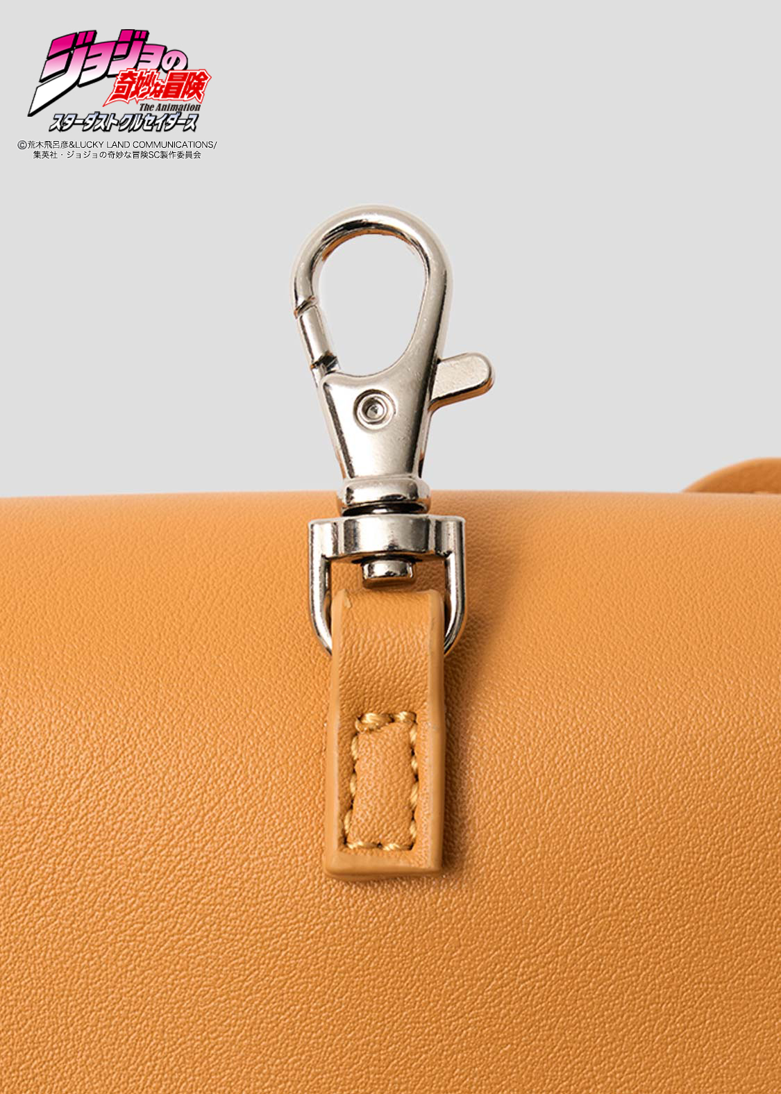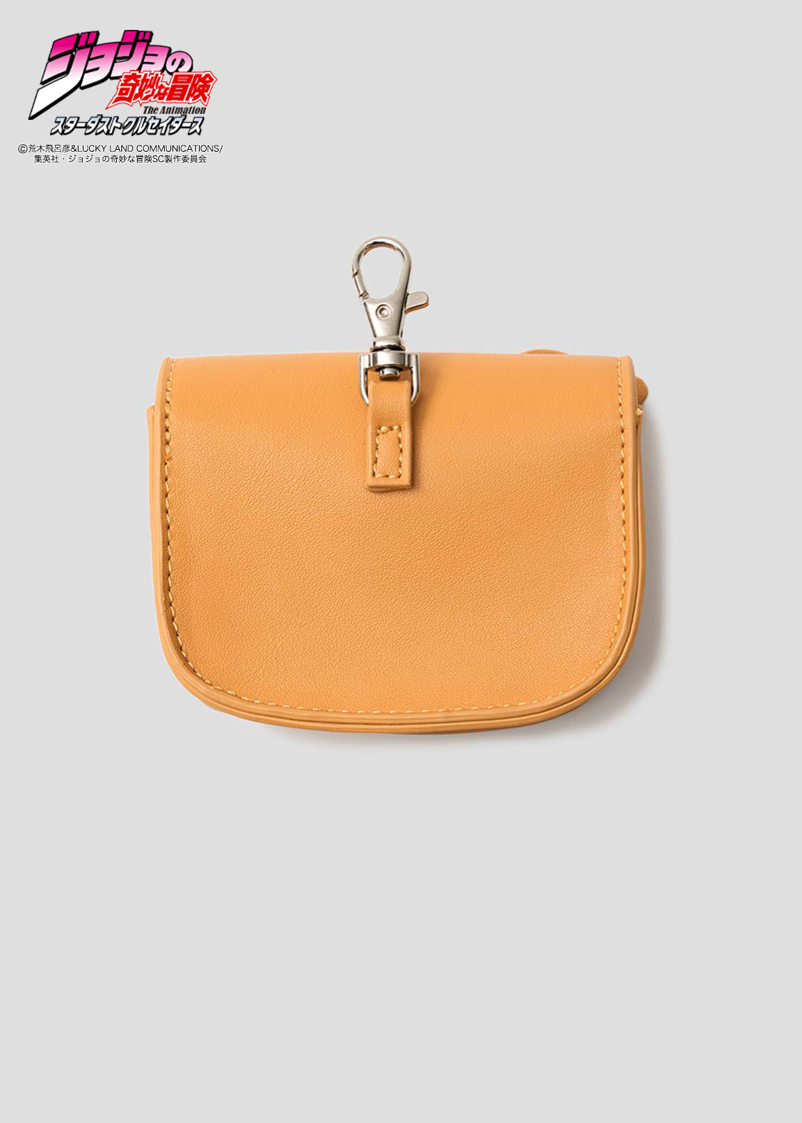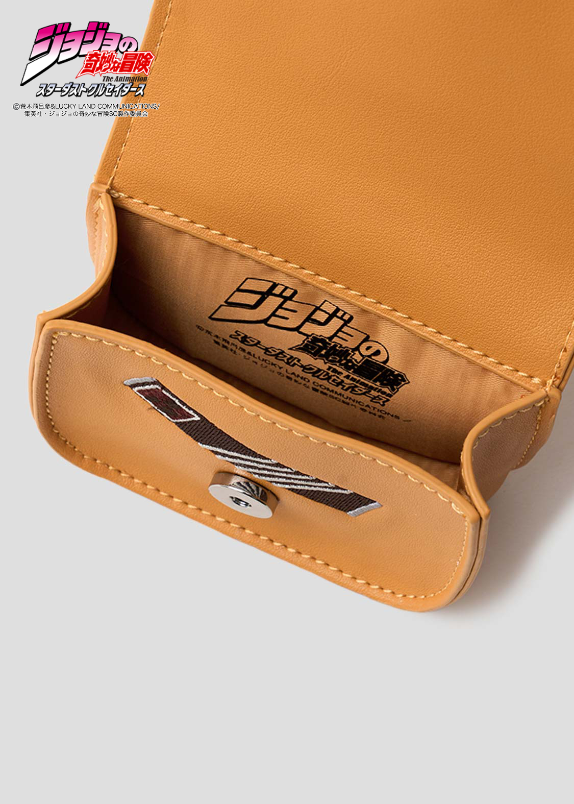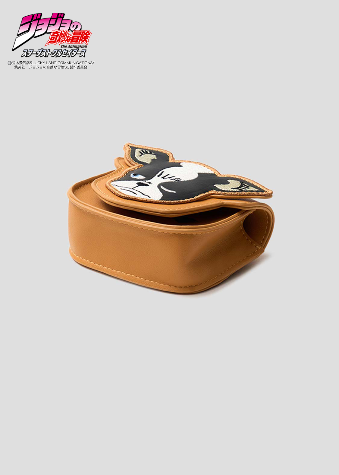 アニメ『ジョジョの奇妙な冒険 スターダストクルセイダース』より。ボストン・テリアのスタンド使いイギーの顔をアップリケと刺繍で表現したデザイン。内側には、大好物のコーヒー味のガムの刺繍をあしらっています。