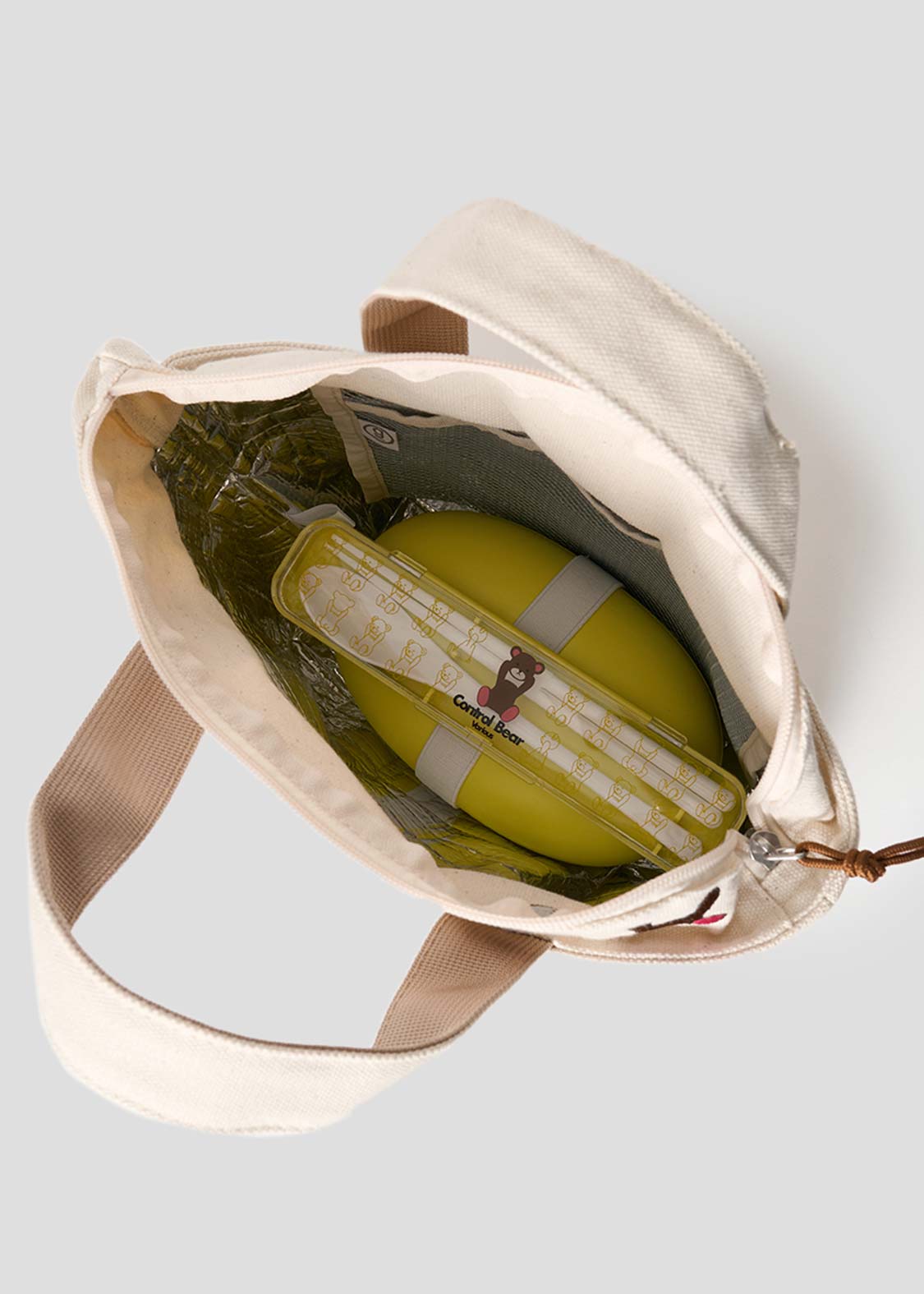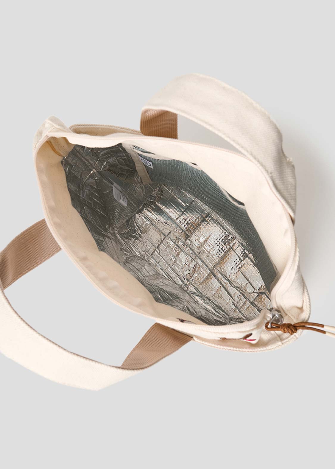 ・表生地にコットンキャンバス素材、内側生地に保冷生地を使用したランチバッグ。