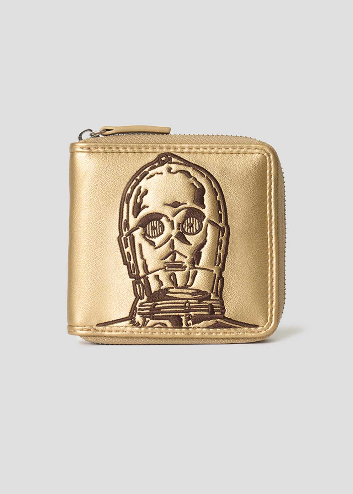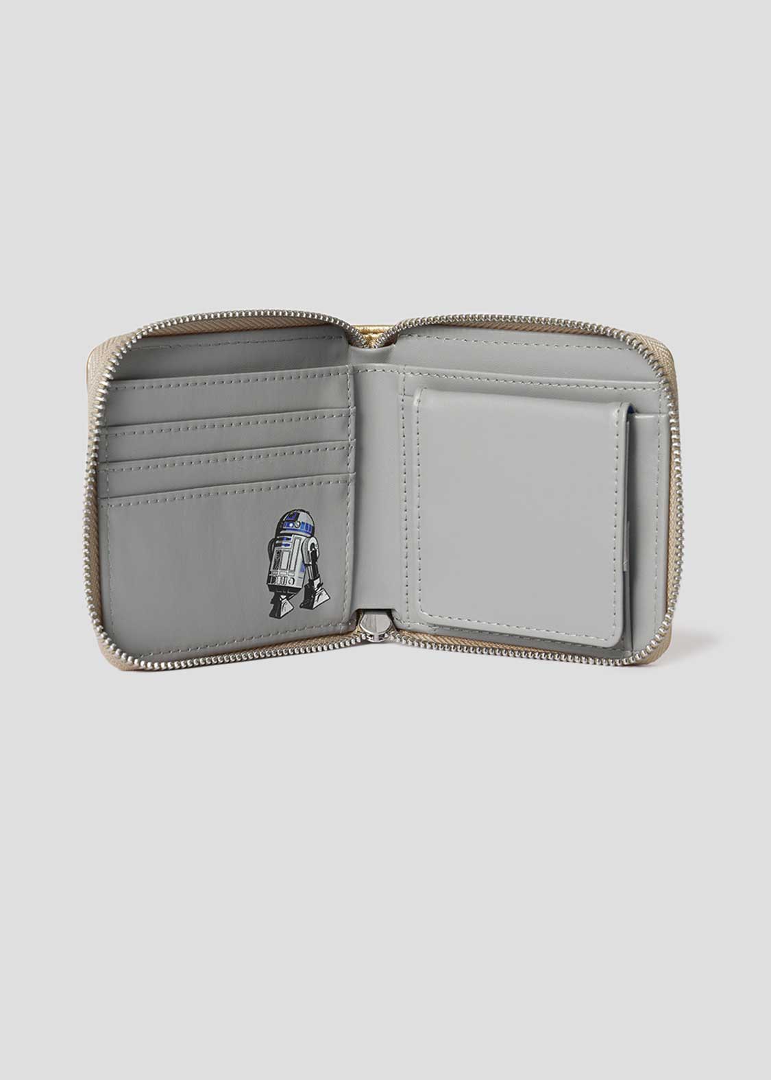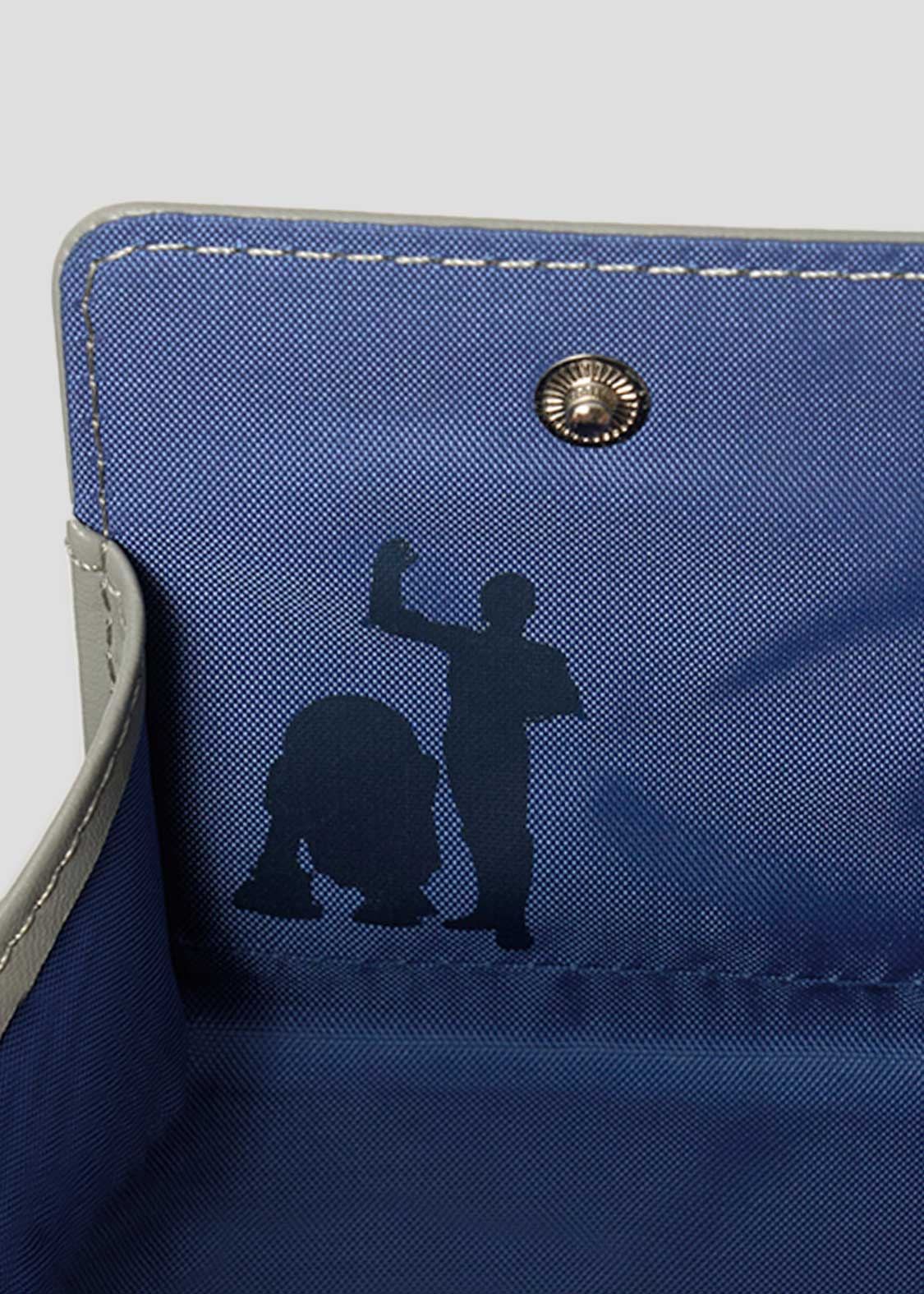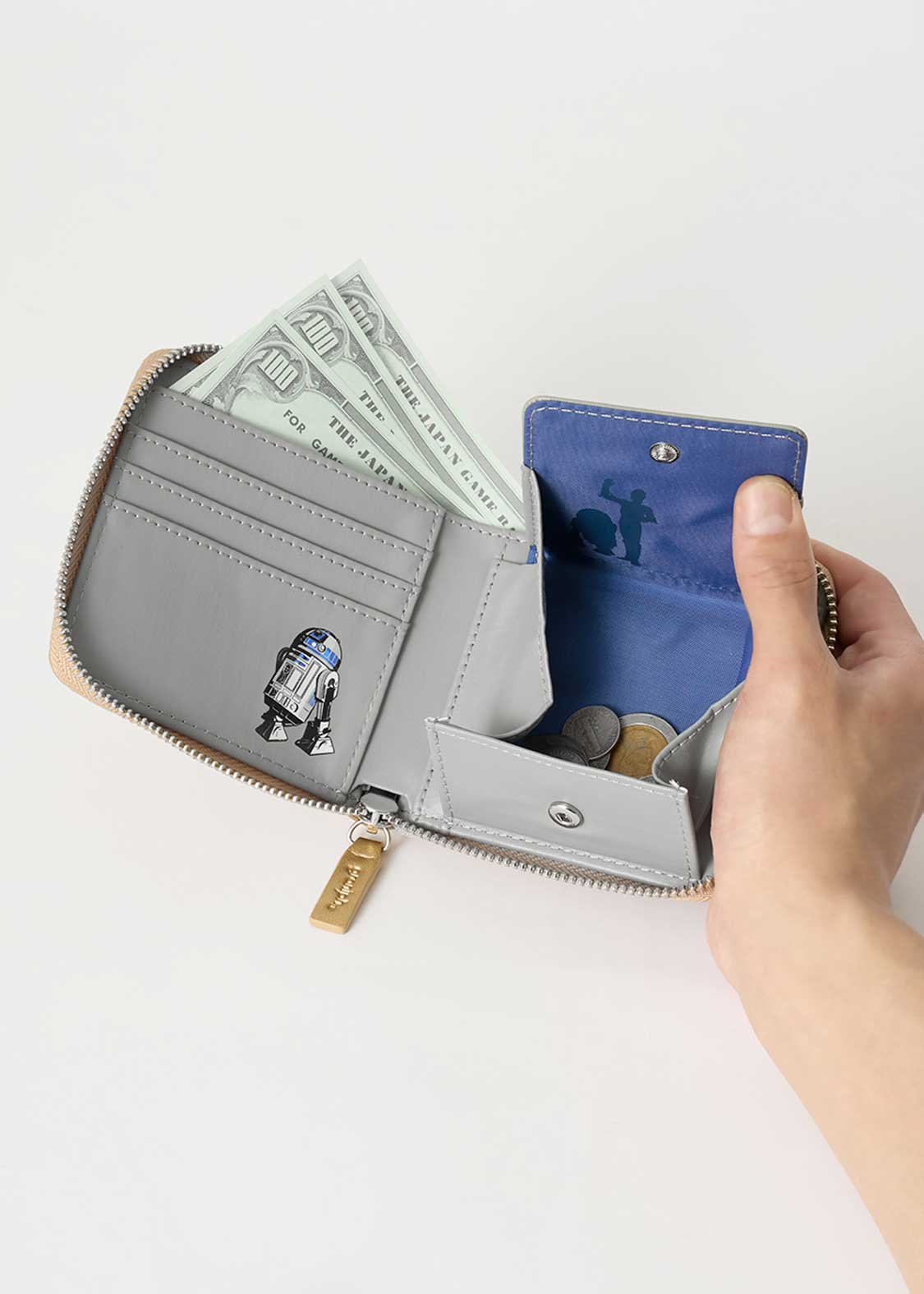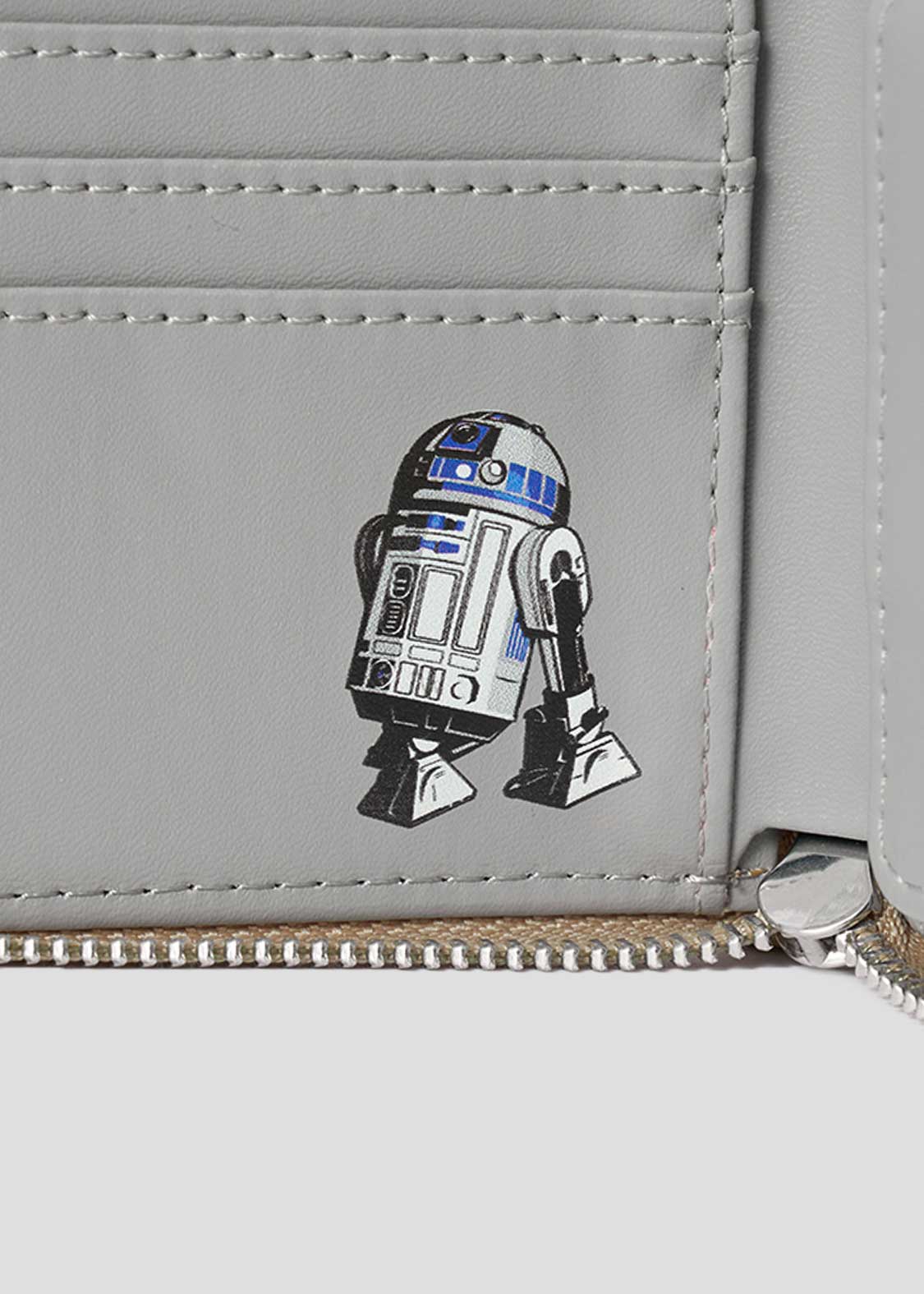 C-3POの顔をアップリケ刺繍で表現し、バックには『STAR WARS』のロゴをエンボス加工であしらったデザイン。内側のカードケースにはR2-D2を、コインケースにはC-3POとR2-D2のシルエットをプリントしています。それぞれをイメージした配色もポイントです。