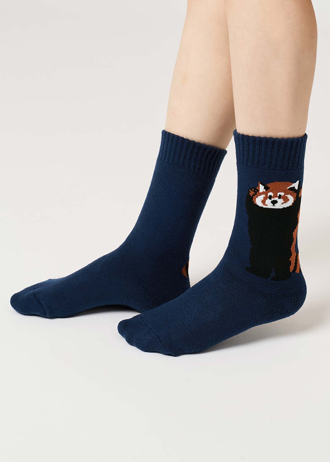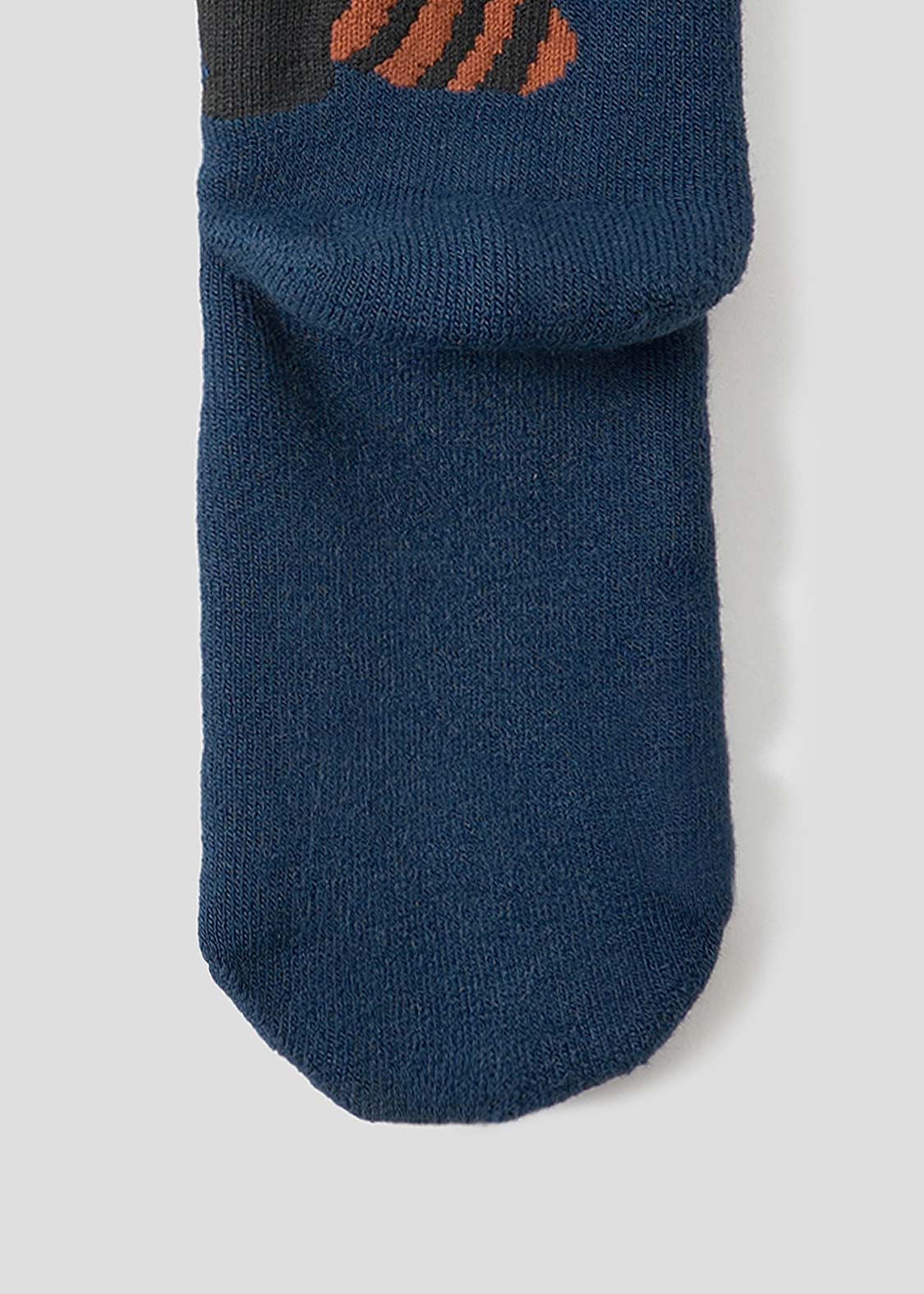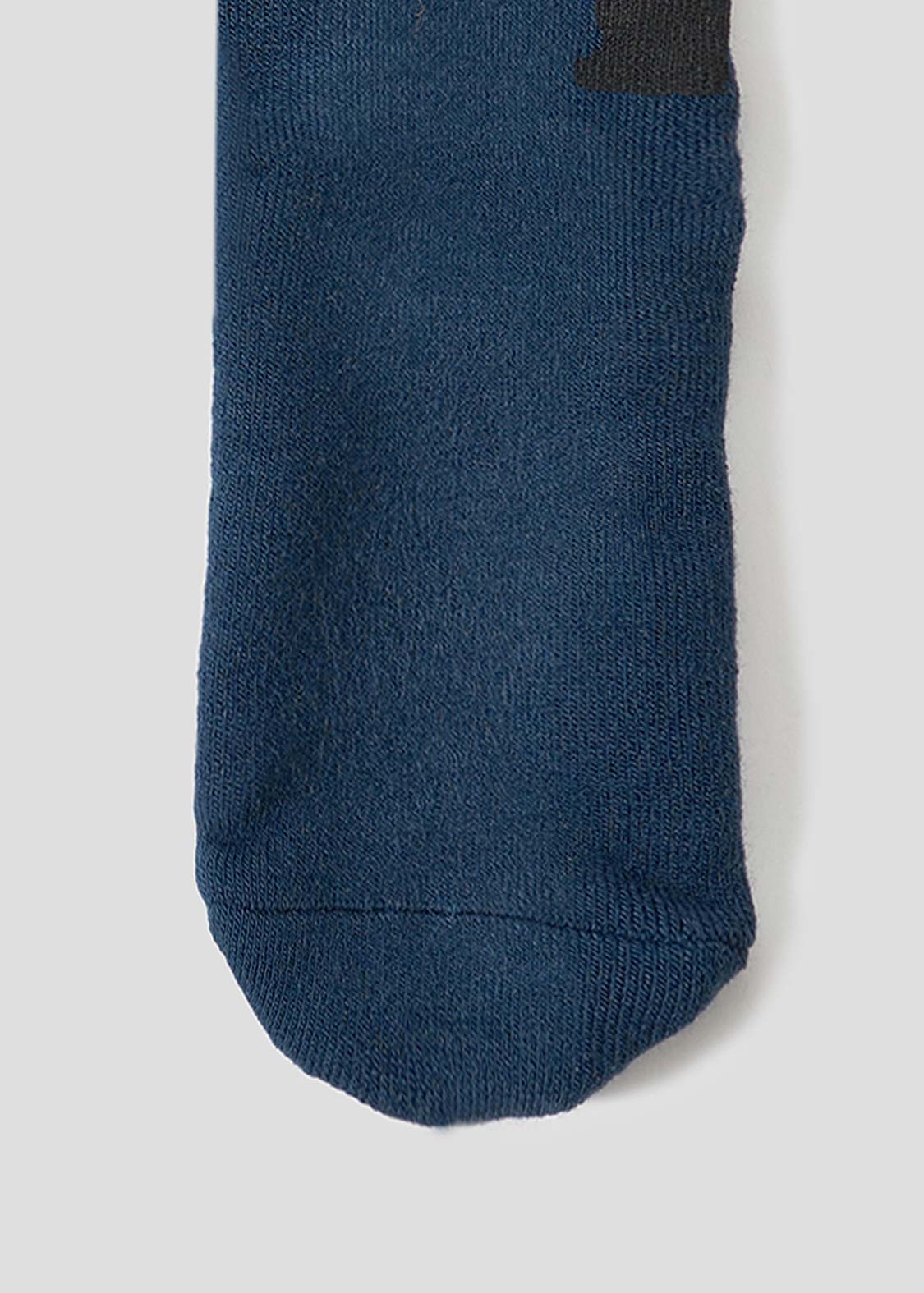 ・細かなグラフィックをジャカードで表現した、ロング丈のルームソックス。