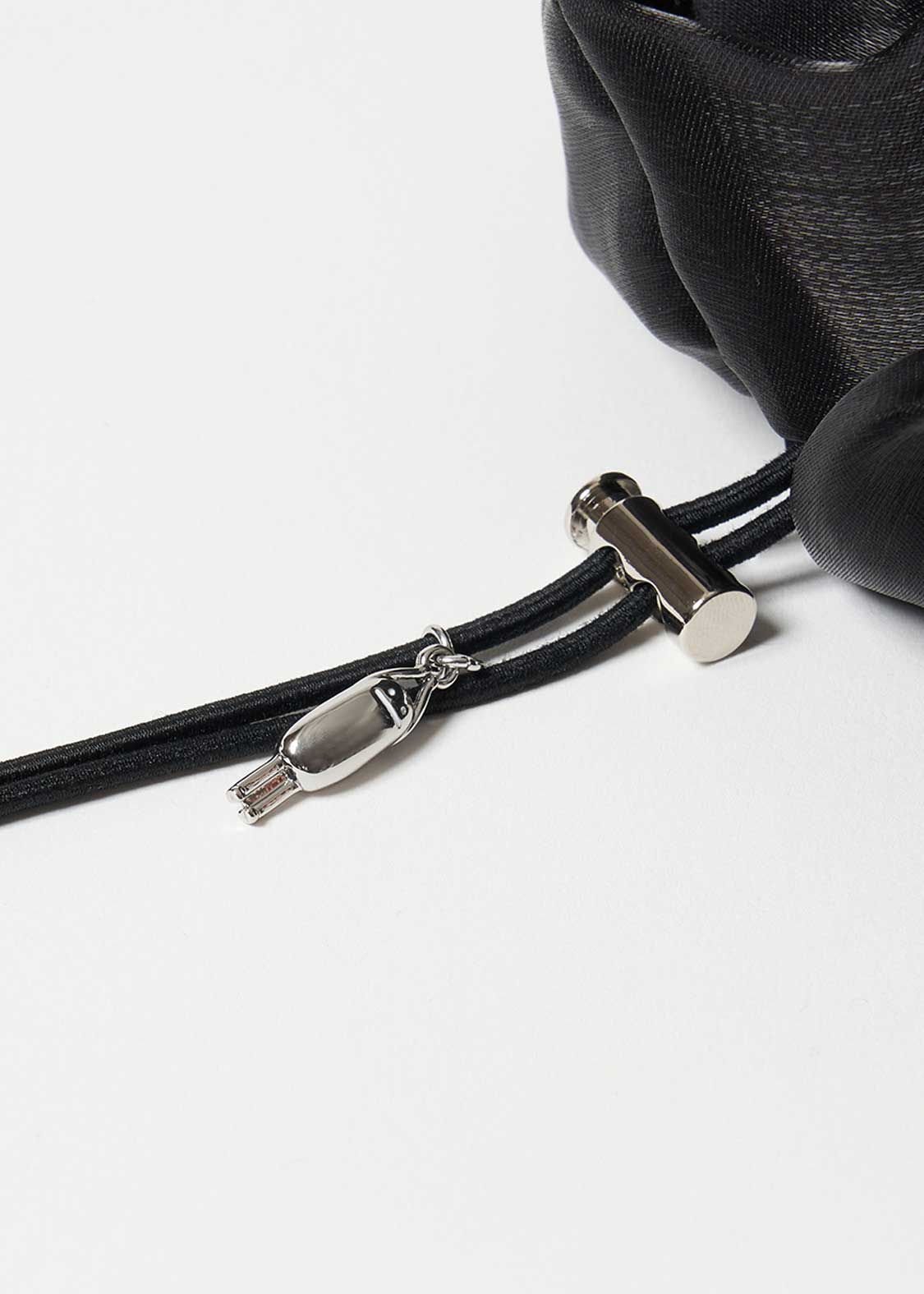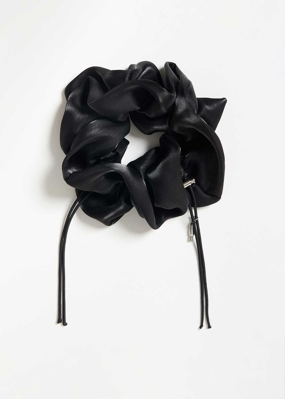 ・一度普通のヘアゴムで髪をまとめた後にドローコードシュシュを通し、長さ調整パーツとゴムを引っ張ってシュシュを絞って髪の毛に固定してください。