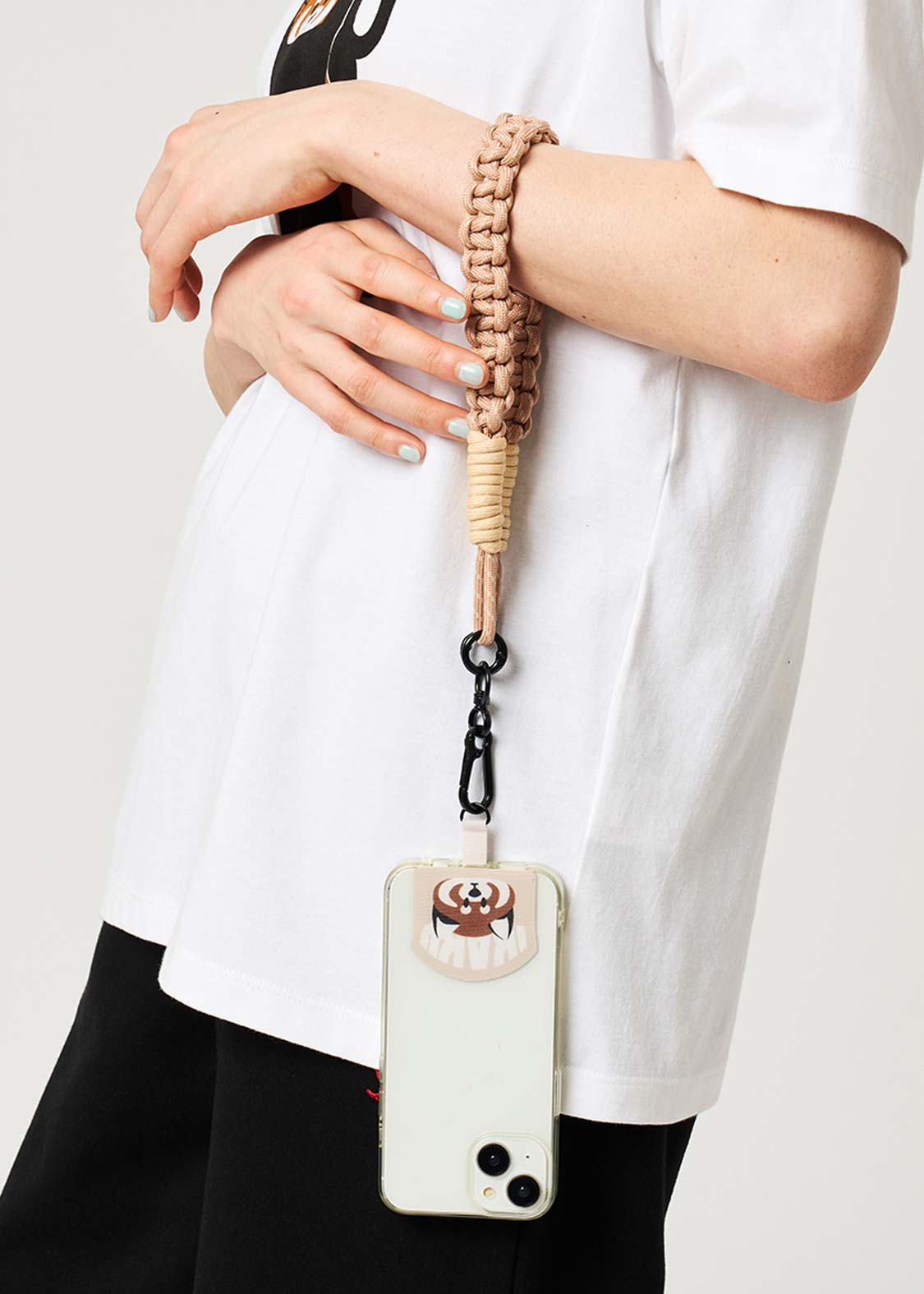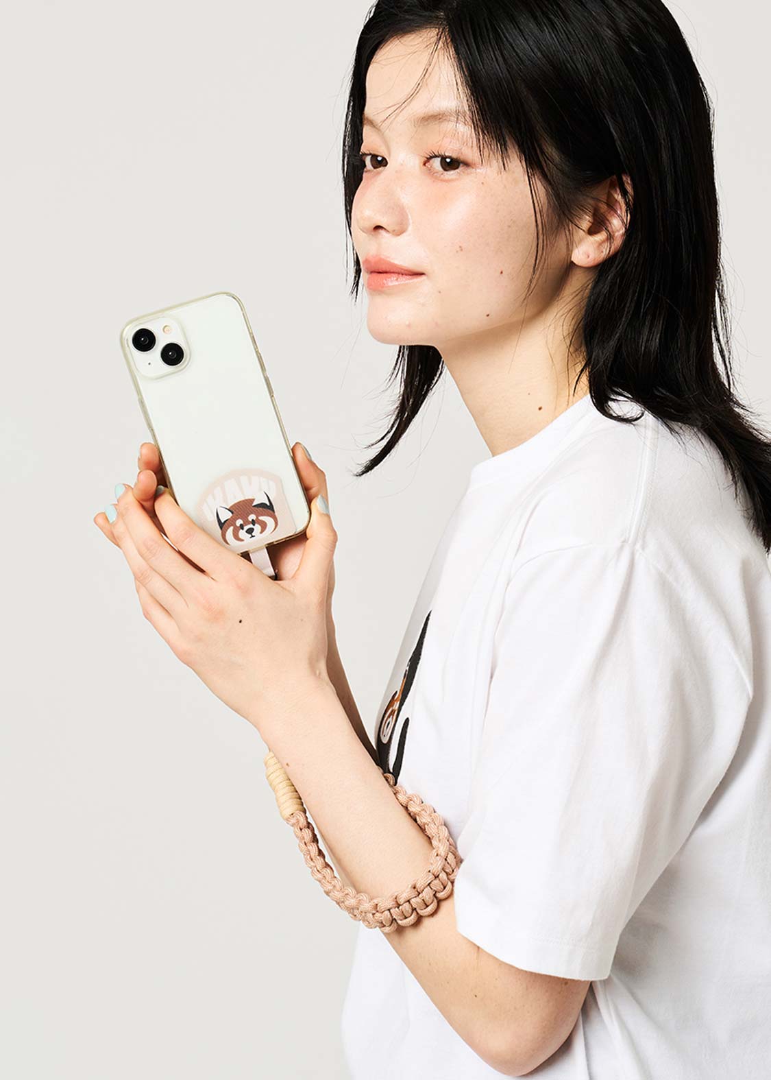 ・手首で短くスマートフォンを支えるハンドストラップ。