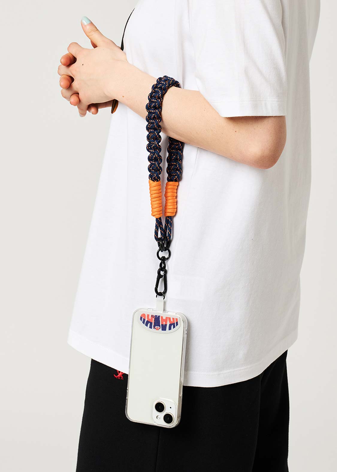 ・手首で短くスマートフォンを支えるハンドストラップ。
