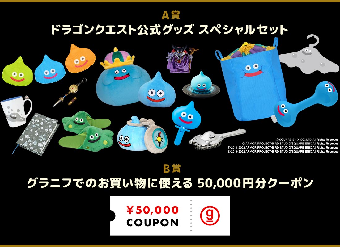 ※グラニフ公式オンラインストアで新規に会員登録をした方、もしくはすでに会員の方で、『DQ+g第1弾〜第4弾のアイテムいずれか』を、一つ以上『お気に入り登録』した方が対象です。応募条件を満たさなくなった場合は、応募は無効となります。