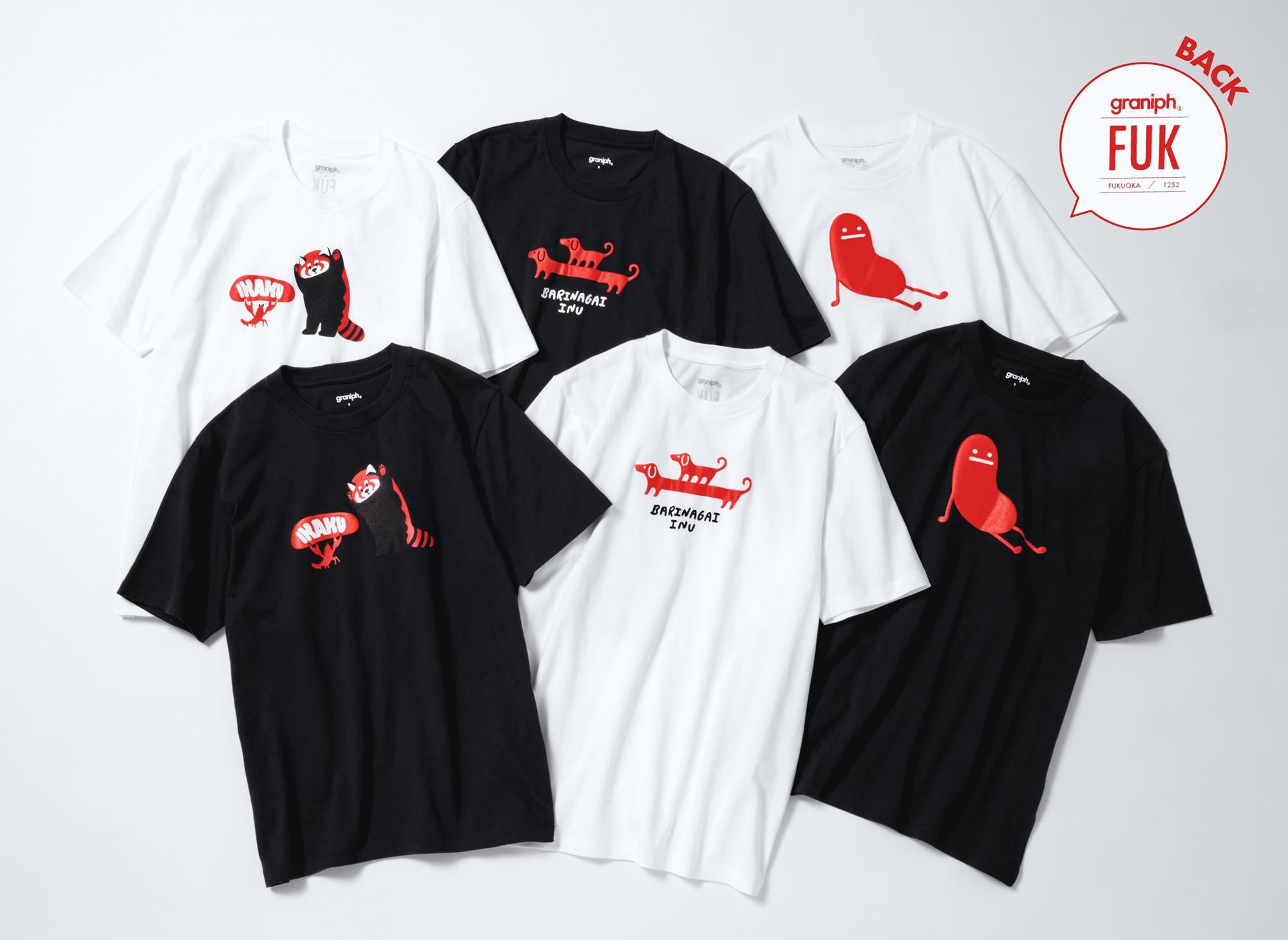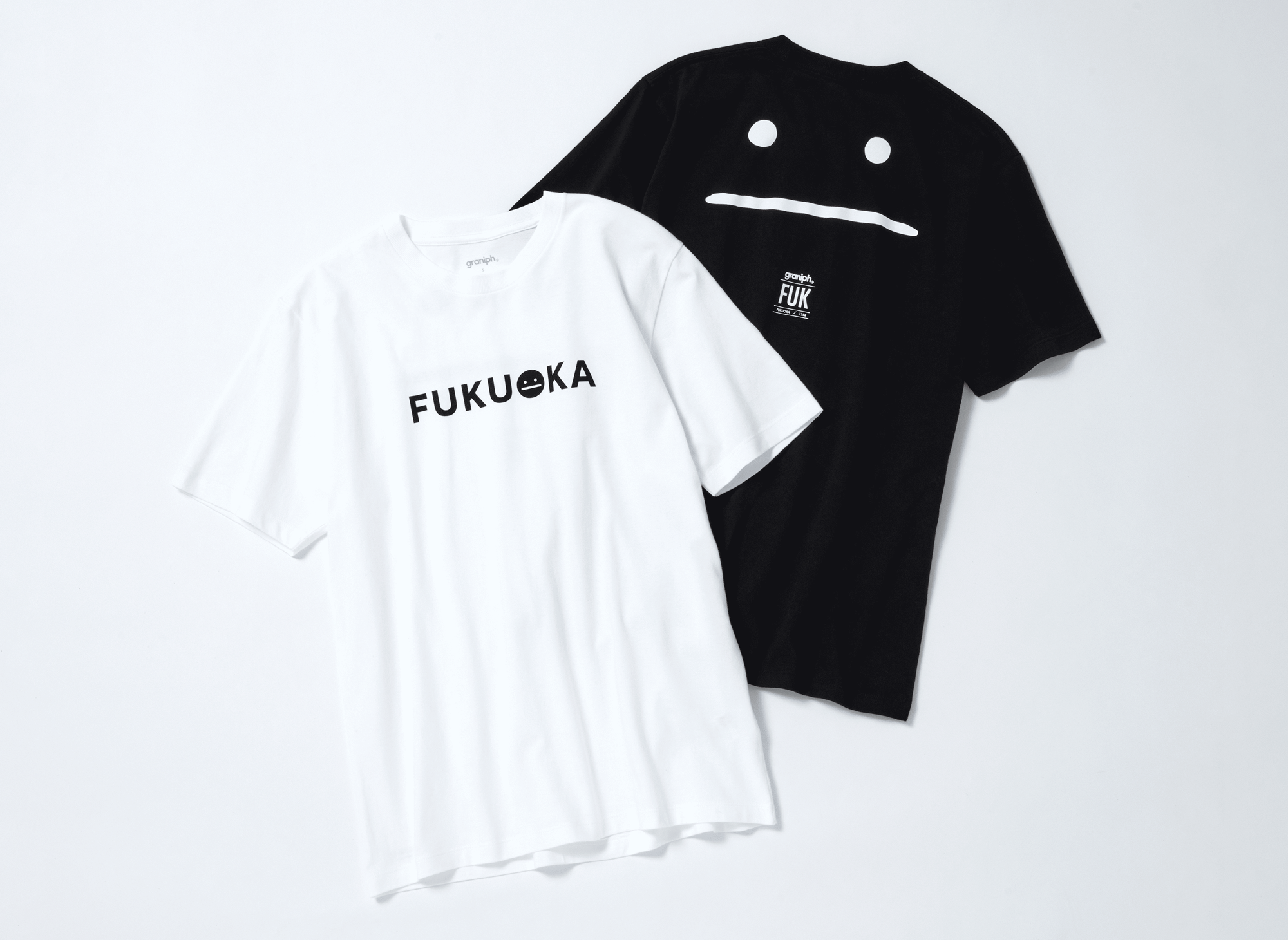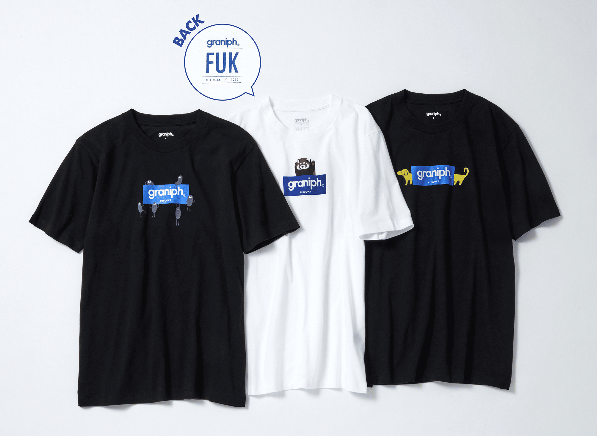 福岡らしいモチーフや色、方言をあしらった、店舗限定商品のラインナップ。Tシャツのバックスタイルには、福岡空港をあらわす空港コードやグラニフの店舗番号をあしらい、より限定感のあるデザインに。