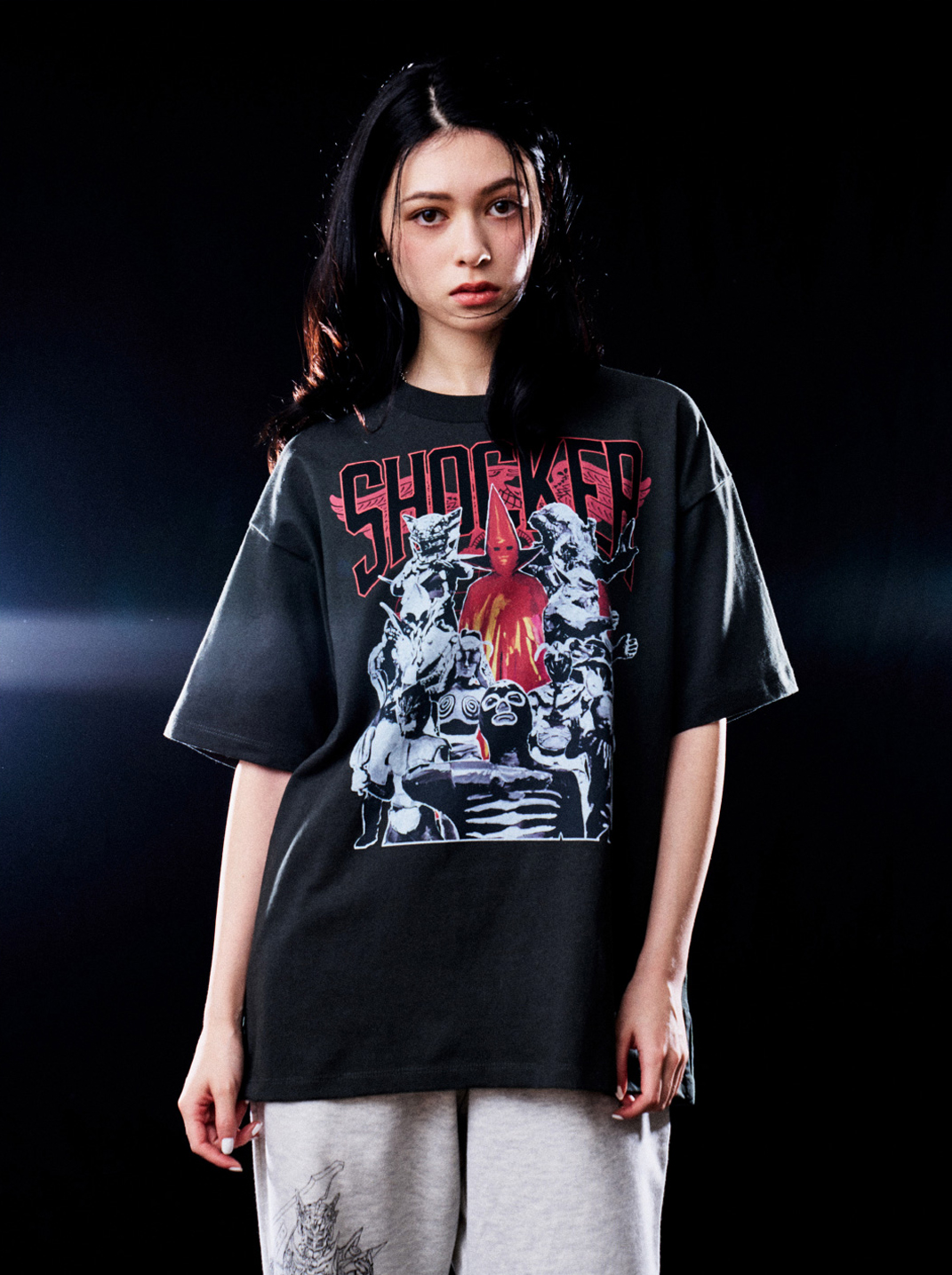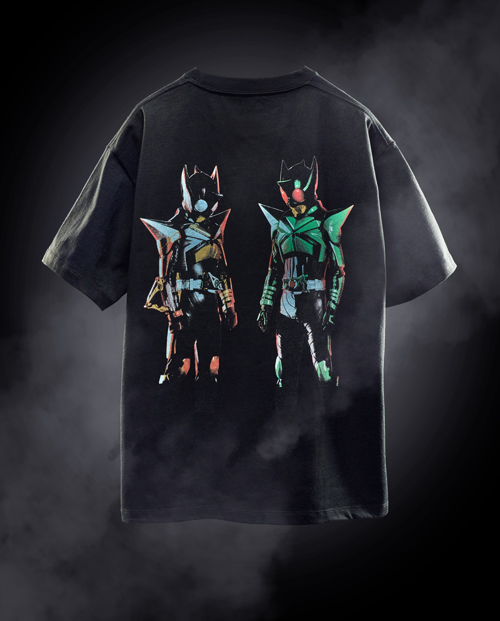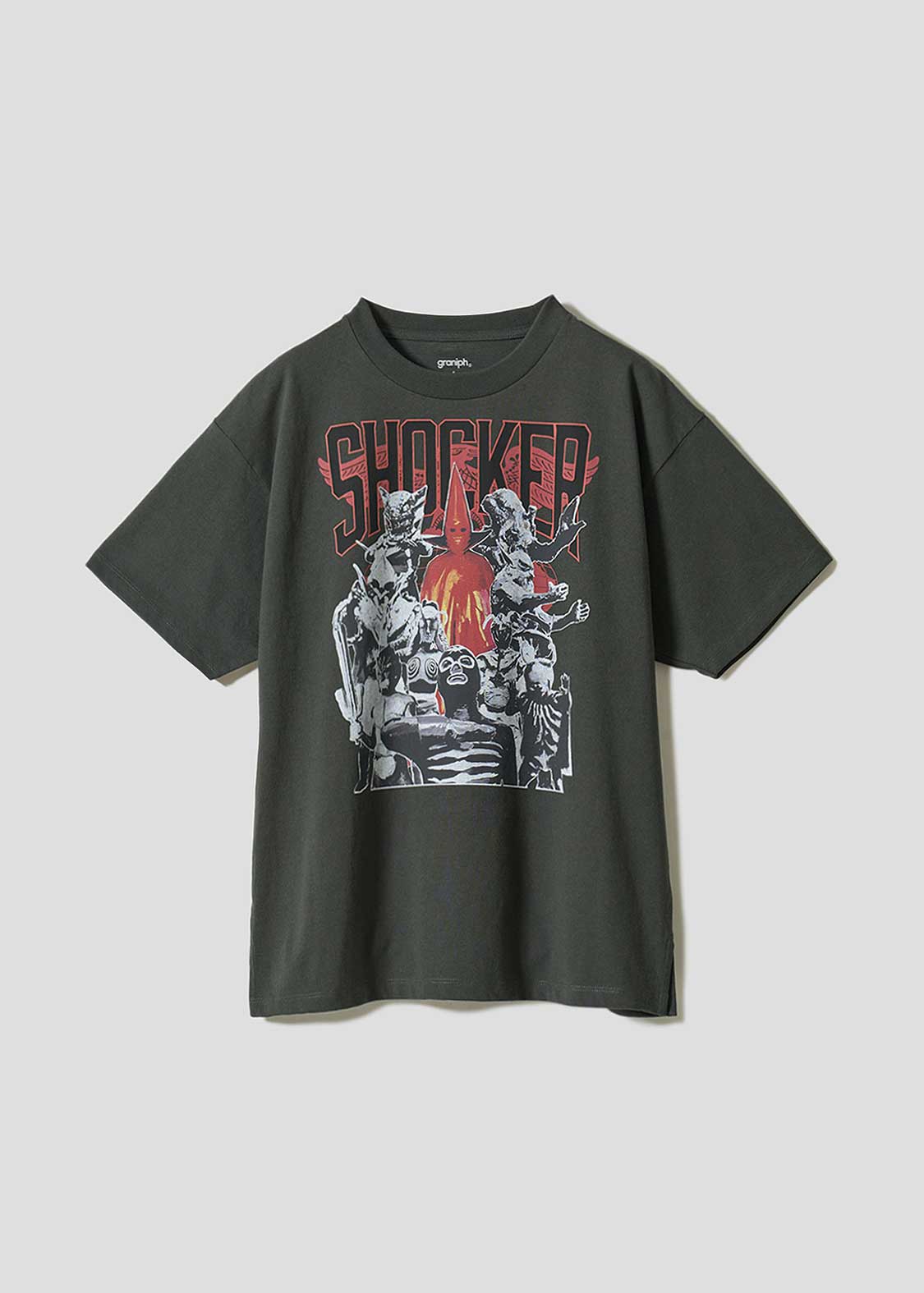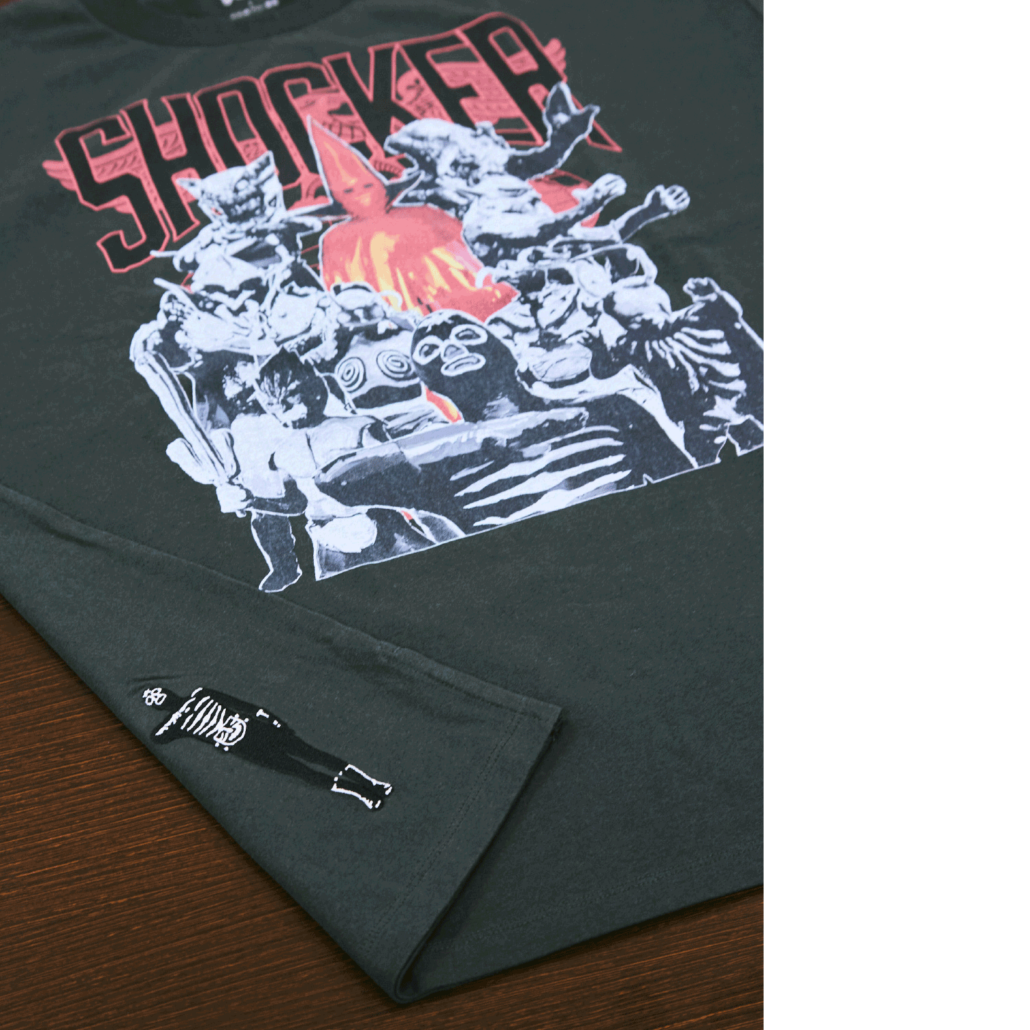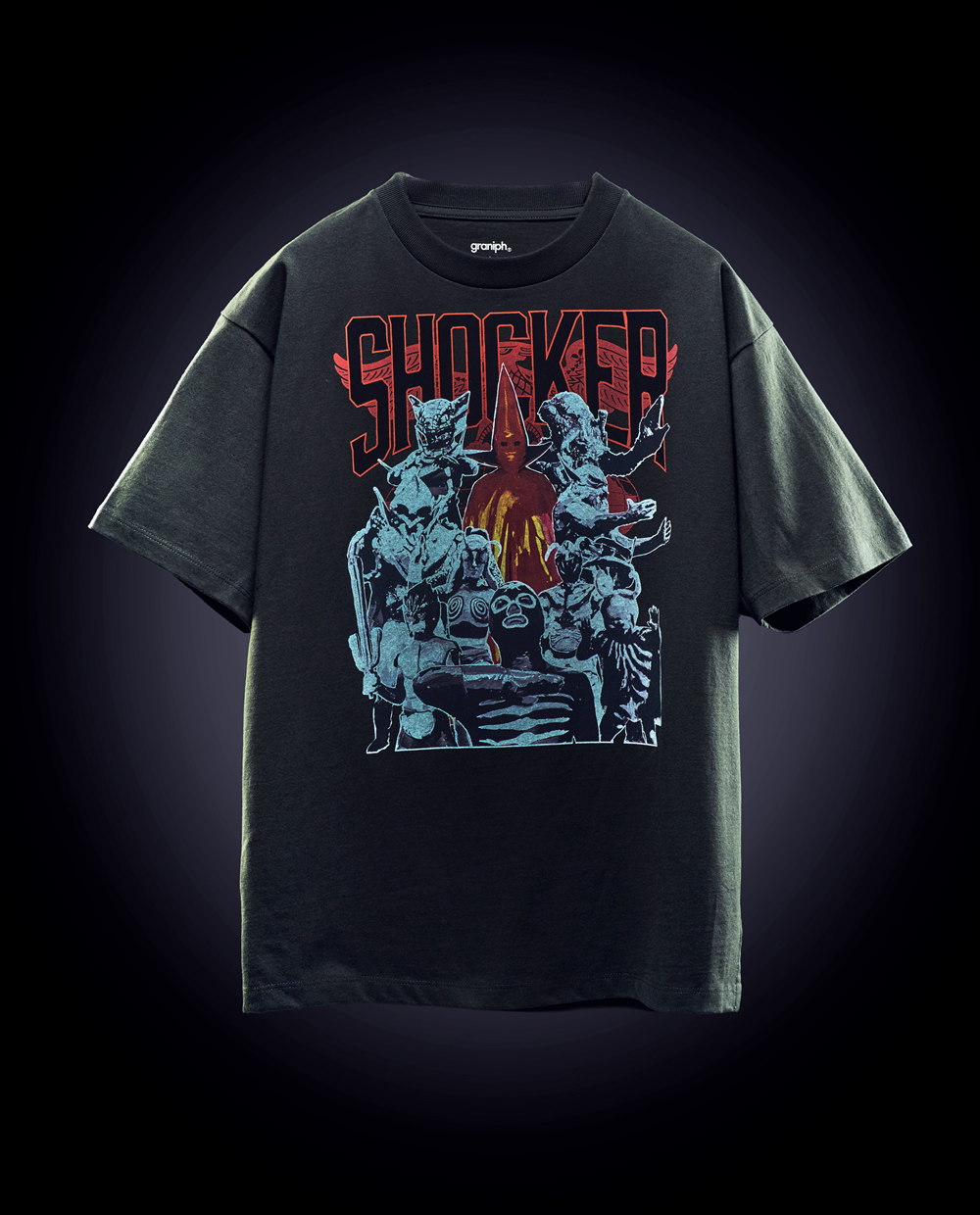 石川悪の秘密結社、ショッカーのビッグシルエットTシャツです。赤い三角のマスク姿のゲルショッカー首領を筆頭に、ヒルカメレオン、狼男、かまきり男、蜘蛛男、ガラガランダ、イカデビル、蜂女、サボテグロン、ショッカーの戦闘員の集合デザインをプリントしました。ちょっとプロレス感のあるイメージです。バックにもショッカーの戦闘員を刺繍しています。
