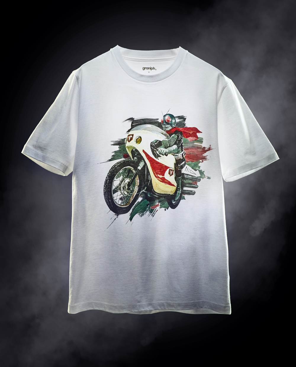 石川初代仮面ライダーである「仮面ライダー1号」がサイクロン号にまたがり、風を切って走る姿がかっこいいTシャツです。