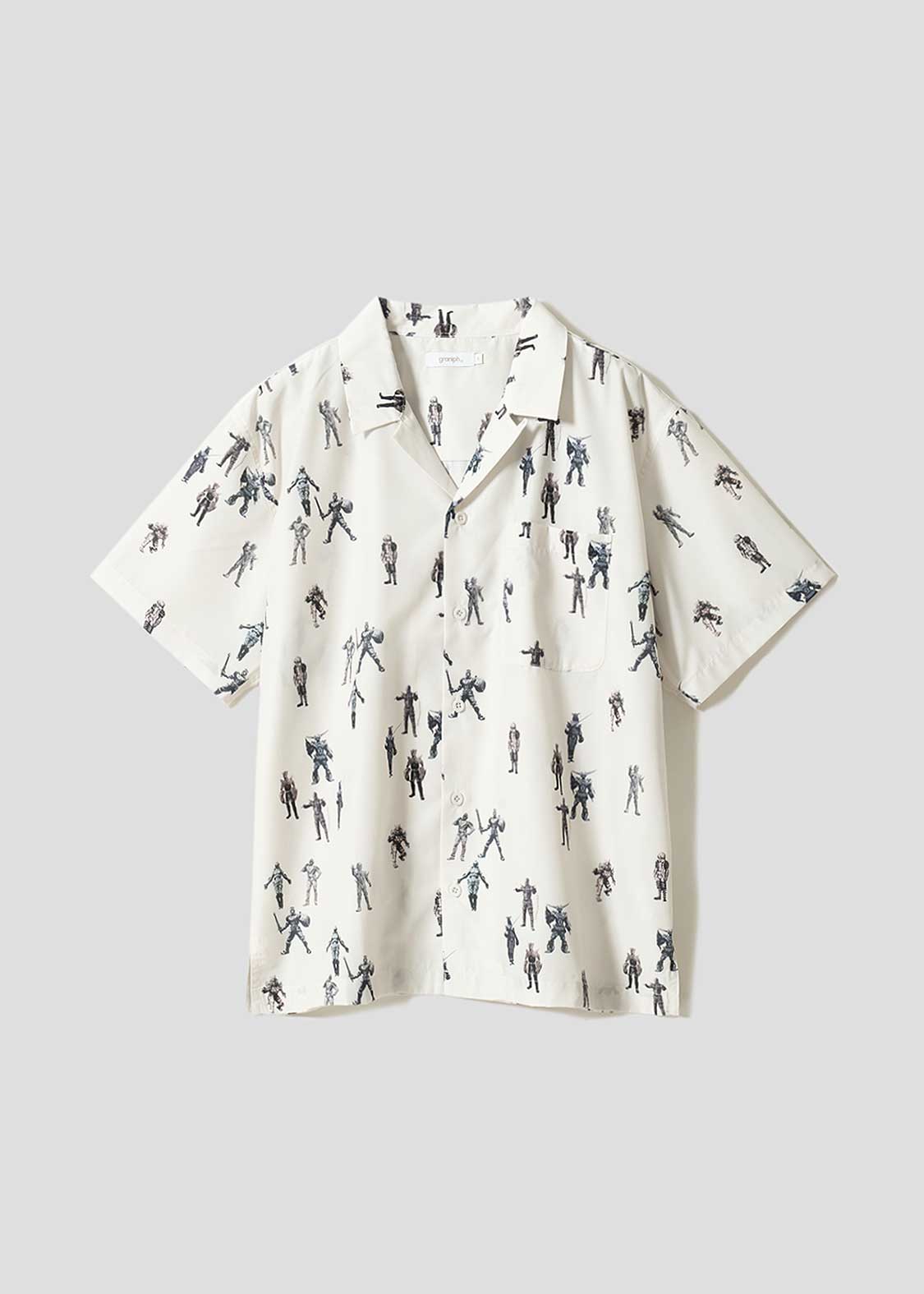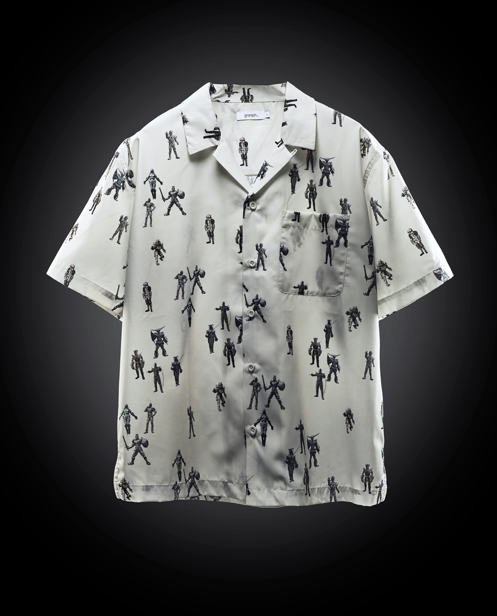 石川 続いては平成の4作目、2003年放送の『仮面ライダー555(ファイズ)』です。一度命を失ってから覚醒した人類の進化形態「オルフェノク」の半袖シャツを作りました。重要な役どころの10体を総柄パターンにしています。『仮面ライダーゼッツ』の敵はカラフルな印象ですが、オルフェノクはグレーっぽい色味が多く、それをそのまま活かしています。