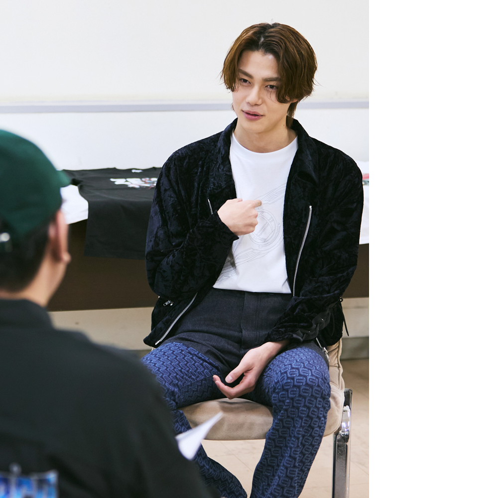 今井かっこいいですね。シルエットもいいので、今日ここに来て最初に目がいきました。僕、スウェットパンツが大好きなので、これは着たいです。でも、ヒーロー役なのに敵役のものを着てもいいのかな…?(苦笑)