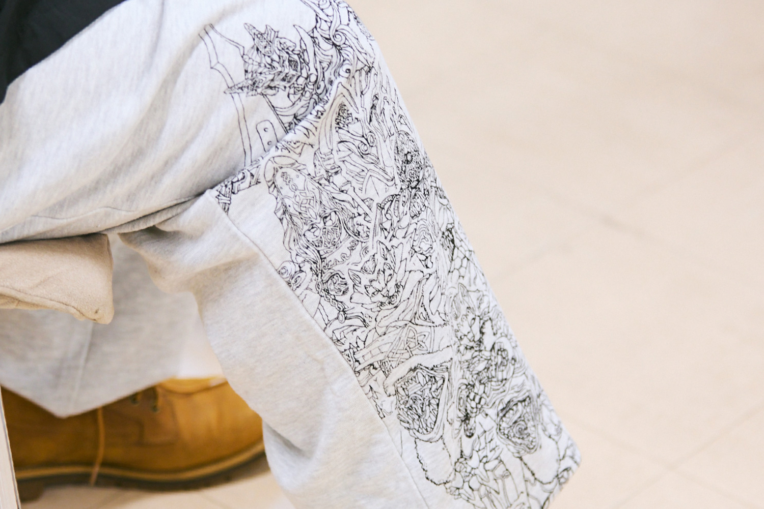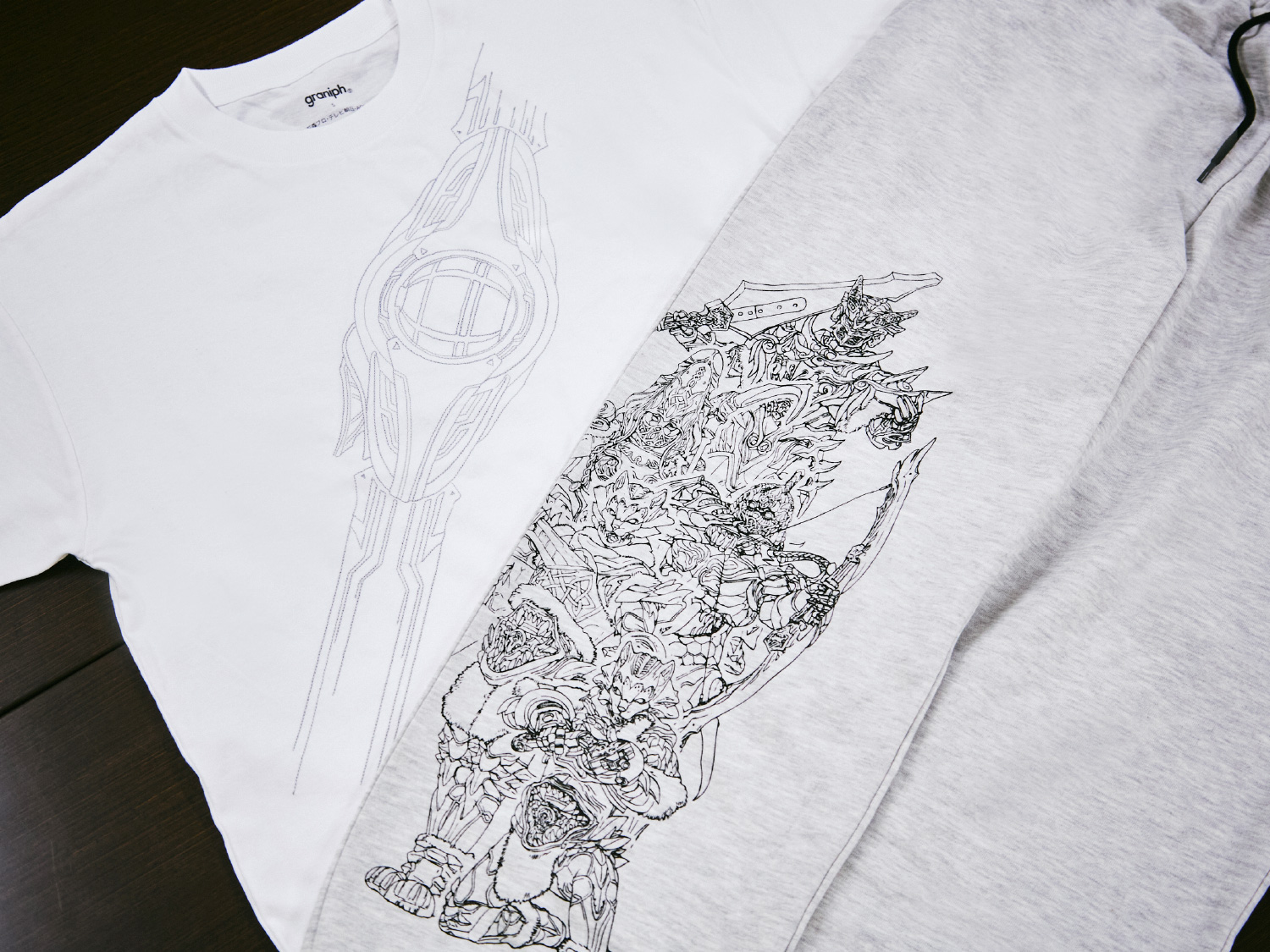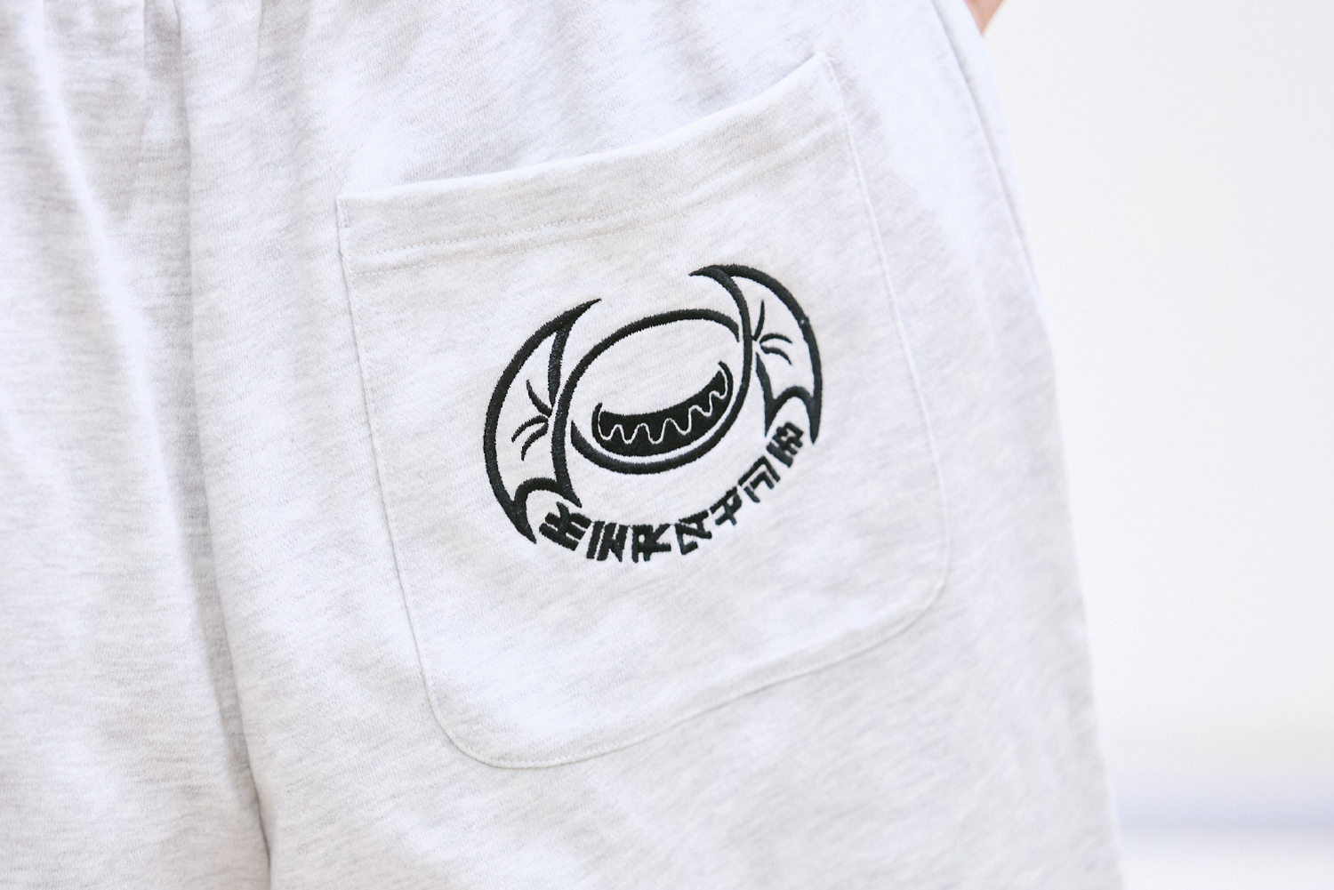 石川『仮面ライダーガヴ』の敵組織、ストマック家のスウェットパンツです。怪人態のかっこよさも紹介したいと思い、右足側に長男ランゴ、長女グロッタ、次男ニエルブ、次女シータ、三男ジープのグラニュート態を線画プリントで表現しました。後ろのポケットには、ストマック家の家紋を刺繍しています。