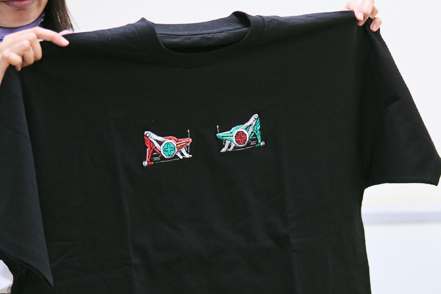 石川 どうやったら『仮面ライダー555』だとわかるか、どうやったら着やすいものになるか考えて、このロゴと蝶のデザインになりました。作品を観ていた人にはわかるうれしさがあると思います。