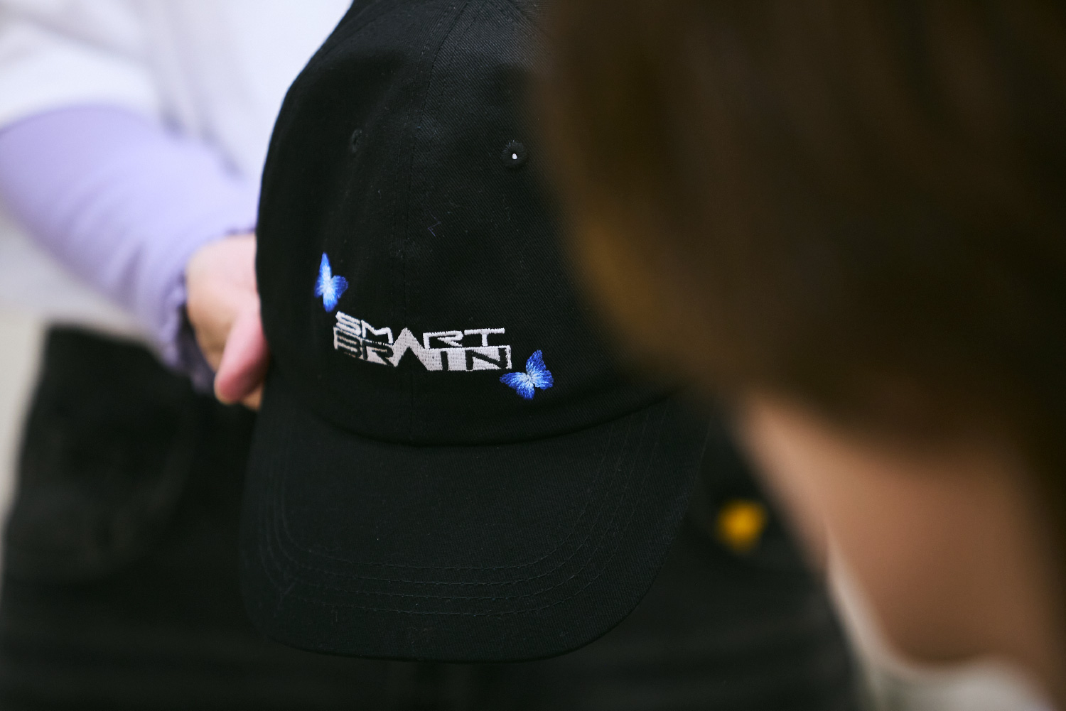 石川『仮面ライダー555』に出てくる巨大企業「SMART BRAIN」の会社ロゴとCMに登場する青い蝶を、刺繍で表現したデザインです。