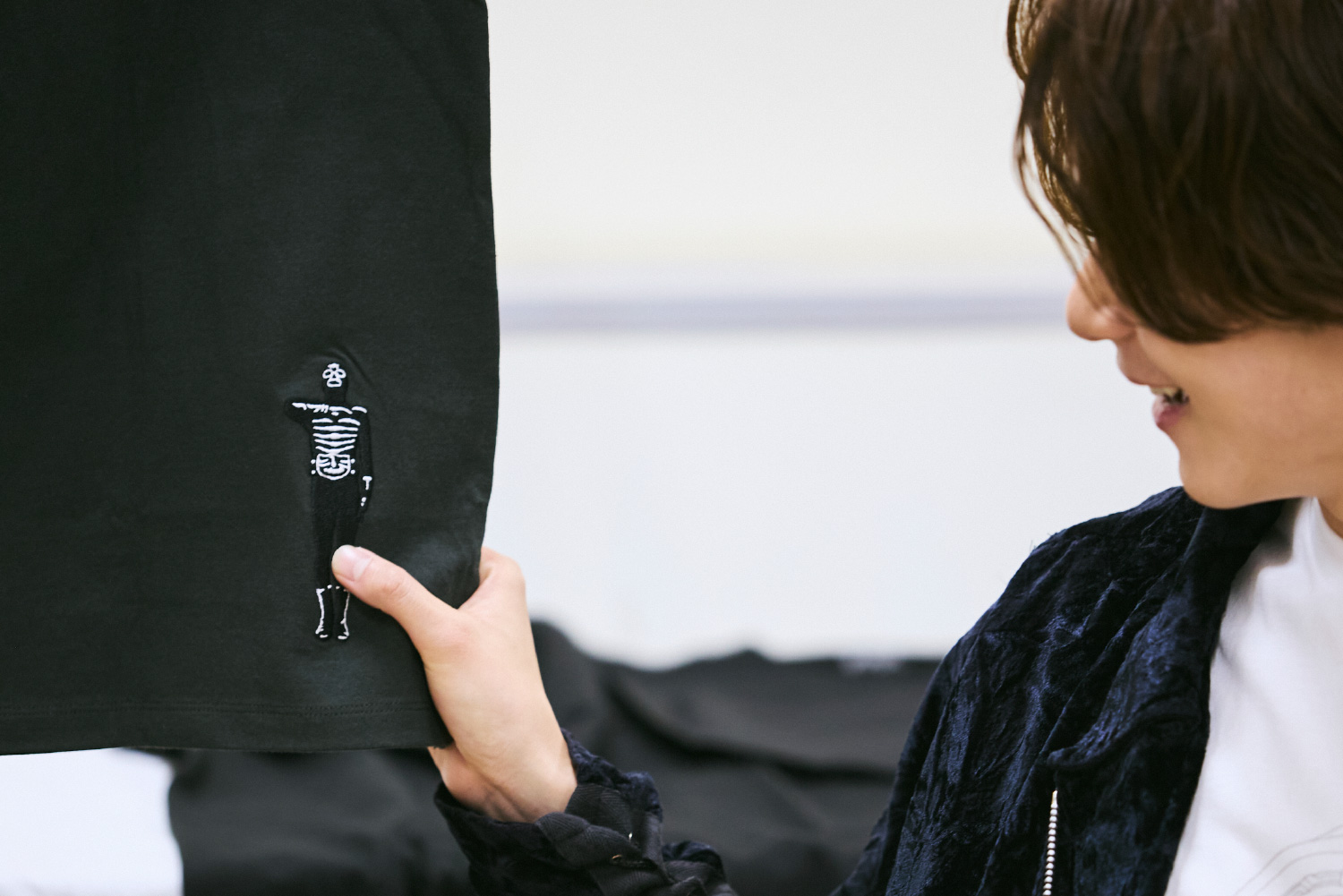 石川 こちらは今日、今井さんに着ていただいているビッグシルエットTシャツです。ゼッツドライバーを刺繍で表現しました。遠目で見るとほぼ白Tシャツに見えるので、大人でもさらっと着ていただけるシャツです。着た印象はいかがですか?