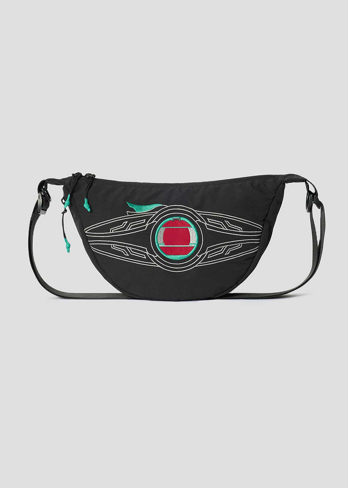 斜めがけにするとゼッツドライバーと同じイメージになるデザインです。 トリガーとカプセムソケット部分には色をつけていて、特にカプセムソケットは別でワッペンの布を置いて緑の刺繍で囲い、まわりと違う質感にしています。ジッパーもトリガーの色味を意識した色になっています。